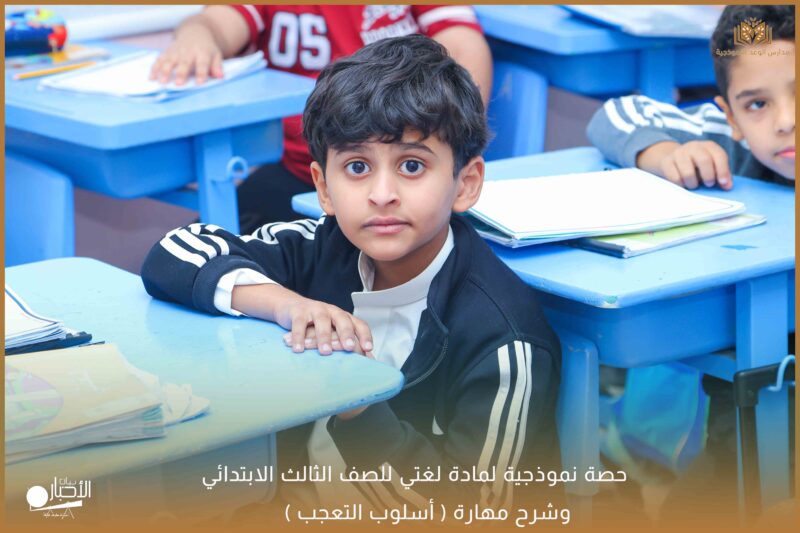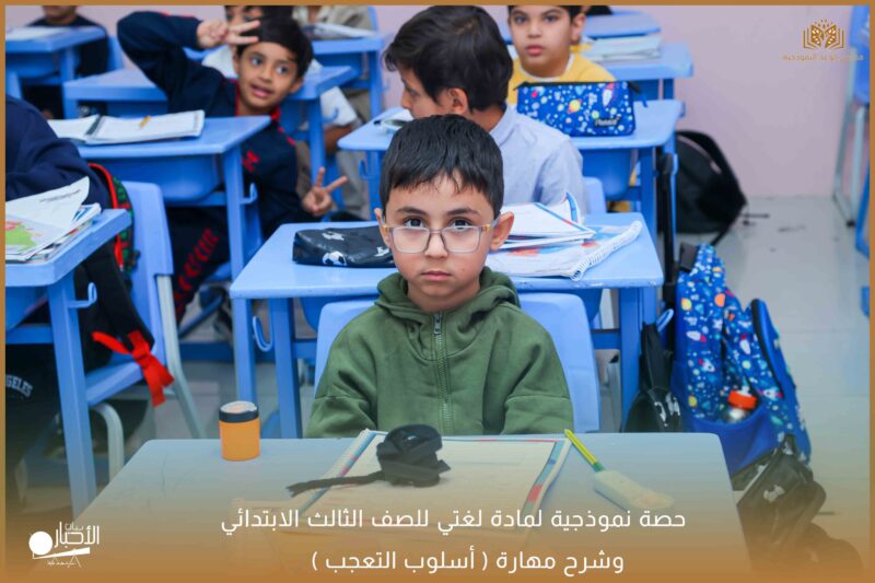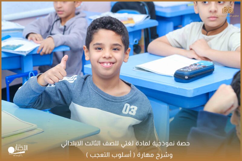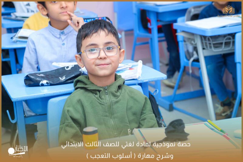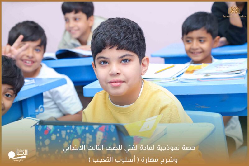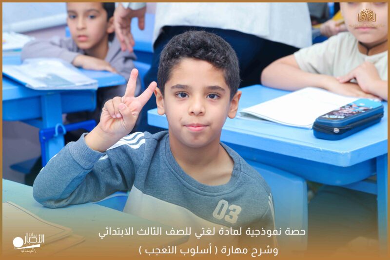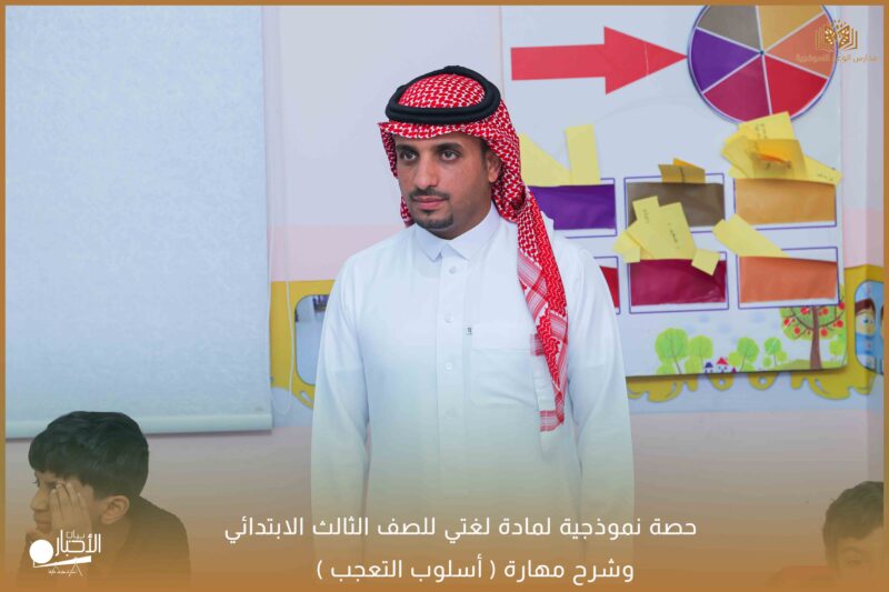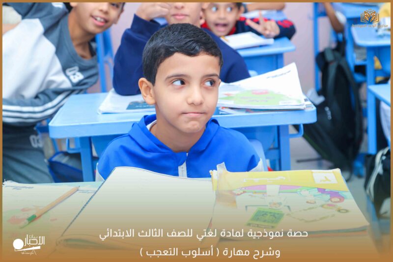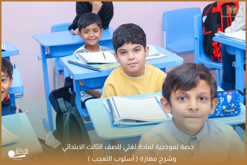 أقامت مدارس الوعد النموذجية حصة نموذجية لمادة لغتي للصف الثالث الابتدائي وشرح مهارة ( أسلوب التعجب ) حيث استخدم المعلم استراتيجيات التعلم في التدريس ومنها ( التعلم النشط – العصف الذهني – التعلم التعاوني ) حيث تفاعل الطلاب مع المعلم أثناء الدرس تفاعلًا رائعًا وذلك باستخدام وسائل تعليمية متنوعة واللوحات الشاملة ولوحات التعزيز ٠