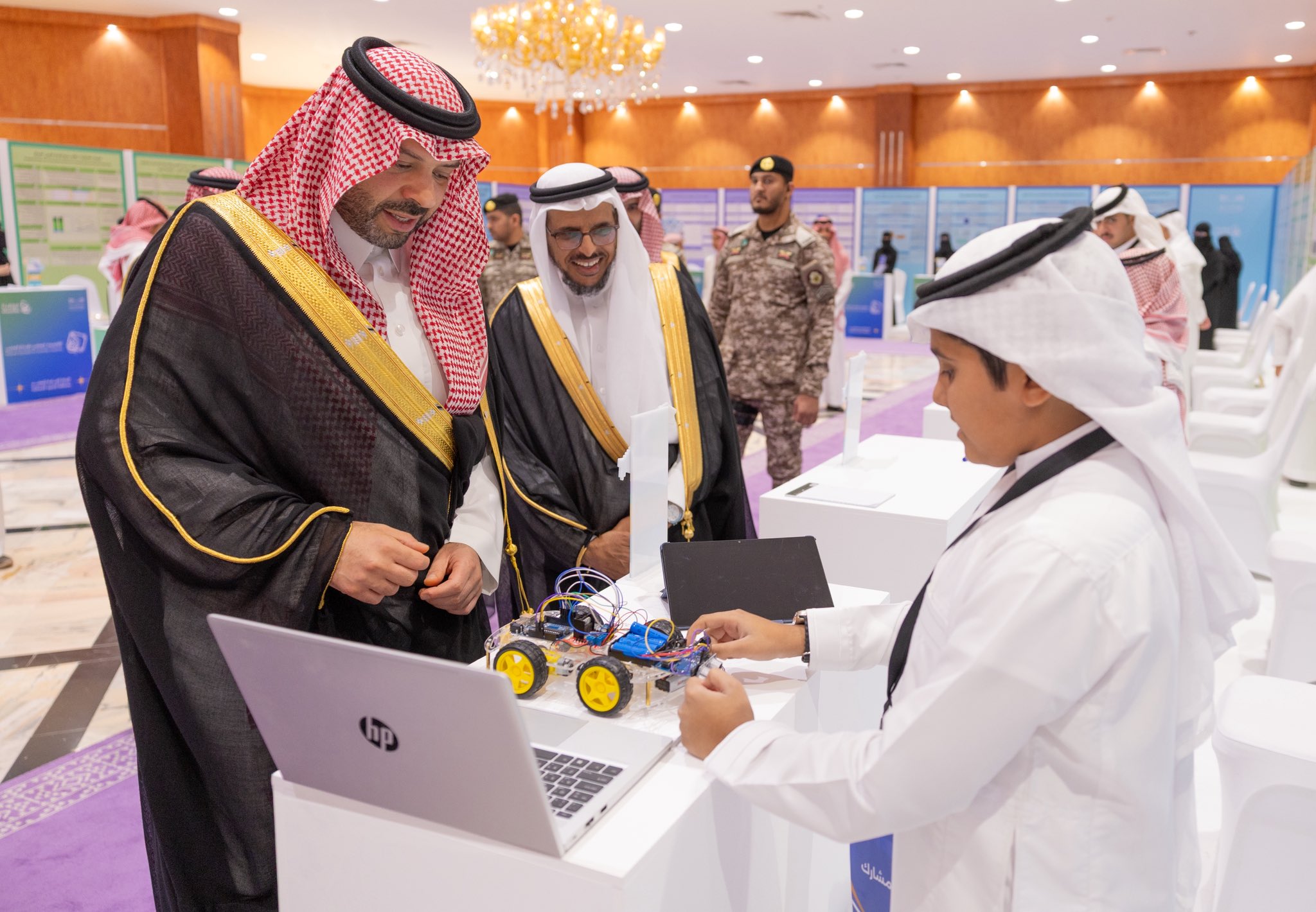 ودشّن سموه المعرض عبر جهاز لوحي إيذانًا بانطلاق فعالياته، ثم تجوّل في أجنحته، واستمع إلى شروحات الطلاب والطالبات حول مشروعاتهم الابتكارية والبحثية في مجالات العلوم والهندسة والطاقة والتقنية والبيئة.