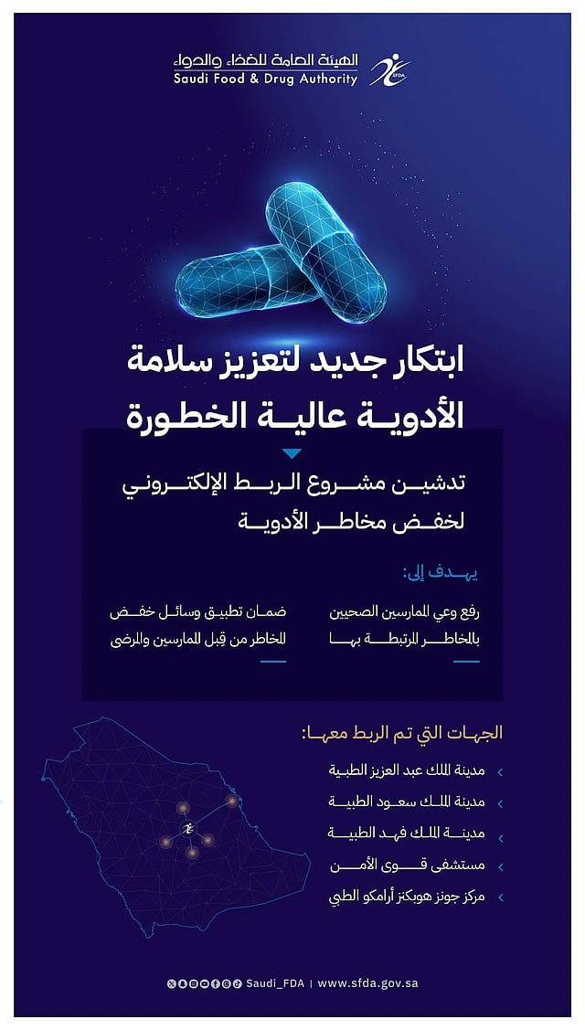 ويُنفَّذ المشروع بالشراكة مع عدد من الجهات الصحية، تشمل مدينة الملك فهد الطبية، ومدينة الملك سعود الطبية، ومستشفى قوى الأمن، ومدينة الملك عبدالعزيز الطبية، ومركز جونز هوبكنز أرامكو الطبي، ما يتيح للمستشفيات إمكانية تعزيز سلامة أدوية المرضى عبر إيصال وسائل خفض المخاطر بشكل مباشر وفعّال.