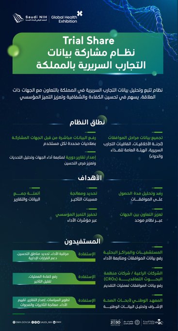 أعلن المعهد الوطني لأبحاث الصحة عن إطلاق Trial Share نظام مشاركة بيانات التجارب السريرية بالمملكة، وذلك ضمن مشاركته في ملتقى الصحة العالمي 2025، ليسهم في تتبع وتحليل بيانات التجارب السريرية بالتعاون مع الجهات ذات العلاقة.