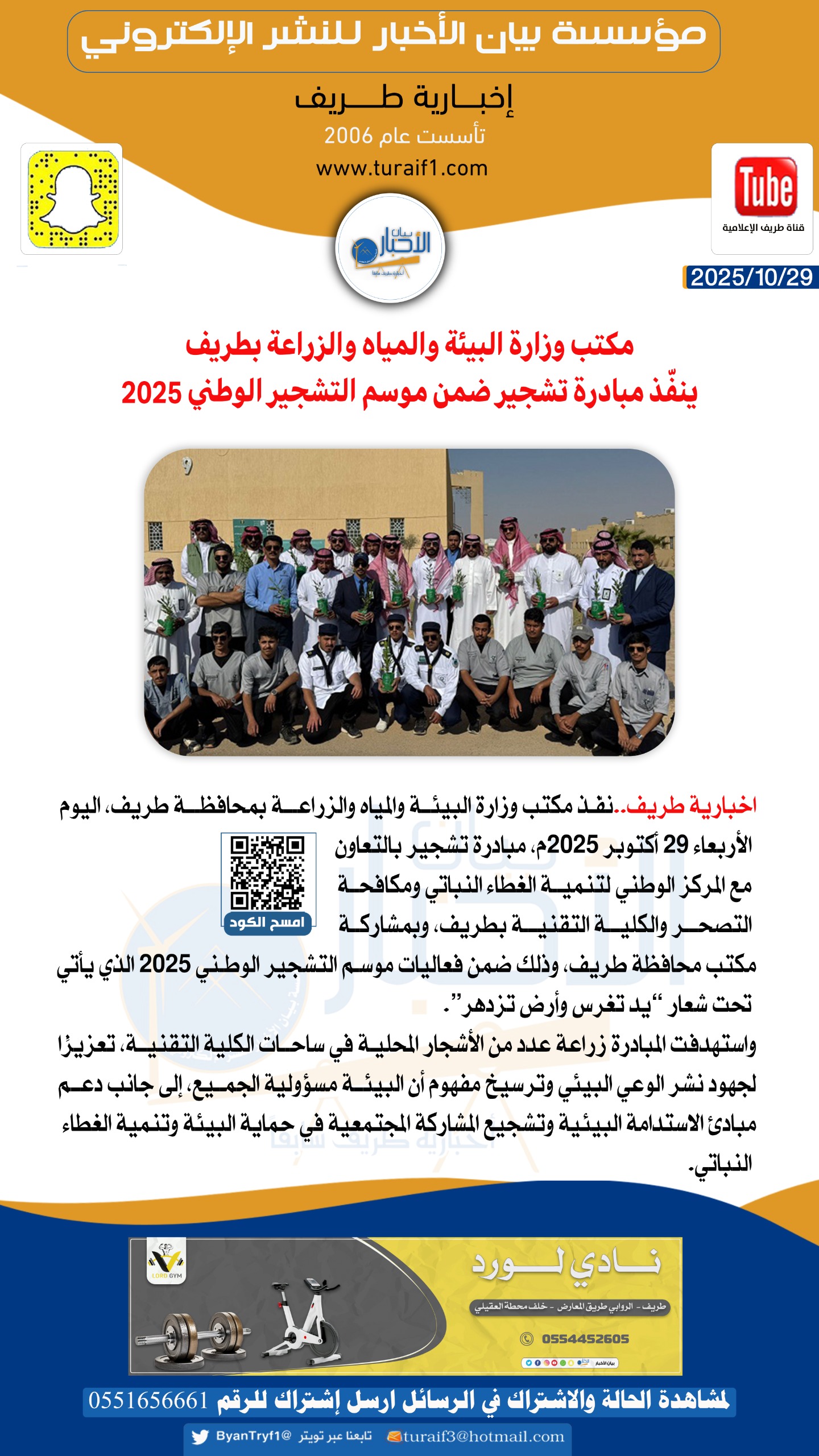نفّذ مكتب وزارة البيئة والمياه والزراعة بمحافظة طريف، اليوم الأربعاء 29 أكتوبر 2025م، مبادرة تشجير بالتعاون مع المركز الوطني لتنمية الغطاء النباتي ومكافحة التصحر والكلية التقنية بطريف، وبمشاركة مكتب محافظة طريف، وذلك ضمن فعاليات موسم التشجير الوطني 2025 الذي يأتي تحت شعار “يد تغرس وأرض تزدهر”.