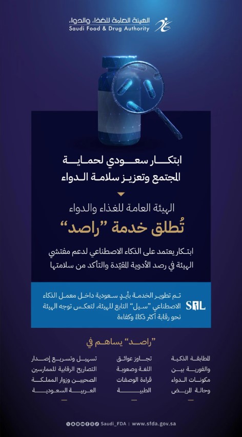 وتعد خدمة “راصد” أحد مخرجات معمل الذكاء الاصطناعي “سيل” الذي أطلقته الهيئة في فبراير الماضي؛ بوصفه منصة لتطوير وتبنّي الحلول التقنية المبنية على الذكاء الاصطناعي؛ بهدف تعزيز الابتكار ورفع كفاءة العمليات الرقابية والتشغيلية في الهيئة، كما يسهم في توسيع الشراكات مع الجهات الحكومية والشركات التقنية المتخصصة لتبادل المعرفة وتطوير القدرات في هذا المجال، تماشيًا مع مستهدفات برنامج تحول القطاع الصحي أحد برامج رؤية المملكة 2030.