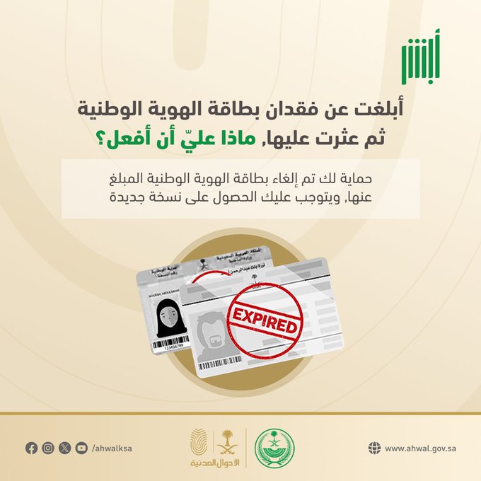 ونوهت الأحوال المدنية، عبر صفحتها بموقع إكس، إلى أنه في حال الإبلاغ عن فقدان بطاقة الهوية الوطنية ثم العثور عليها يتم إلغاء بطاقة الهوية الوطنية المبلغ عنها حماية للمبلغ، مؤكدة أنه يتوجب الحصول على نسخة جديدة.