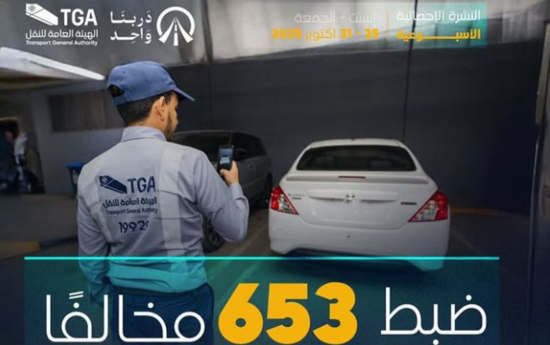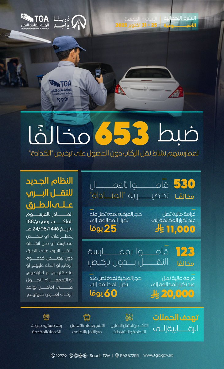 ضبطت الهيئة العامة للنقل 653 مخالفًا خلال الفترة من 25 إلى 31 أكتوبر 2025؛ لممارستهم نشاط نقل الركاب دون الحصول على ترخيص “الكدادة”، وذلك ضمن حملاتها الرقابية المستمرة في مختلف المناطق.
