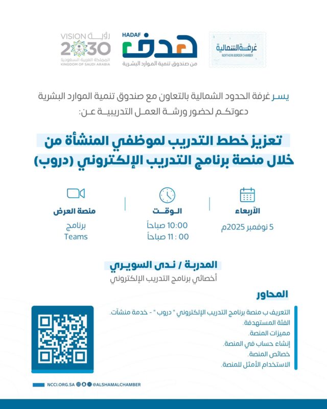 تنظم غرفة الحدود الشمالية بالتعاون مع صندوق تنمية الموارد البشرية “هدف” ورشة عمل تدريبية بعنوان “تعزيز خطط التدريب لموظفي المنشأة من خلال منصة التدريب الإلكتروني (دروب)”، وذلك يوم الأربعاء الموافق 5 نوفمبر 2025م، عبر منصة Teams من الساعة 10:00 إلى 11:00 صباحًا.