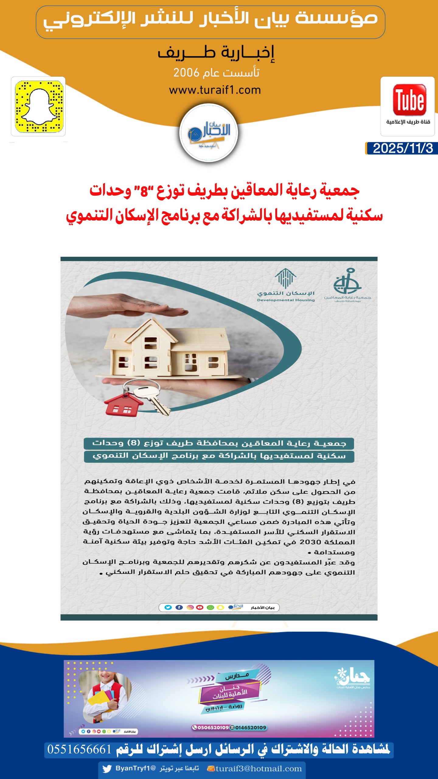 قامت جمعية رعاية المعاقين بمحافظة طريف بتوزيع (8) وحدات سكنية لمستفيديها، وذلك بالشراكة مع برنامج الإسكان التنموي التابع لوزارة الشؤون البلدية والقروية والإسكان، وفي إطار جهودها المستمرة لخدمة الأشخاص ذوي الإعاقة وتمكينهم من الحصول على سكن ملائم.