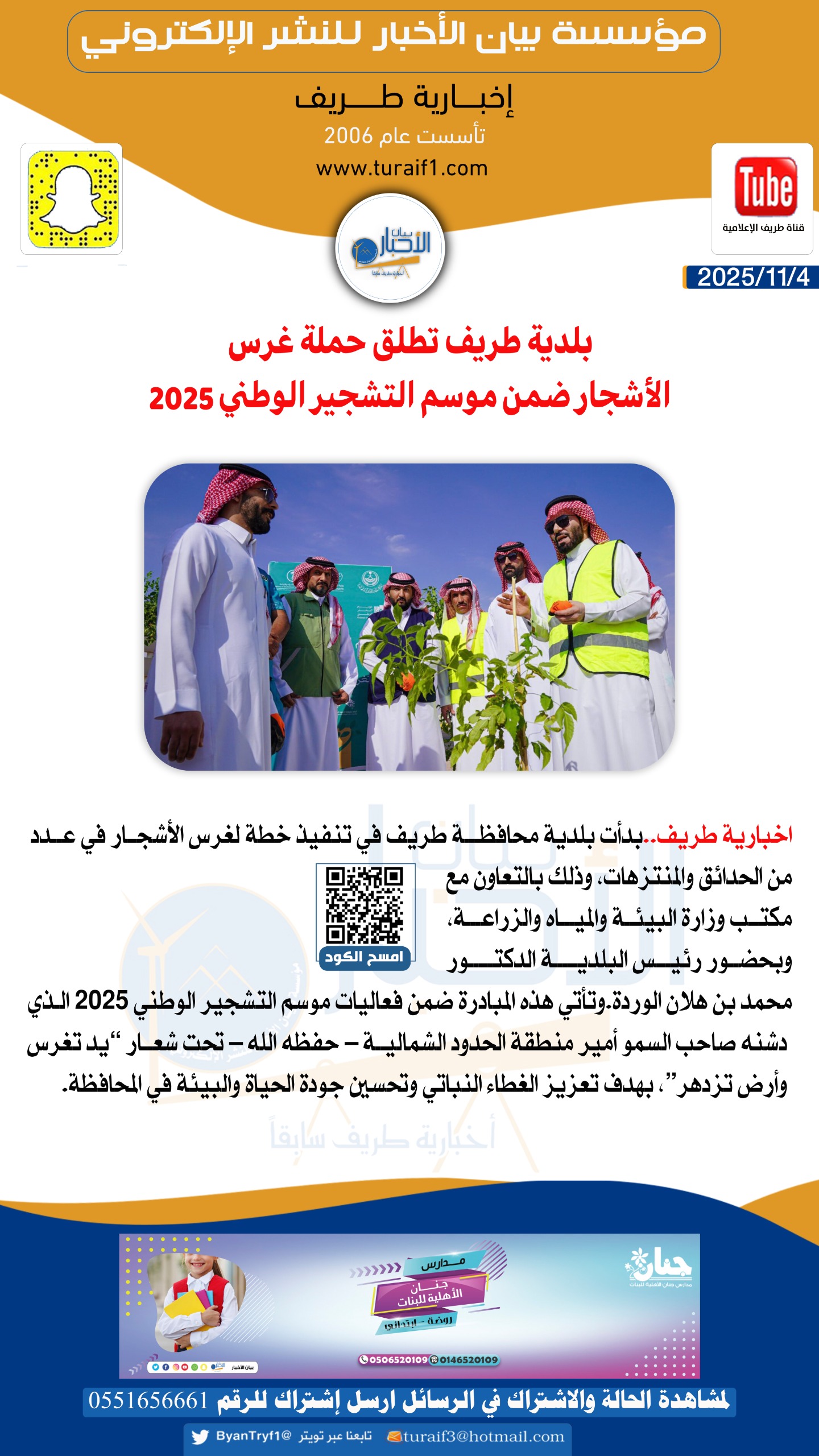 وتأتي هذه المبادرة ضمن فعاليات موسم التشجير الوطني 2025 الذي دشنه صاحب السمو أمير منطقة الحدود الشمالية – حفظه الله – تحت شعار “يد تغرس وأرض تزدهر”، بهدف تعزيز الغطاء النباتي وتحسين جودة الحياة والبيئة في المحافظة.