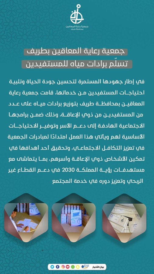 قامت جمعية رعاية المعاقين بمحافظة طريف بتوزيع برادات مياه على عدد من المستفيدين من ذوي الإعاقة، وذلك ضمن برامجها الاجتماعية الهادفة إلى دعم الأسر وتوفير الاحتياجات الأساسية لهم، وفي إطار جهودها المستمرة لتحسين جودة الحياة وتلبية احتياجات المستفيدين.