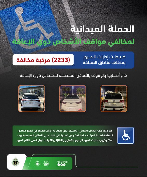 وكشف «المرور السعودي» عبر حسابه بمنصة «إكس»، عن ضبط 2233 مركبة مخالفة، بمختلف مناطق المملكة، قام أصحابها بالوقوف بالأماكن المخصصة للأشخاص ذوي الإعاقة.