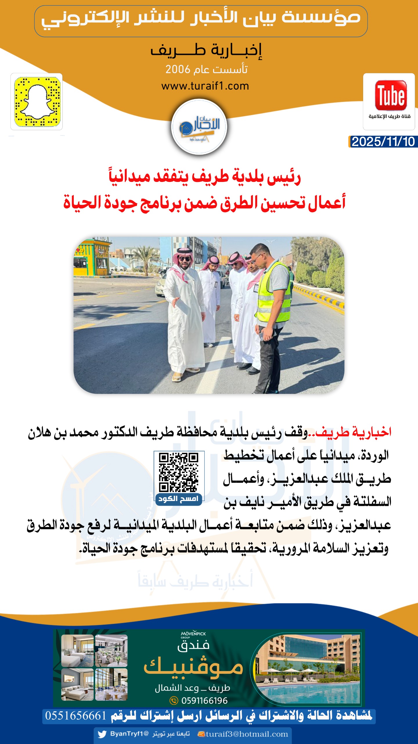 وقف رئيس بلدية محافظة طريف الدكتور محمد بن هلان الوردة، ميدانياً على أعمال تخطيط طريق الملك عبدالعزيز، وأعمال السفلتة في طريق الأمير نايف بن عبدالعزيز، وذلك ضمن متابعة أعمال البلدية الميدانية لرفع جودة الطرق وتعزيز السلامة المرورية، تحقيقاً لمستهدفات برنامج جودة الحياة.