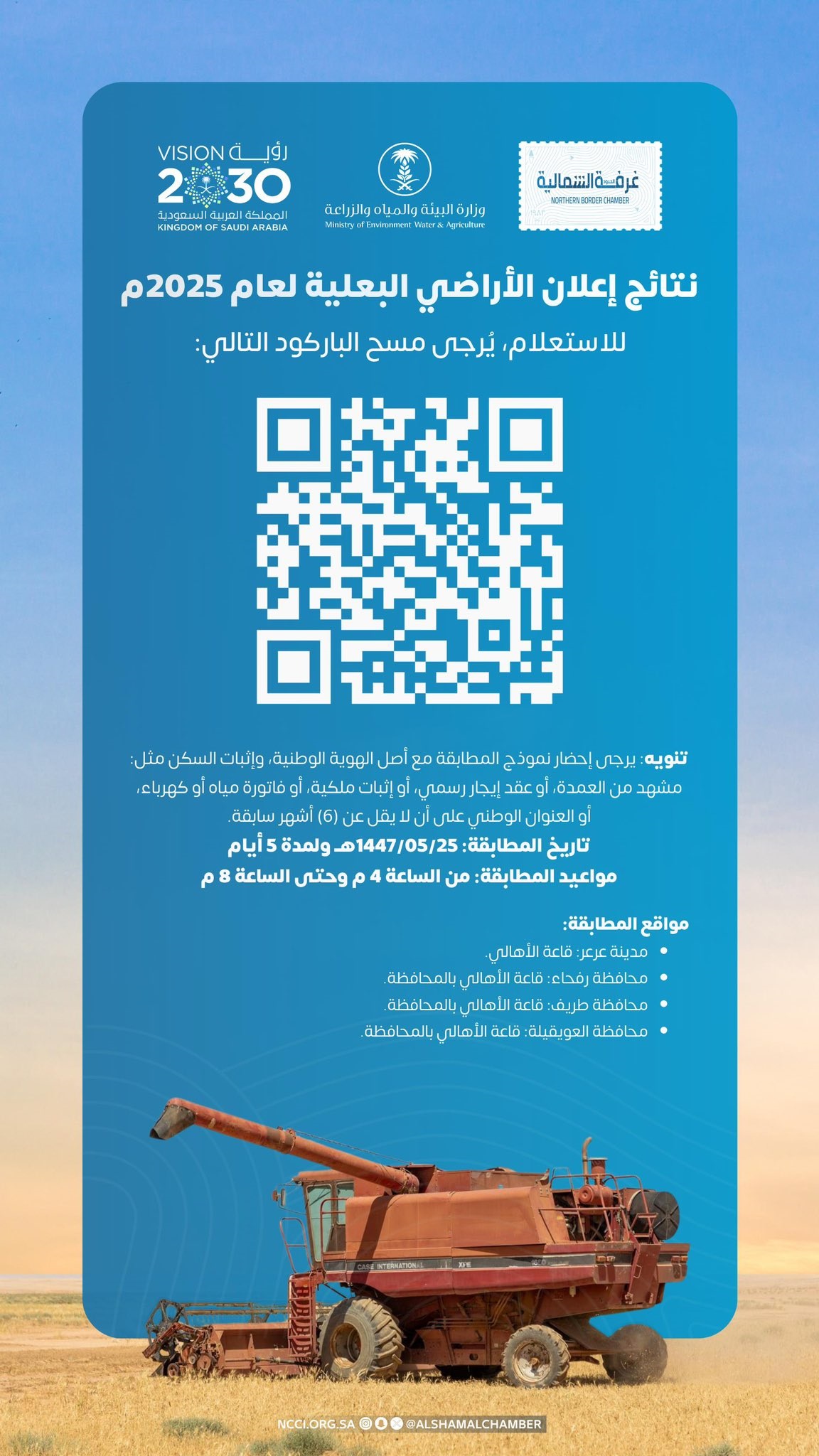 أعلن فرع وزارة البيئة والمياه والزراعة في الحدود الشمالية عن نتائج إعلان الأراضي البعلية لعام 2025 م ، وبلغ عدد المستحقين في مدينة عرعر (7,554) شخصًا، وفي محافظة طريف (810) أشخاص، وفي محافظة رفحاء (1,380) شخصًا، وفي محافظة العويقيلة (1,928) شخصًا.