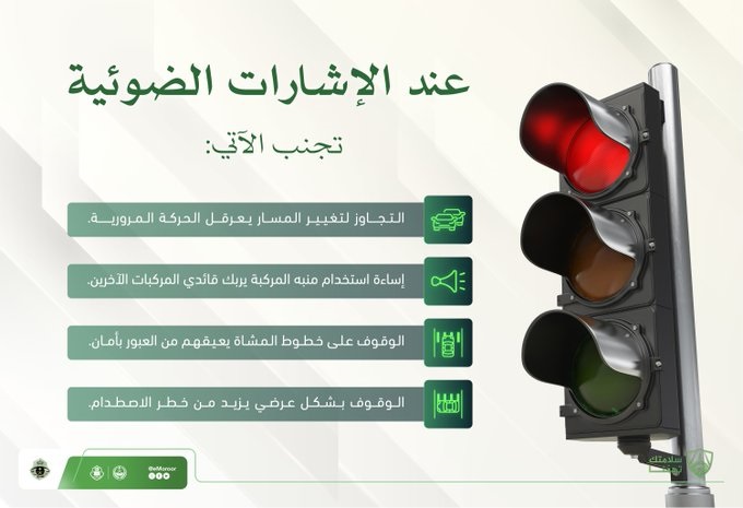 كذلك نبهت الإدارة إلى تجنب الوقوف بالمركبة على خطوط المشاة؛ لأن ذلك يعيق مرورهم بأمان، ونبهت إلى تفادي الوقوف بشكل عرضي لأن ذلك يزيد من خطر الاصطدام؛ مما يتطلب ضرورة التقيد بأنظمة السير عند الإشارة الضوئية.