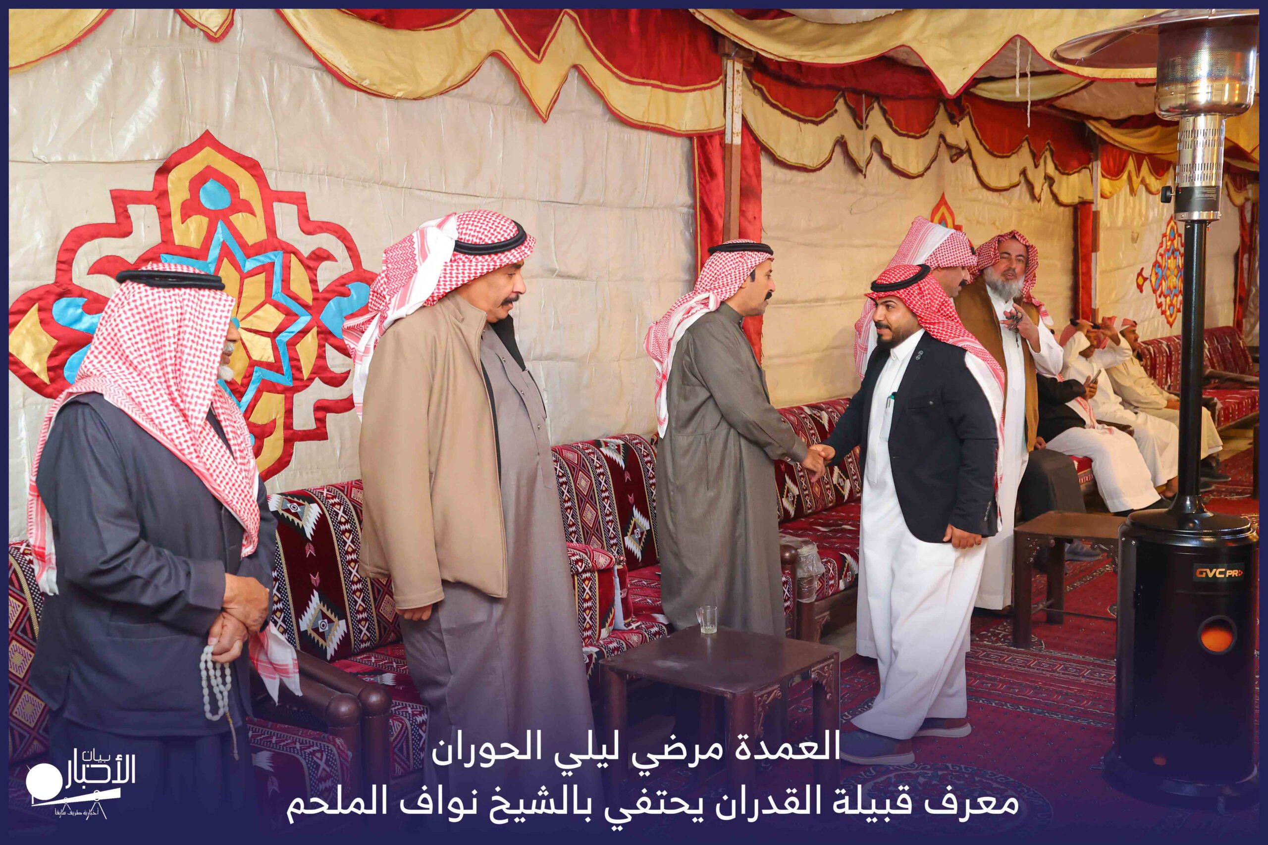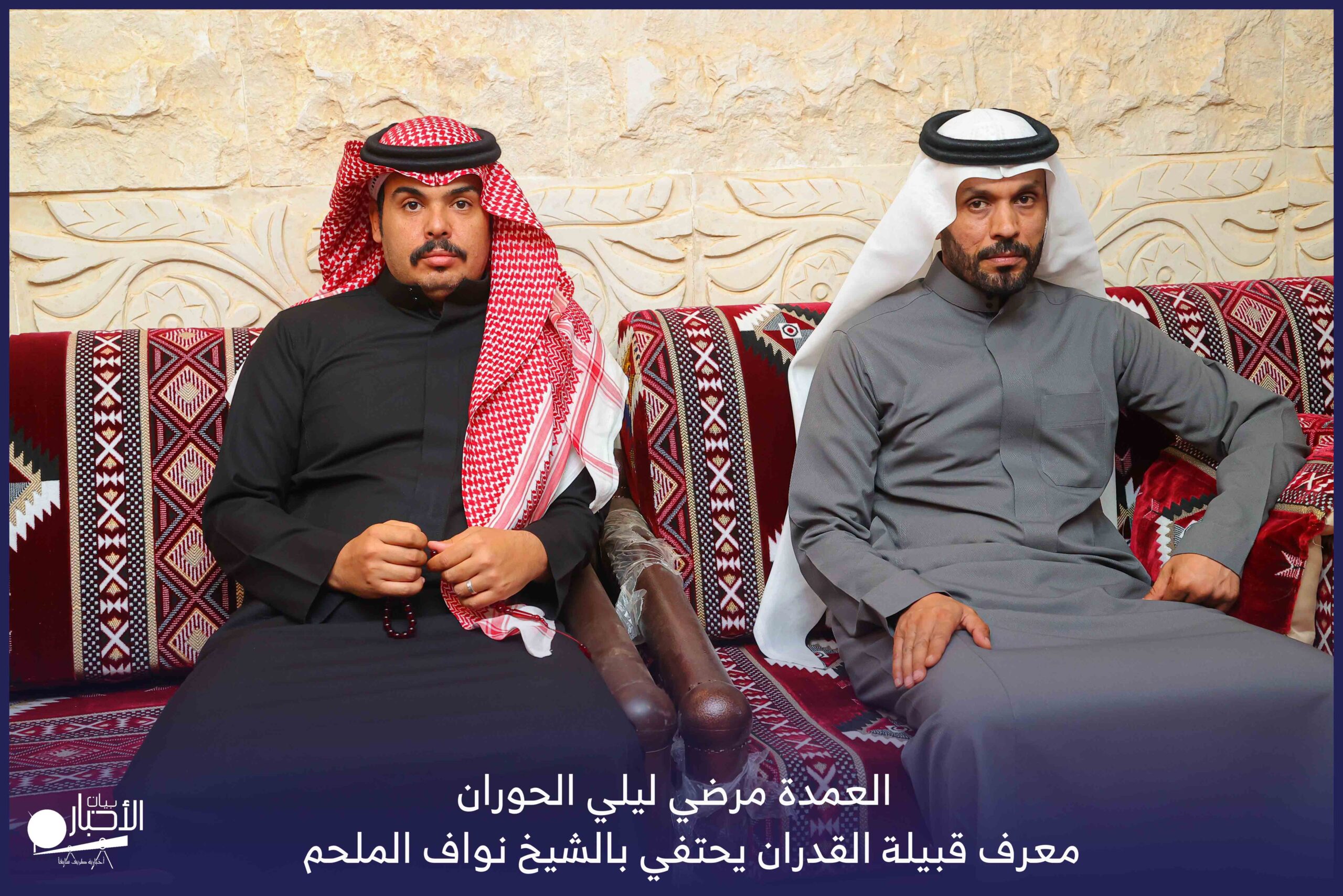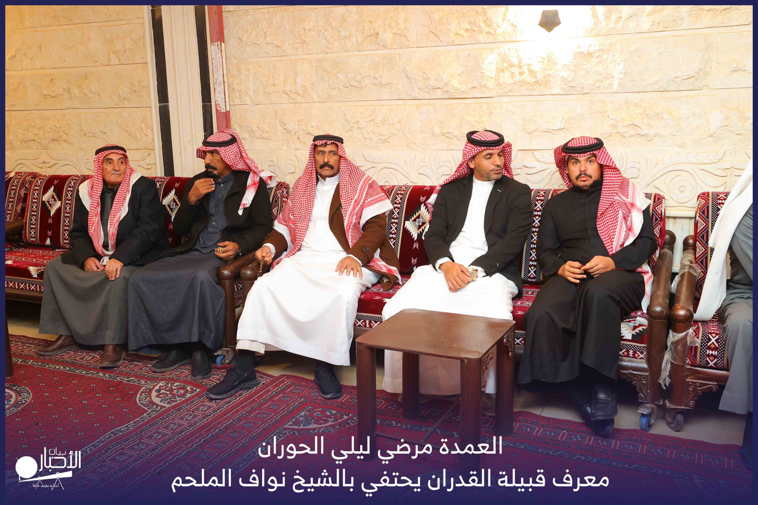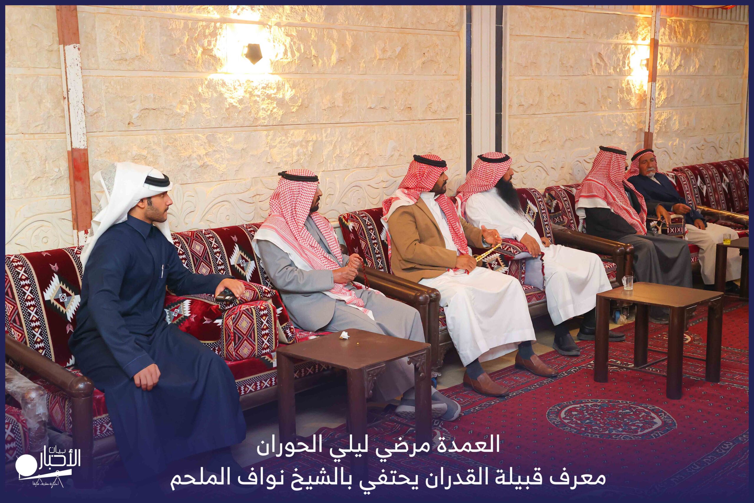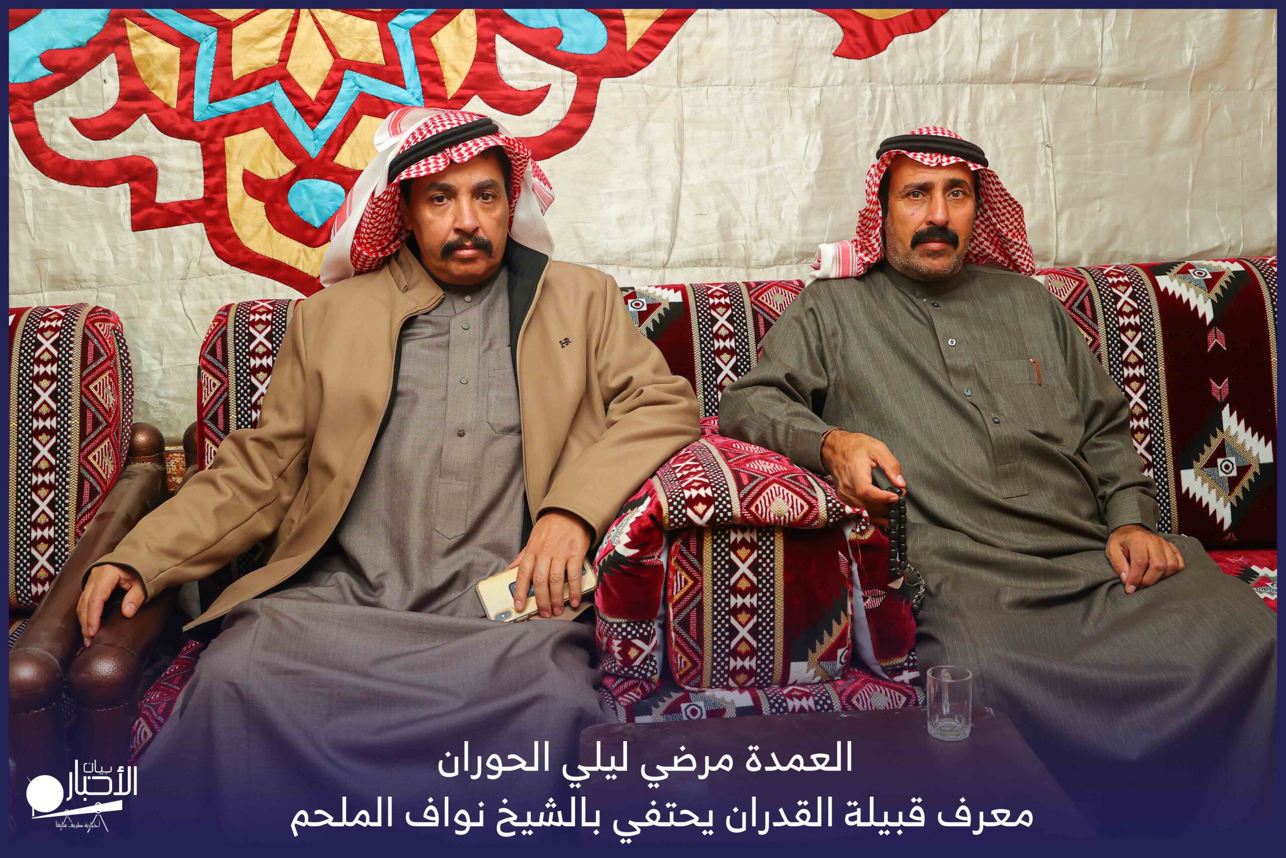 احتفى العمدة مرضي ليلي الحوران معرف قبيلة القدران بالشيخ نواف عبدالعزيز طراد الملحم، وذلك تزامناً مع زيارته لمحافظة طريف، وذلك وسط ترحيب كبير وحضور عدد من المشايخ ووجهاء المحافظة.