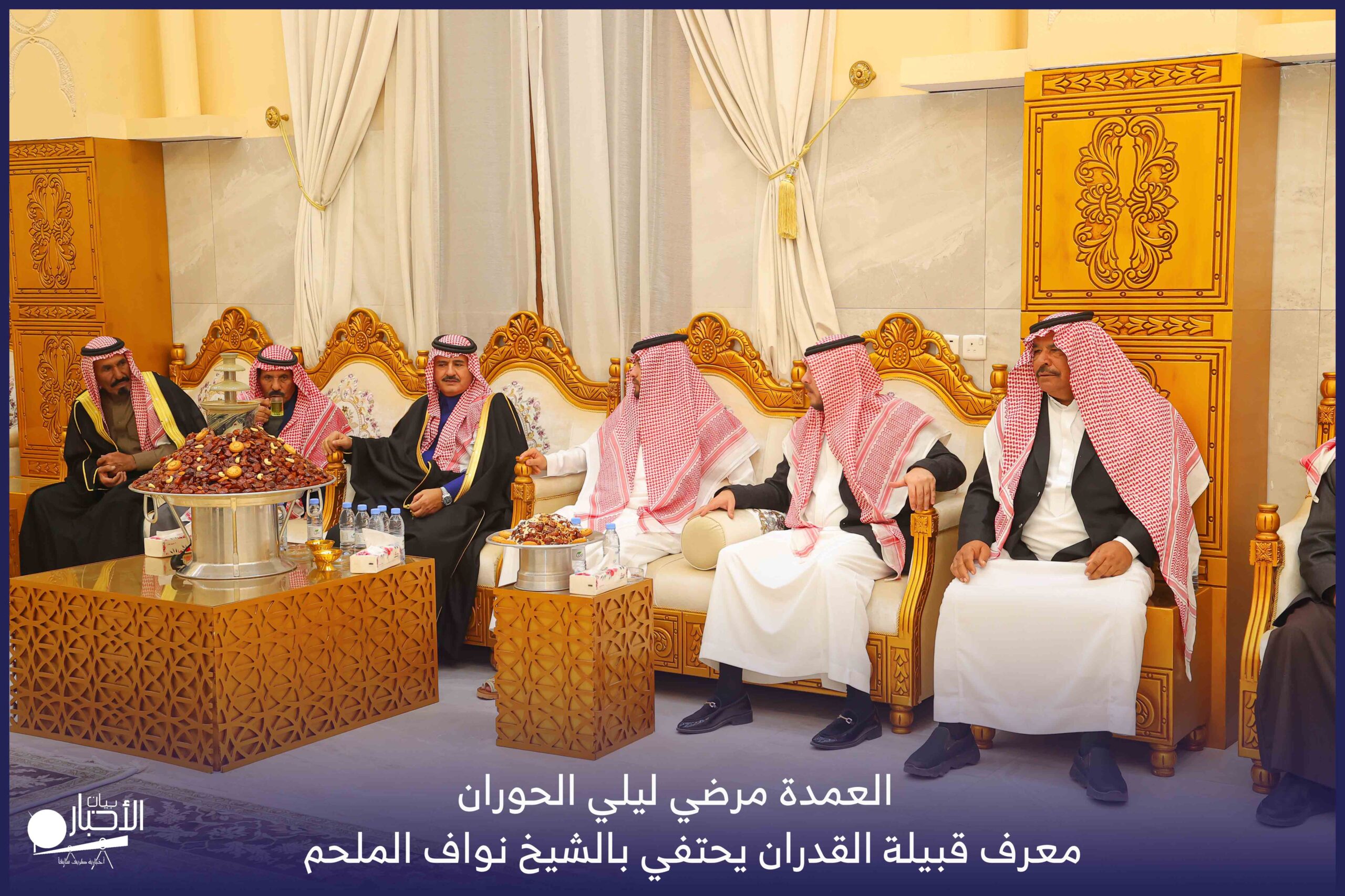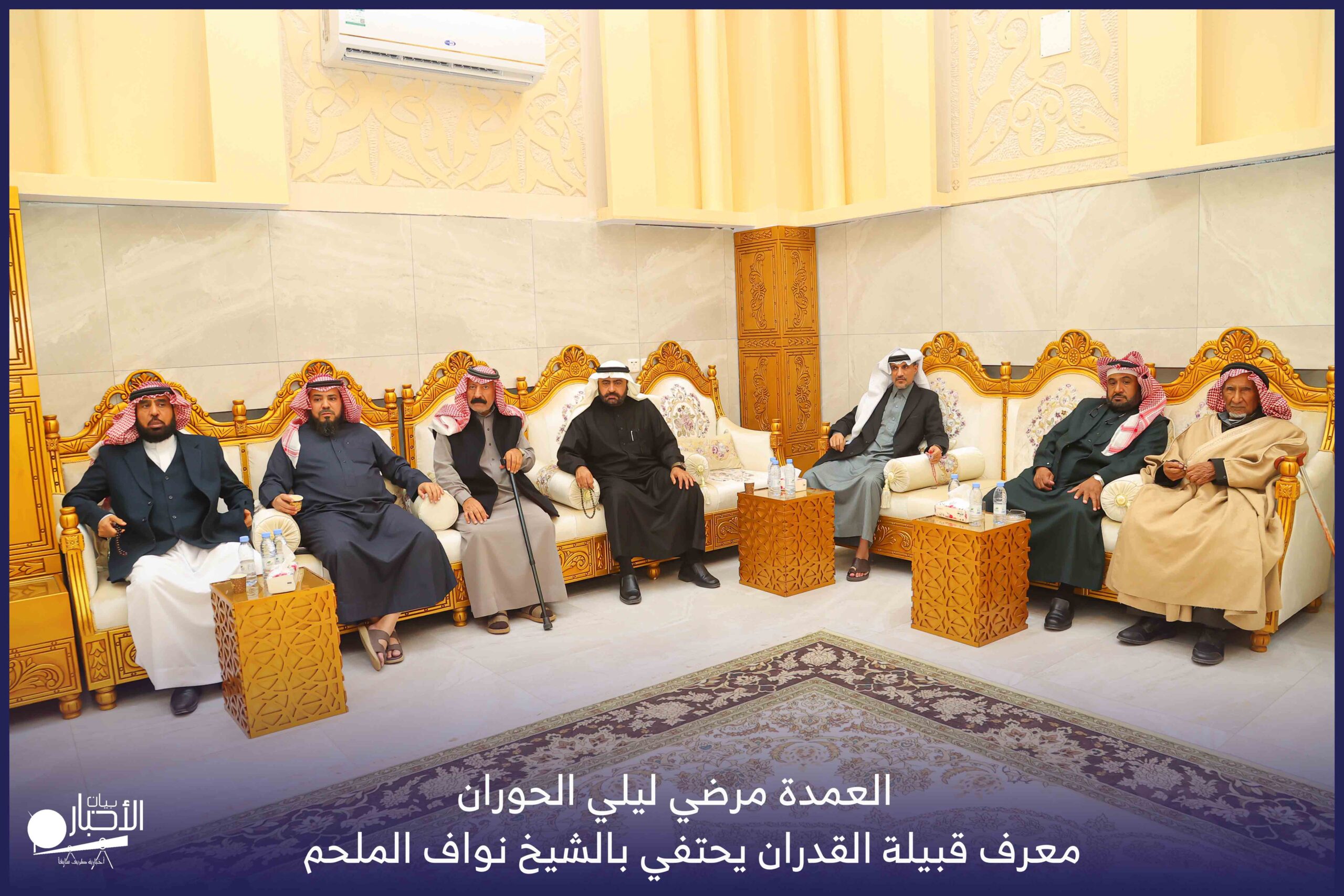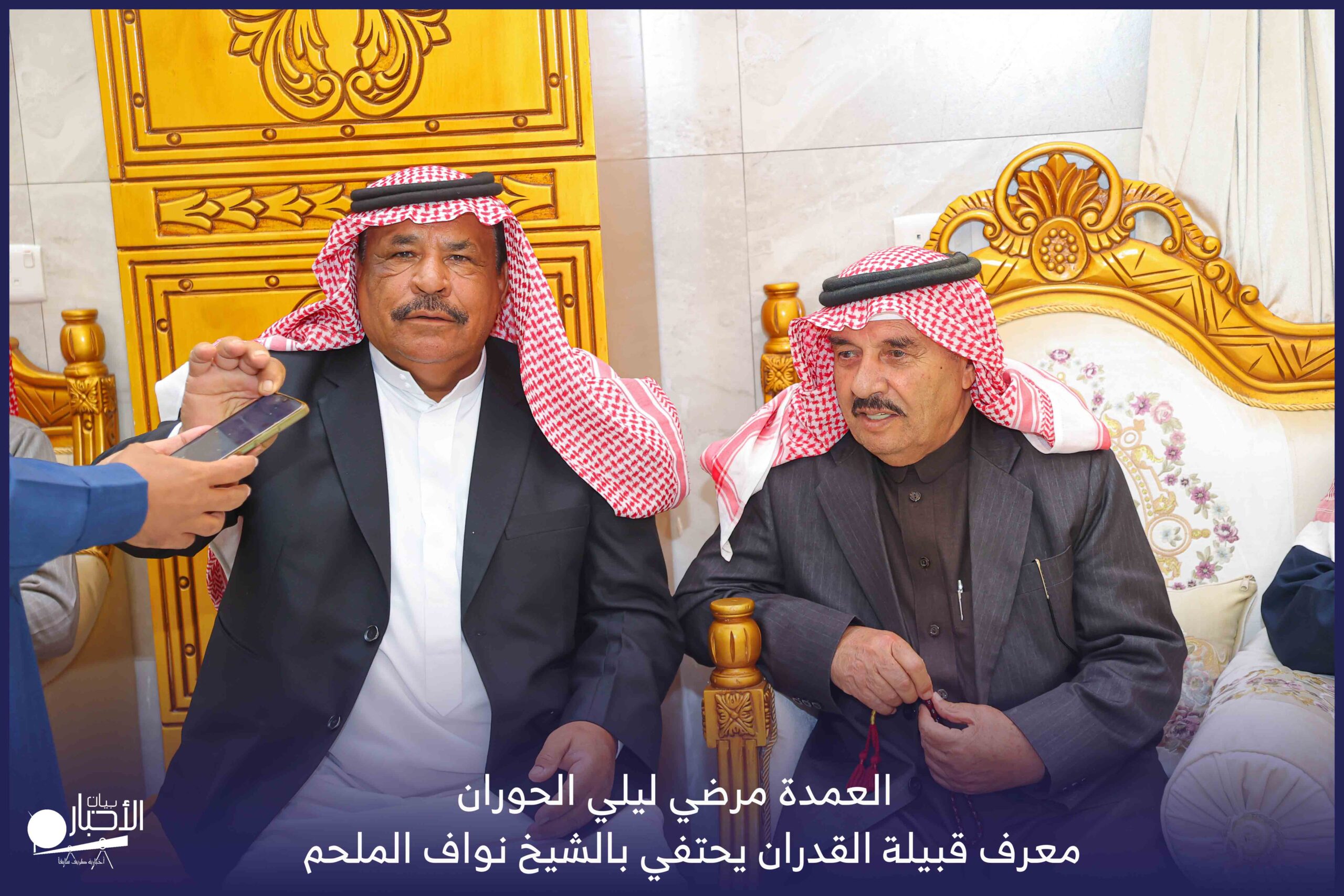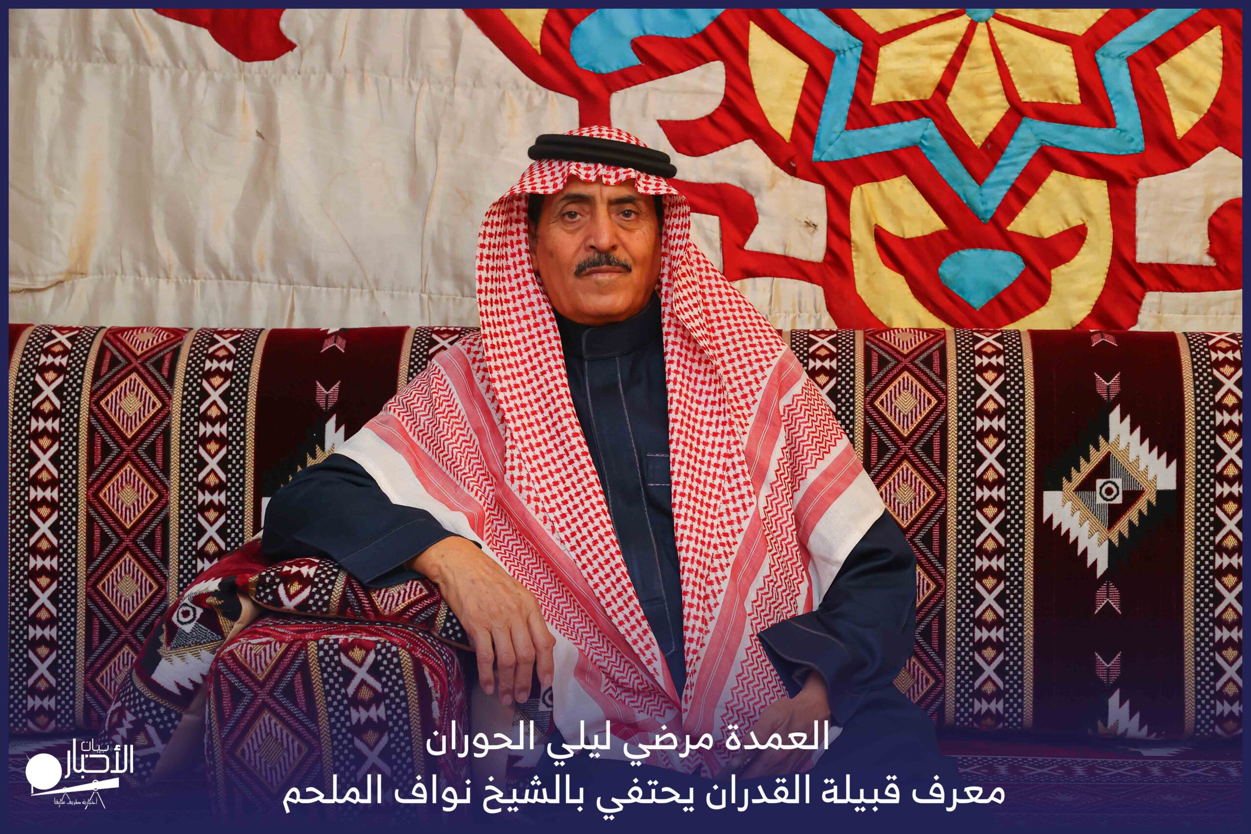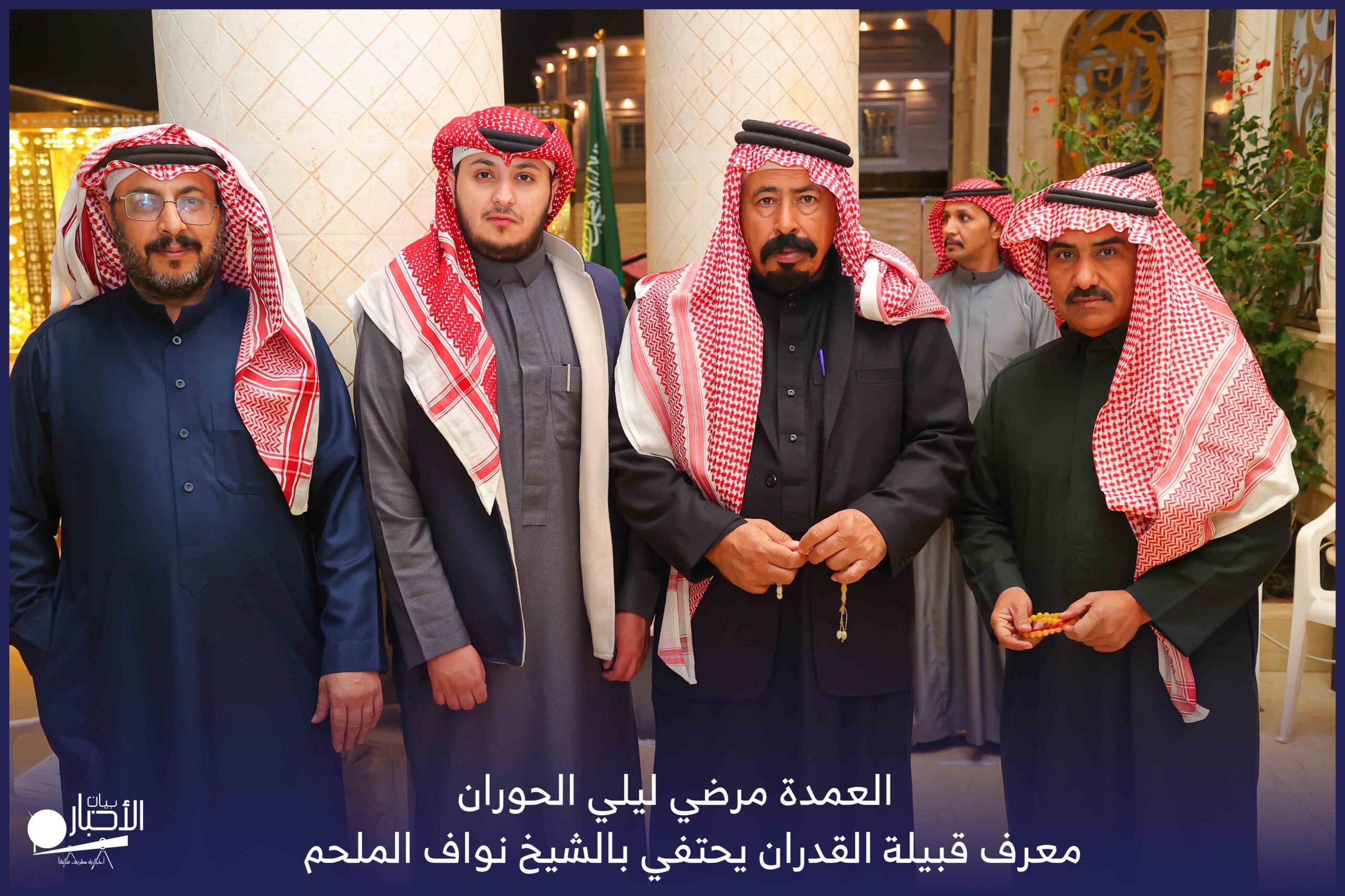 احتفى العمدة مرضي ليلي الحوران معرف قبيلة القدران بالشيخ نواف عبدالعزيز طراد الملحم، وذلك تزامناً مع زيارته لمحافظة طريف، وذلك وسط ترحيب كبير وحضور عدد من المشايخ ووجهاء المحافظة.