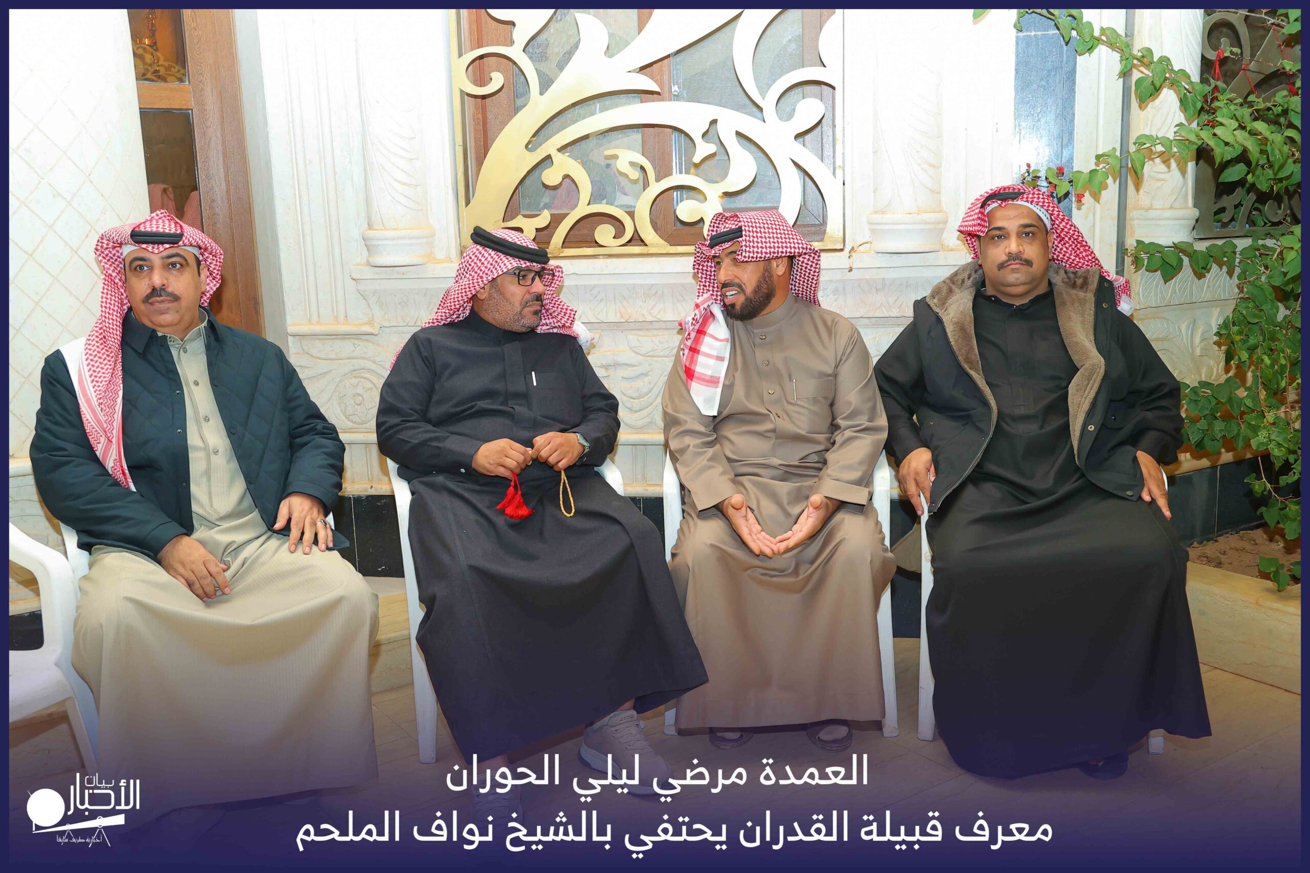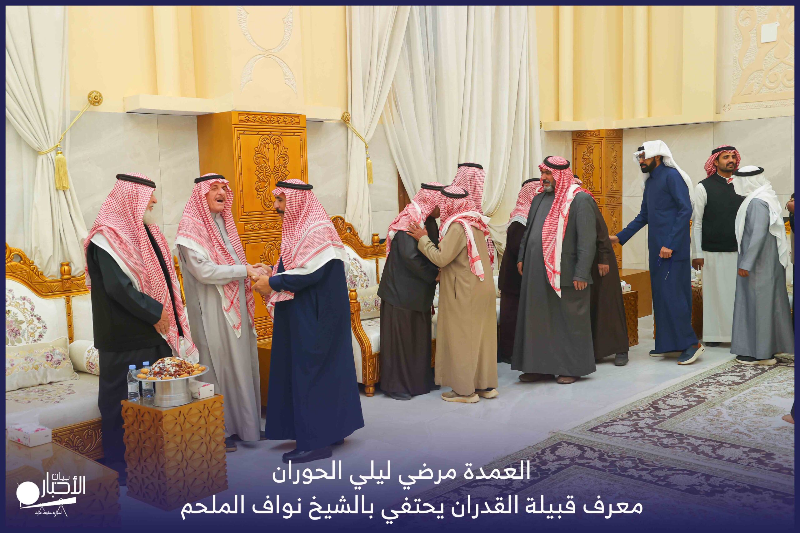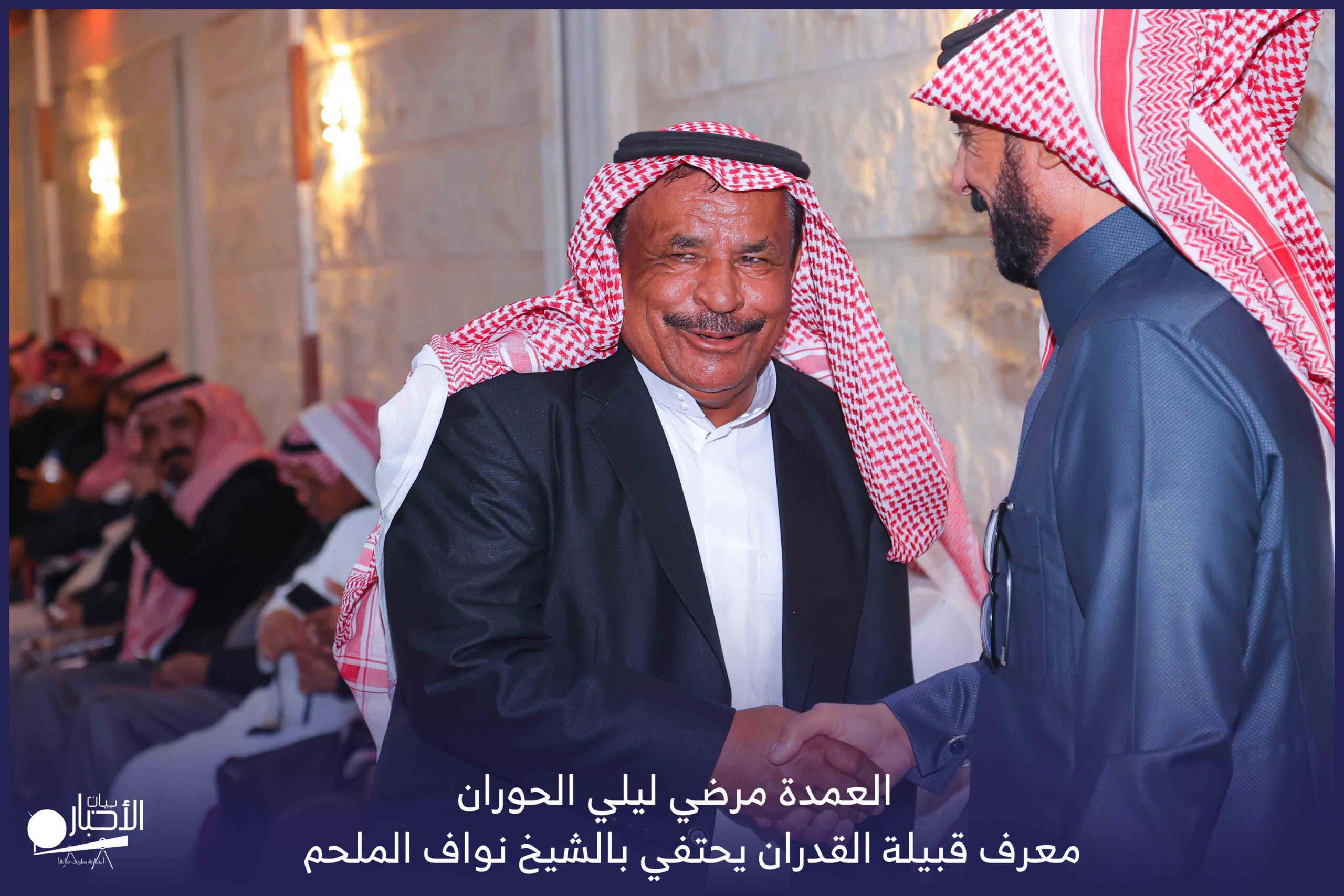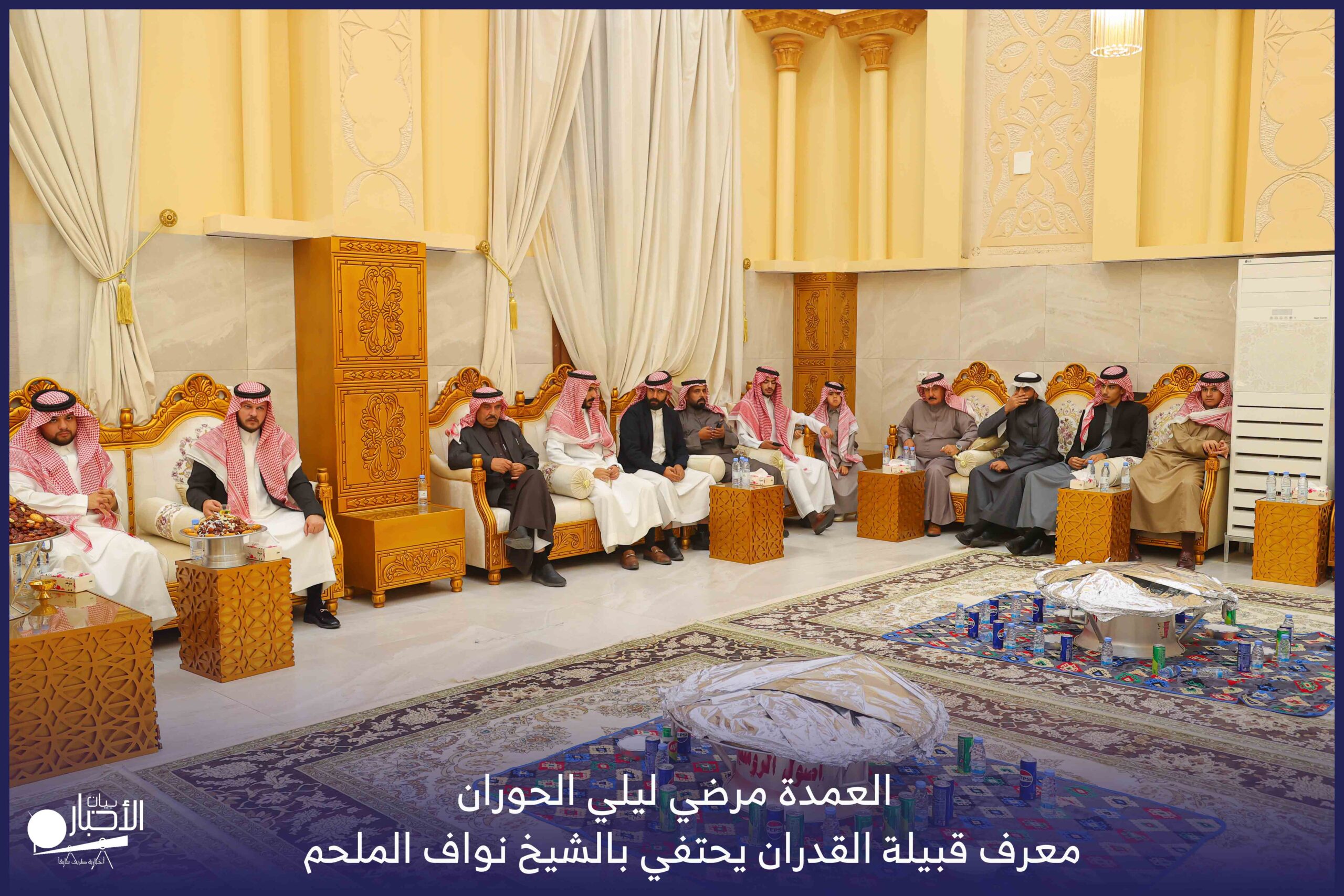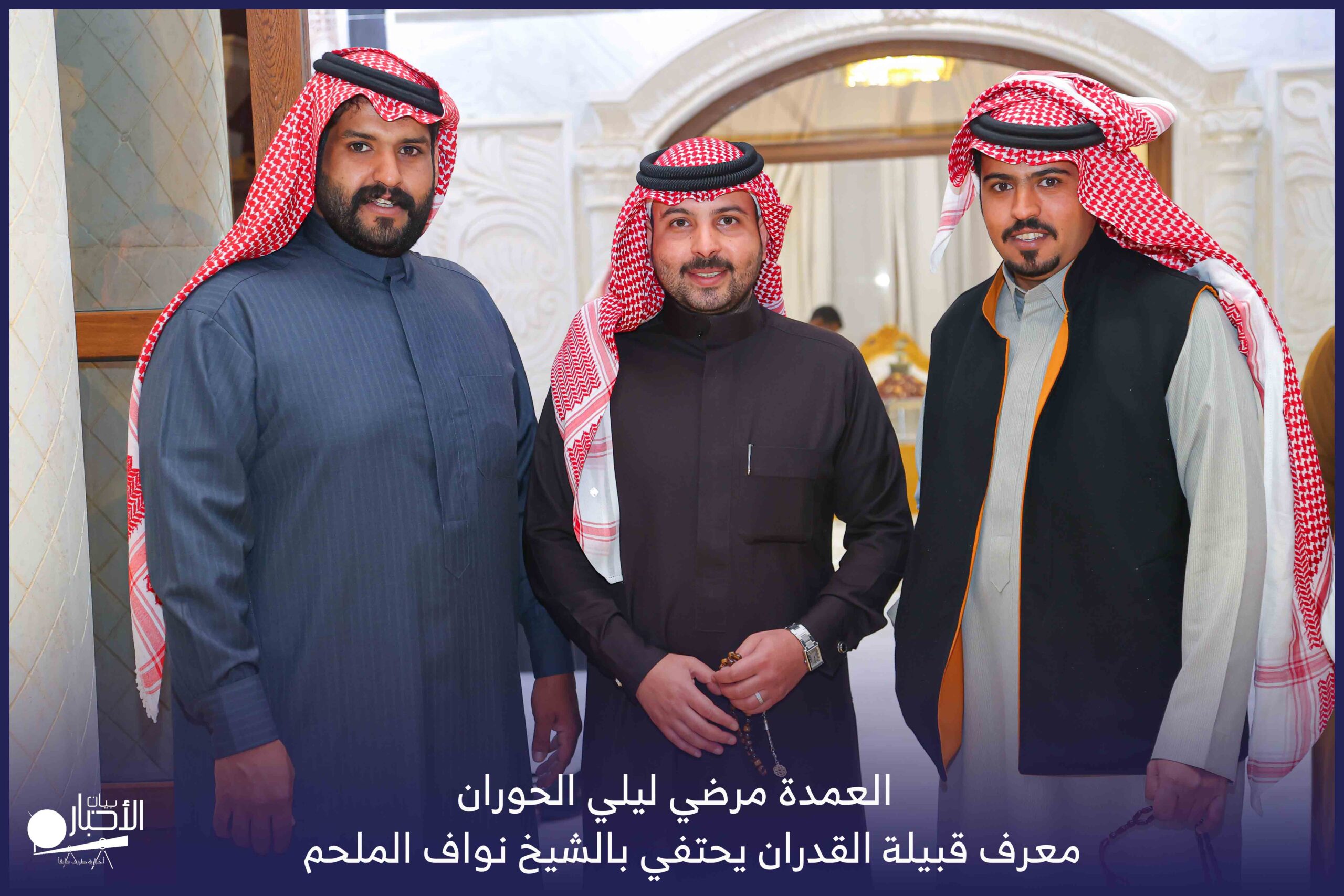 احتفى العمدة مرضي ليلي الحوران معرف قبيلة القدران بالشيخ نواف عبدالعزيز طراد الملحم، وذلك تزامناً مع زيارته لمحافظة طريف، وذلك وسط ترحيب كبير وحضور عدد من المشايخ ووجهاء المحافظة.