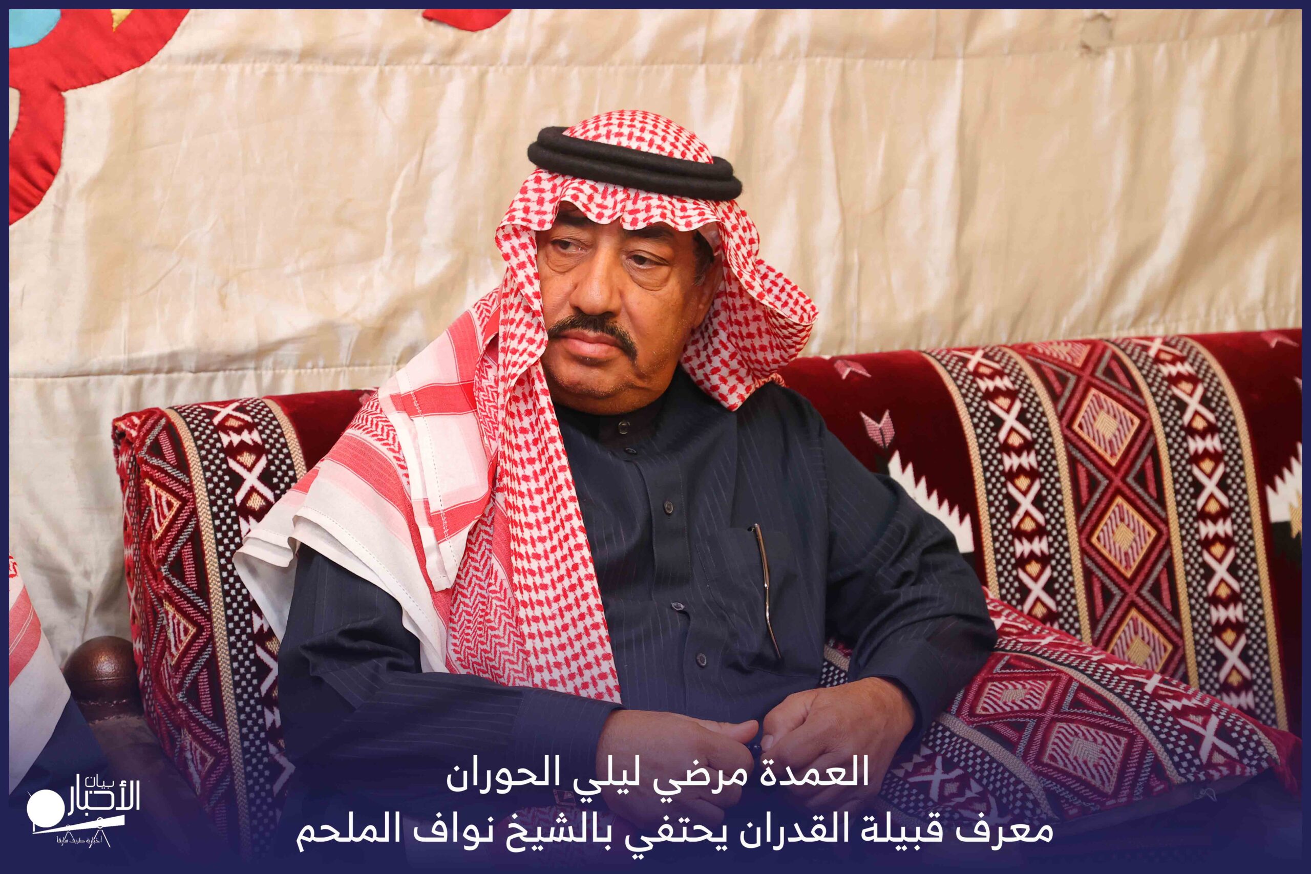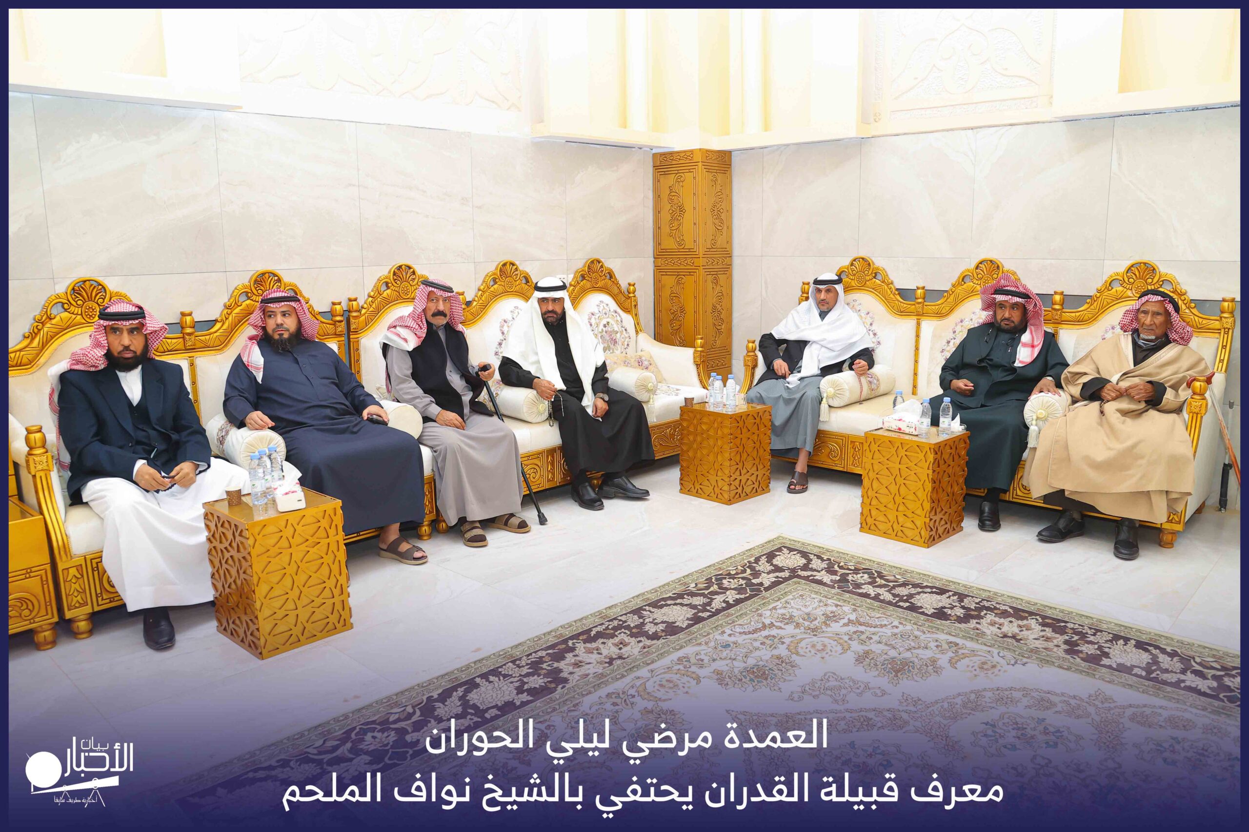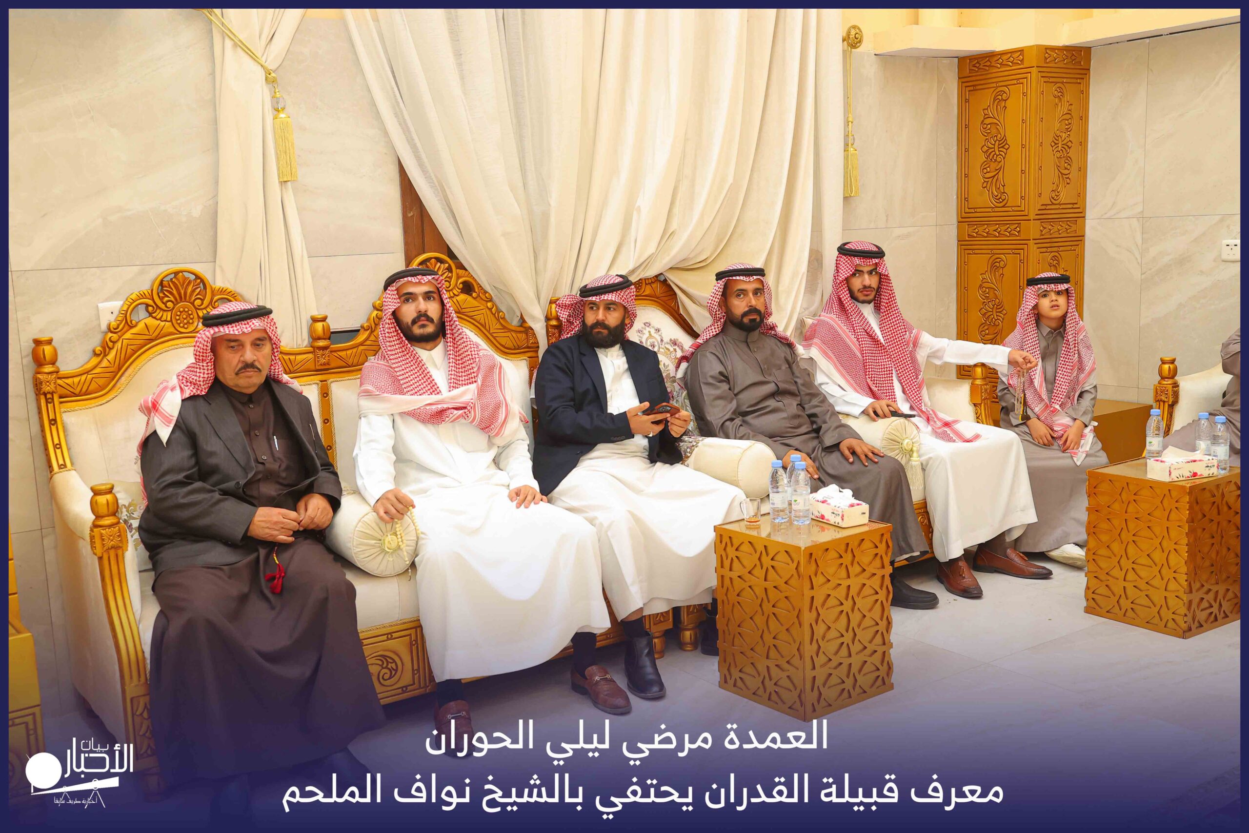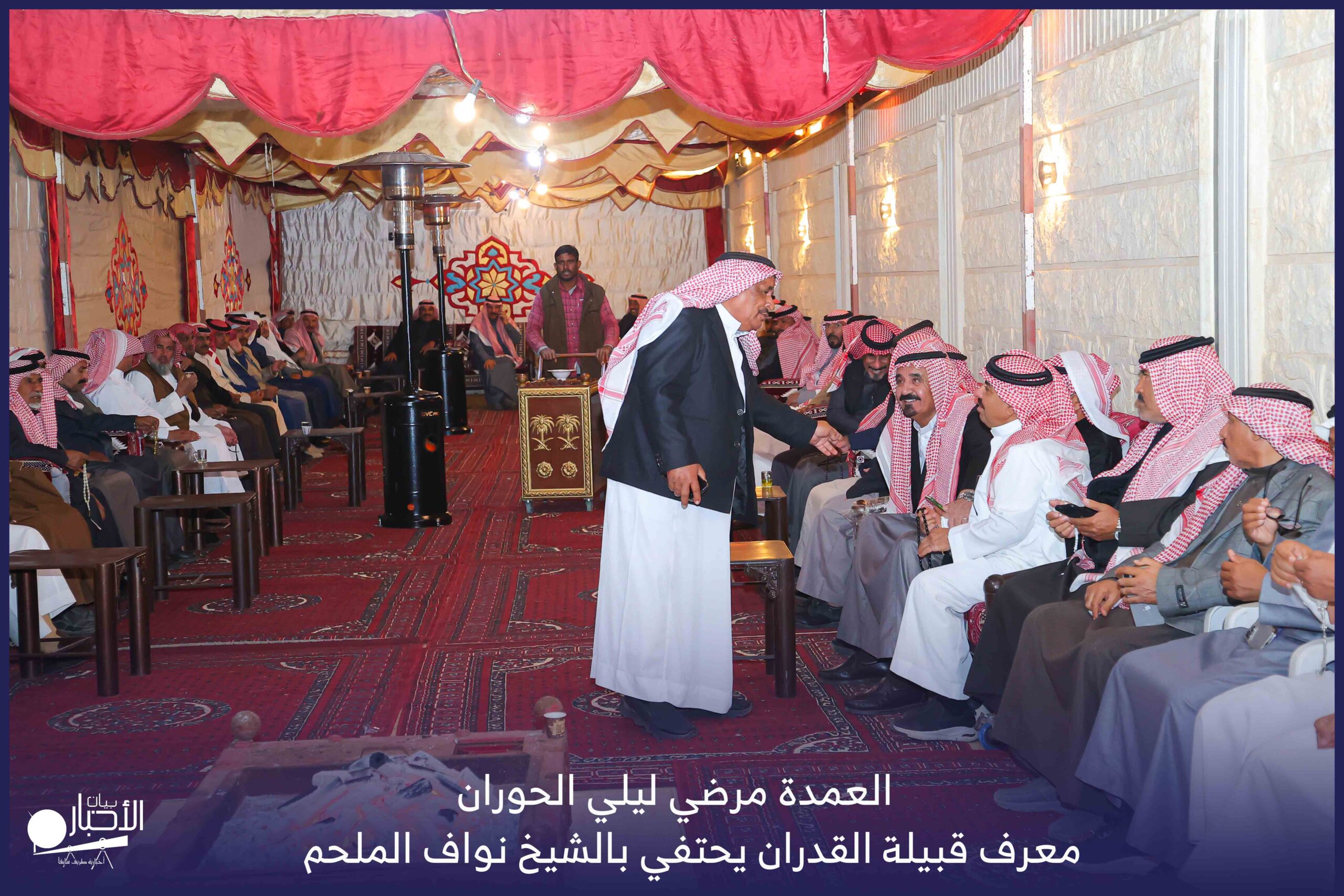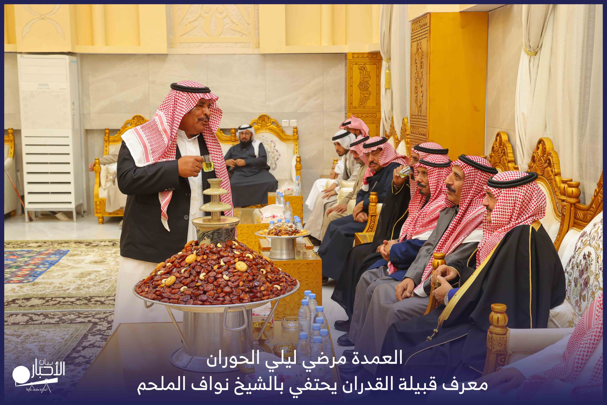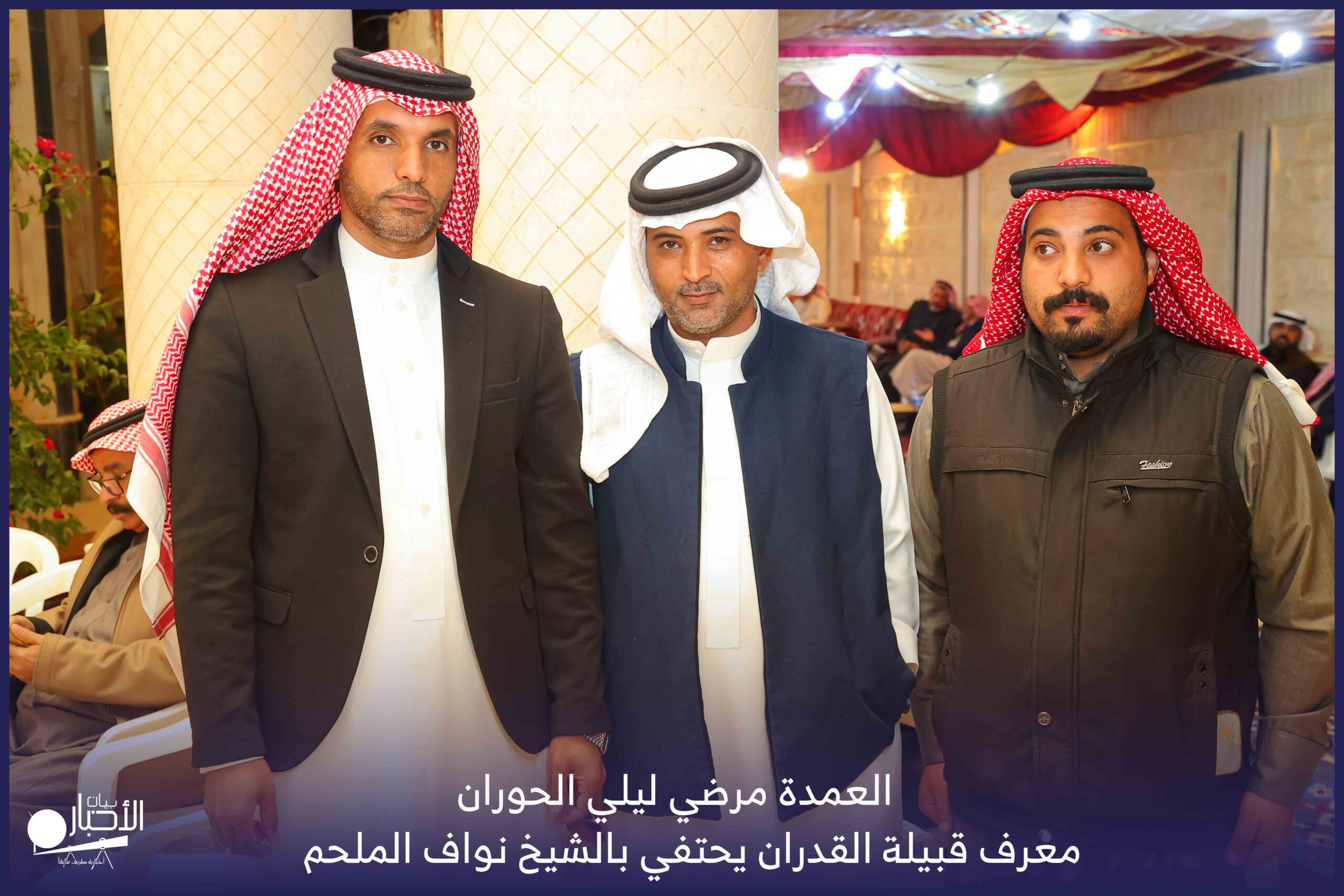احتفى العمدة مرضي ليلي الحوران معرف قبيلة القدران بالشيخ نواف عبدالعزيز طراد الملحم، وذلك تزامناً مع زيارته لمحافظة طريف، وذلك وسط ترحيب كبير وحضور عدد من المشايخ ووجهاء المحافظة.