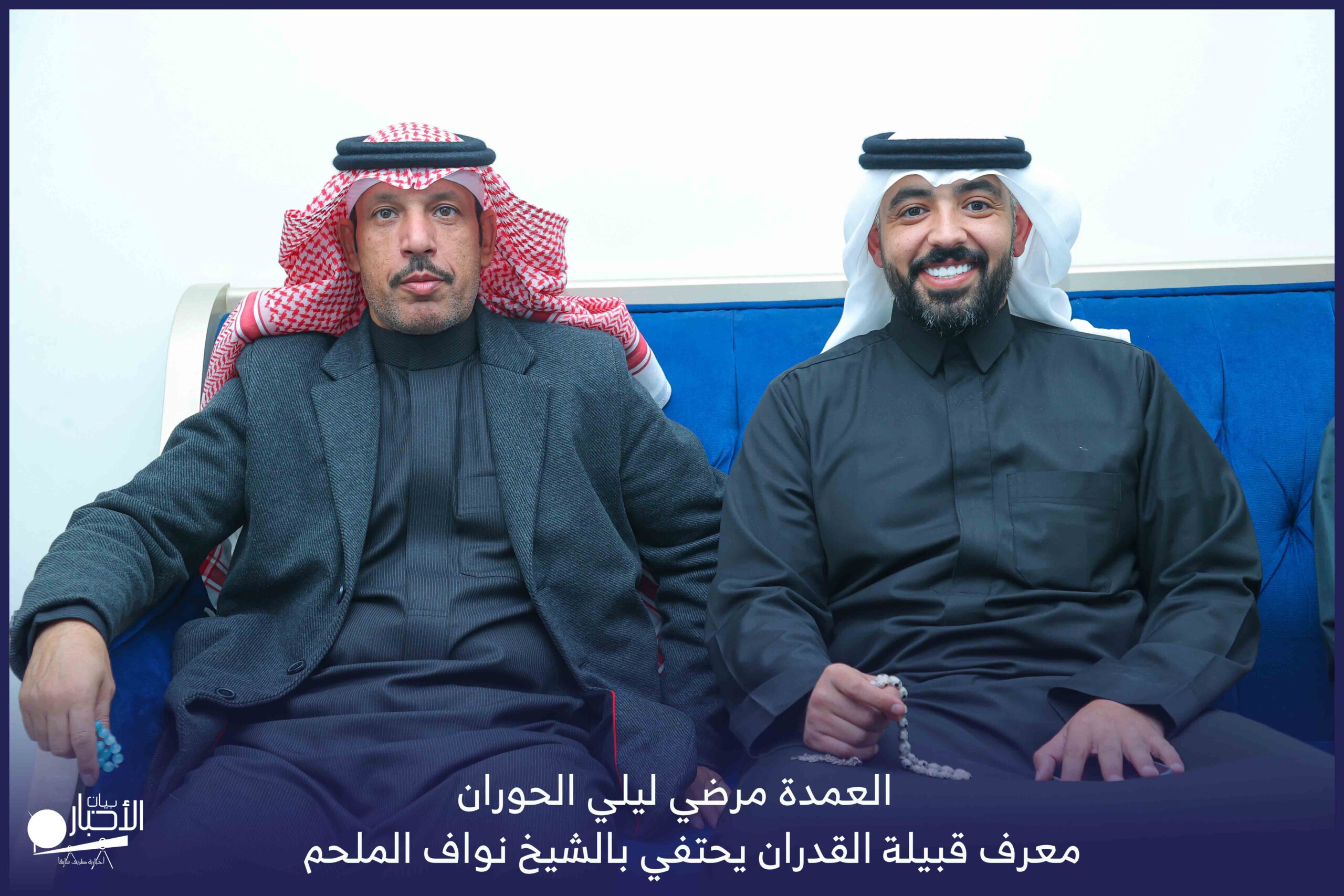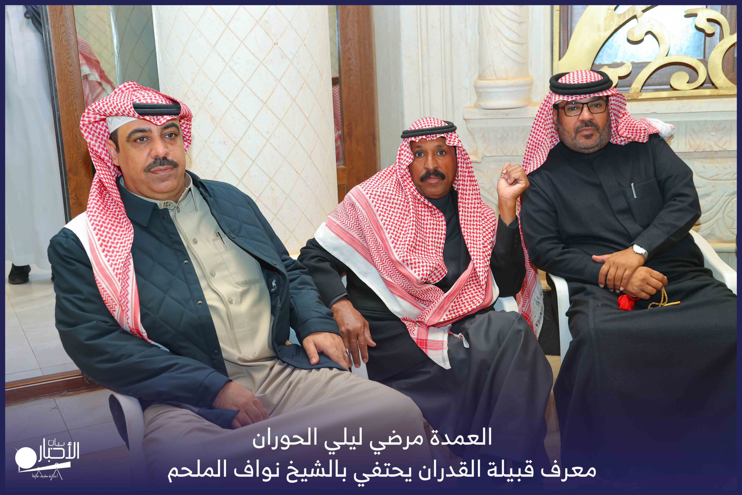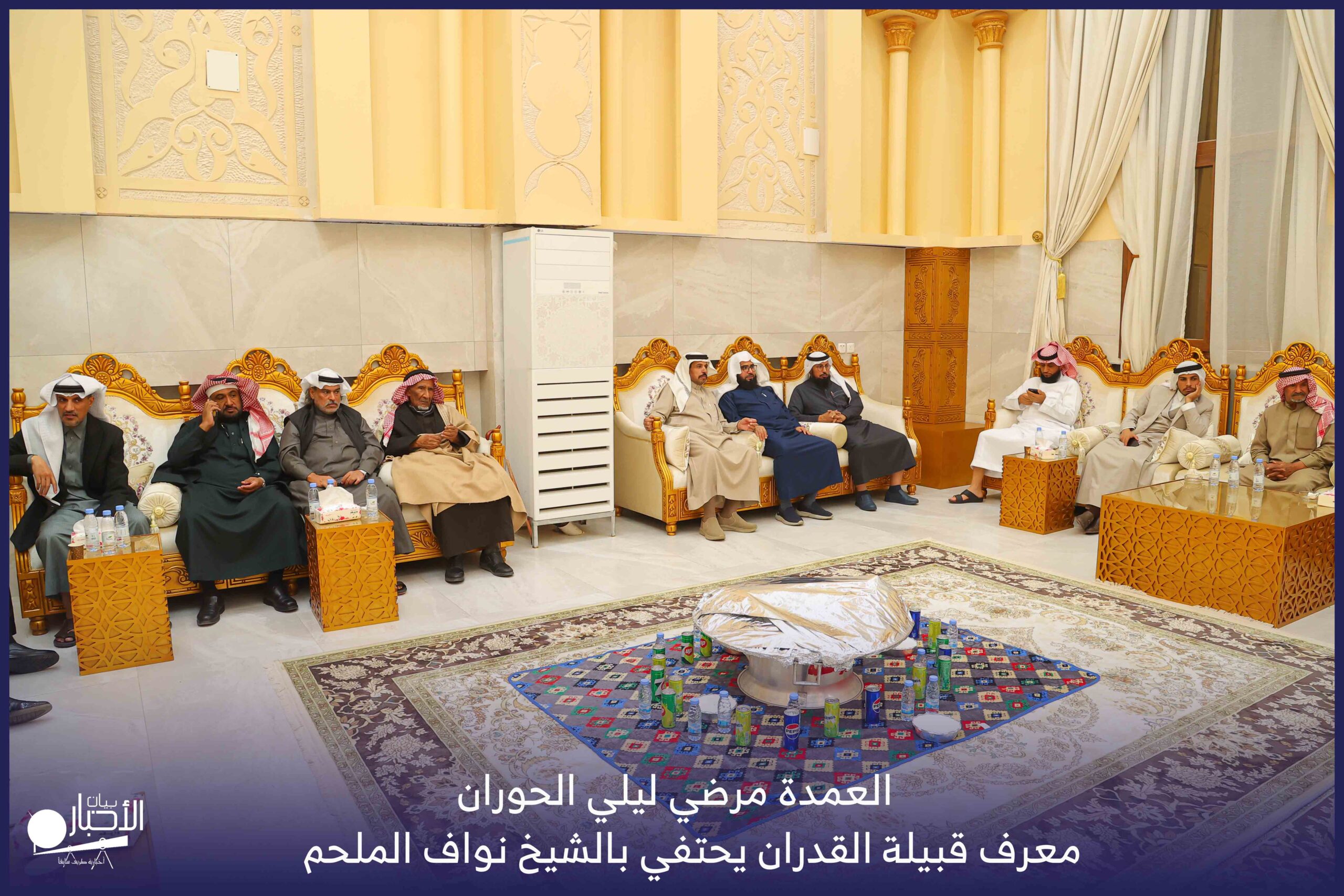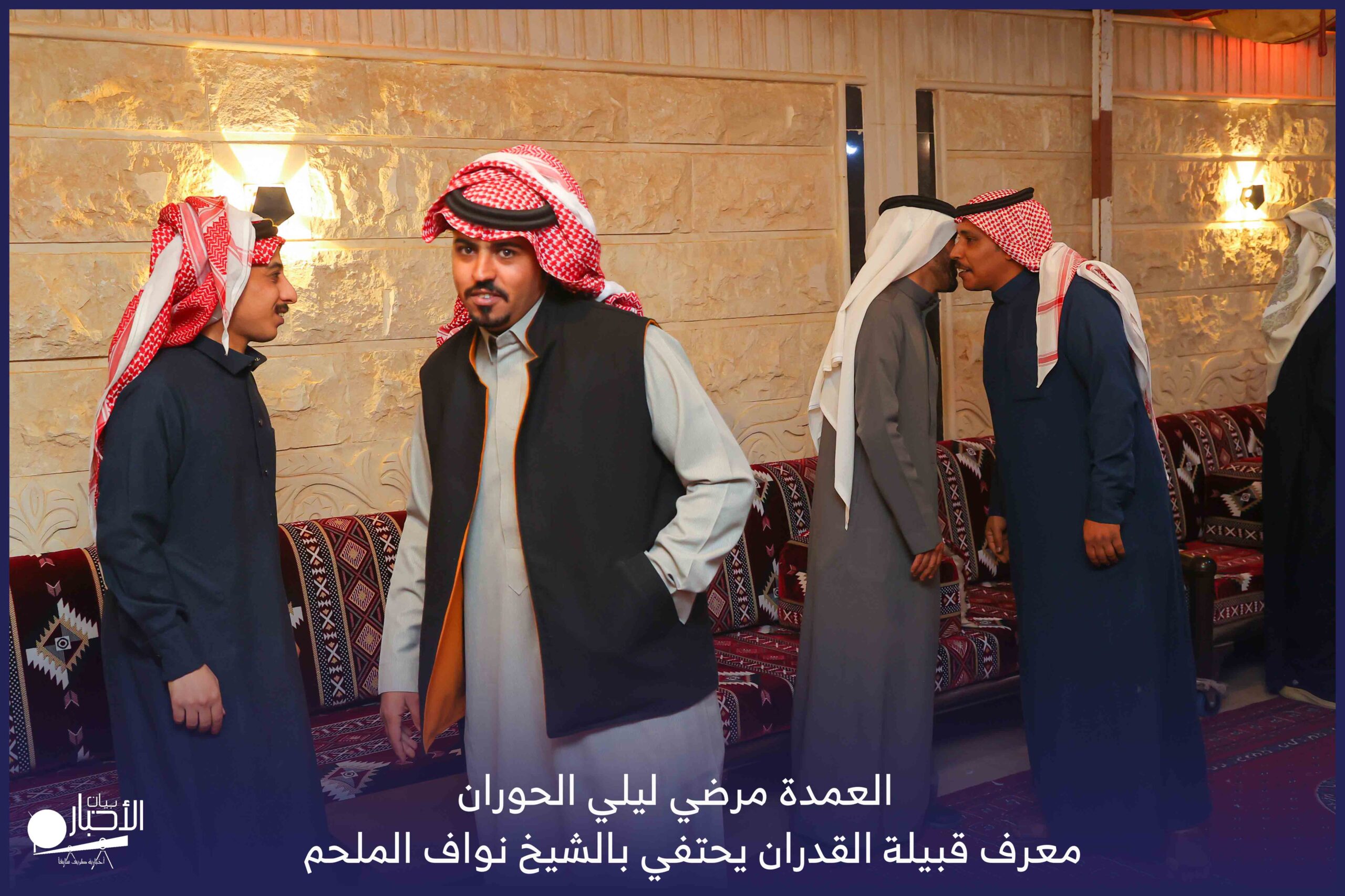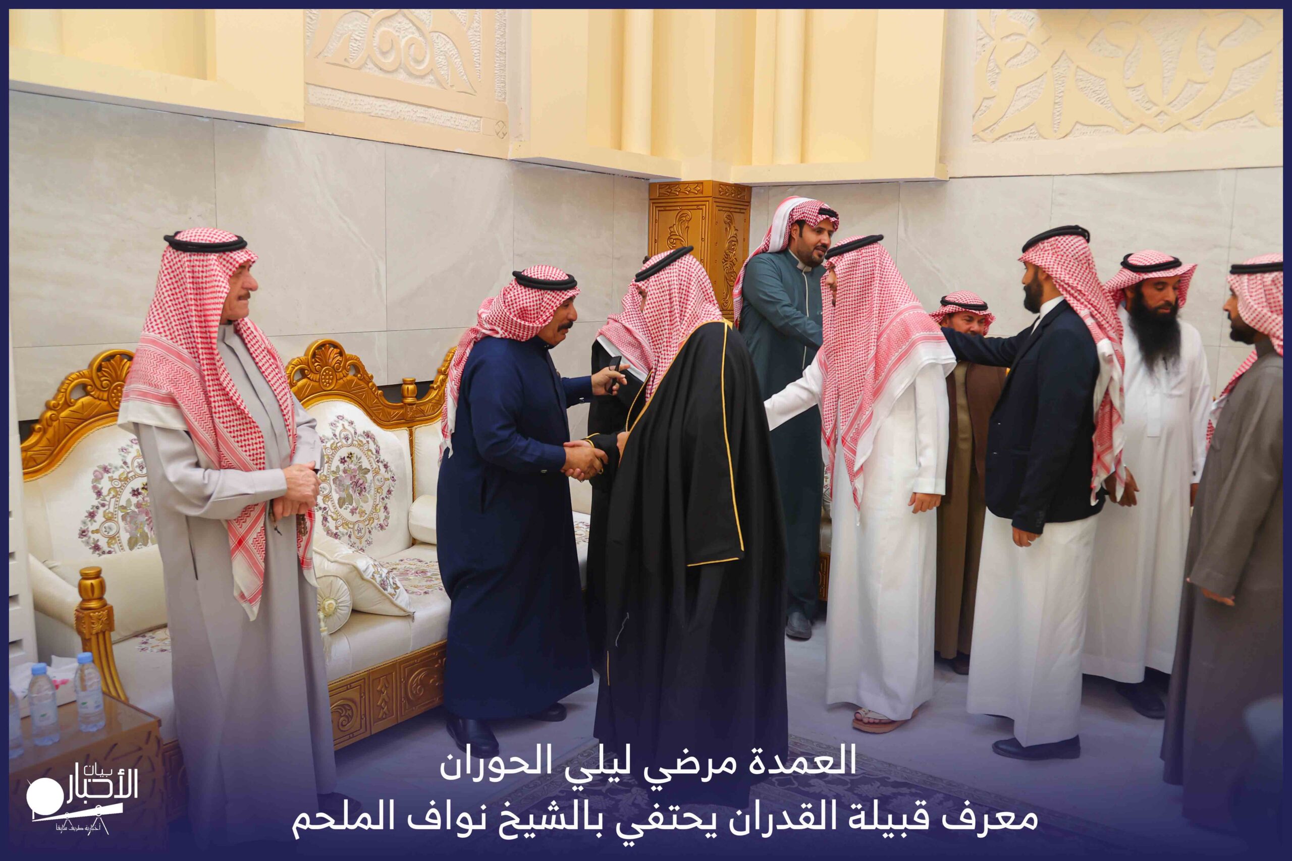 احتفى العمدة مرضي ليلي الحوران معرف قبيلة القدران بالشيخ نواف عبدالعزيز طراد الملحم، وذلك تزامناً مع زيارته لمحافظة طريف، وذلك وسط ترحيب كبير وحضور عدد من المشايخ ووجهاء المحافظة.