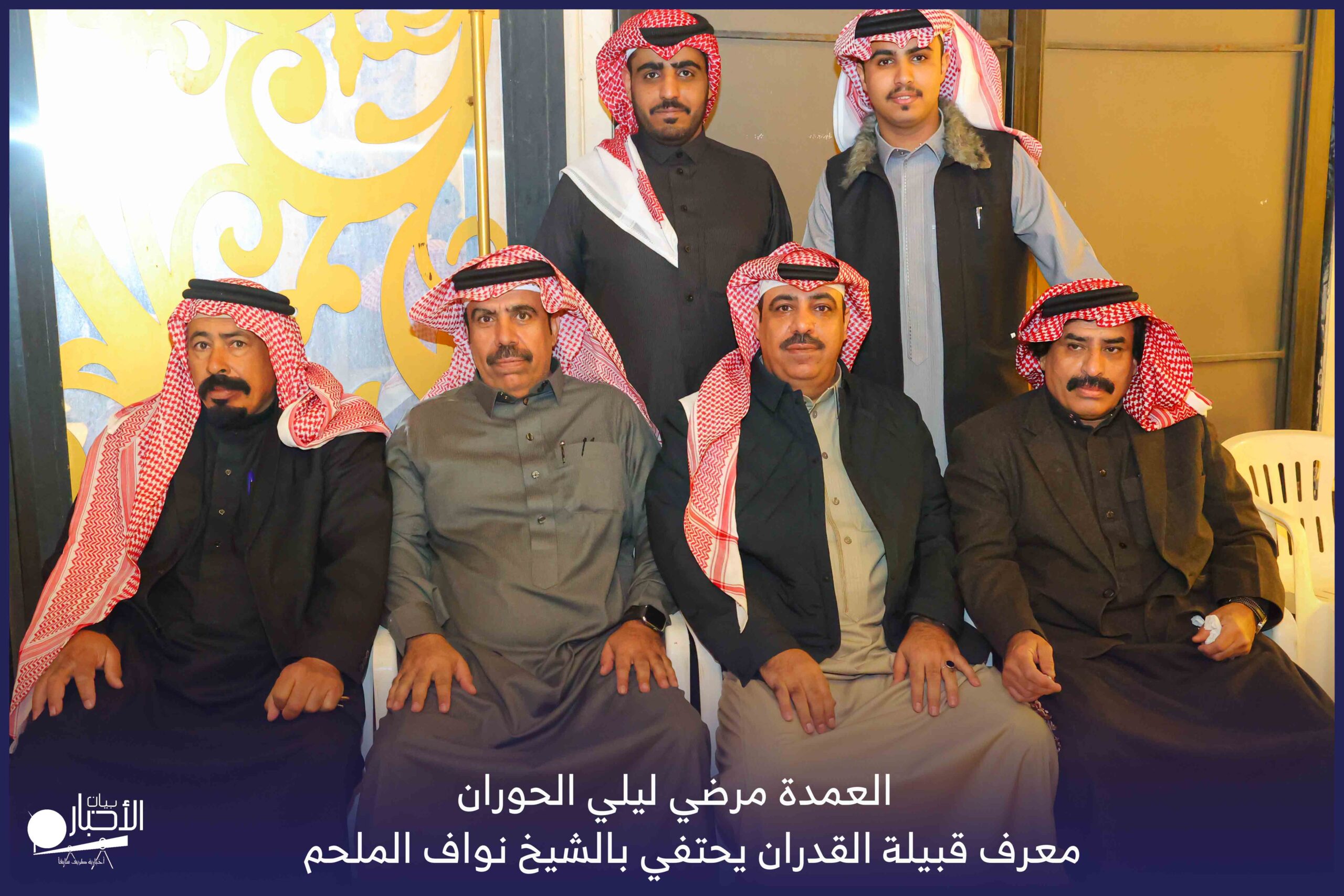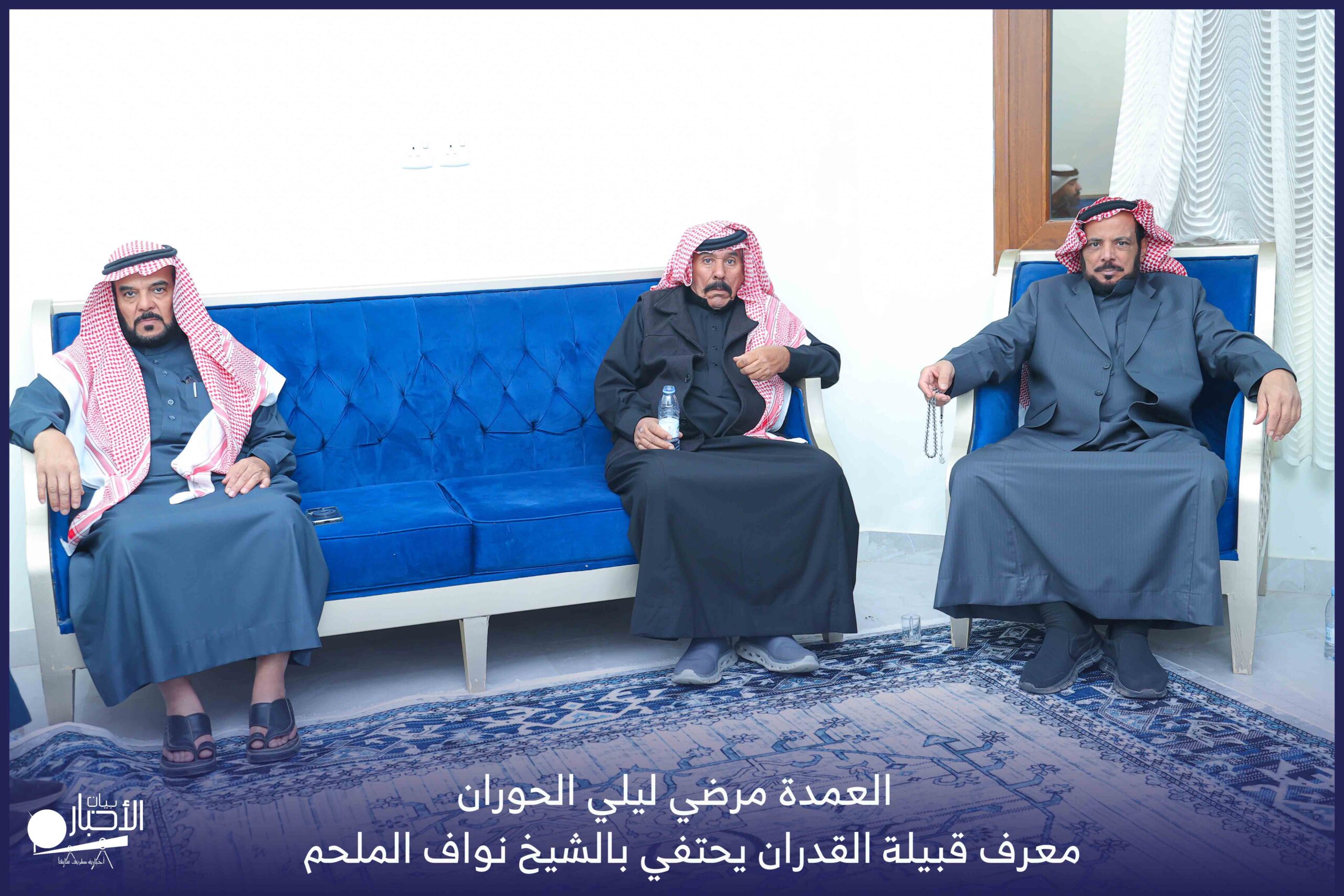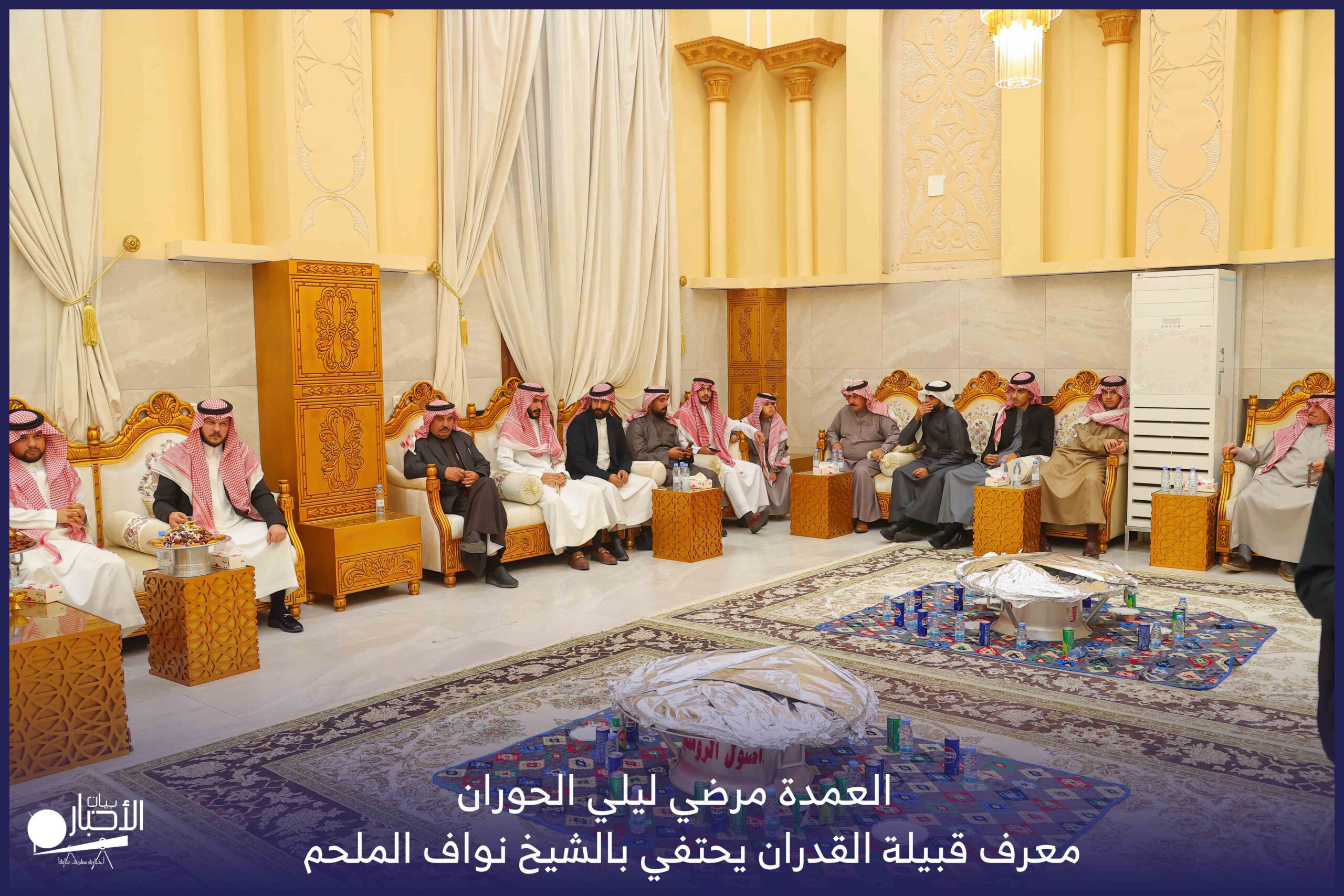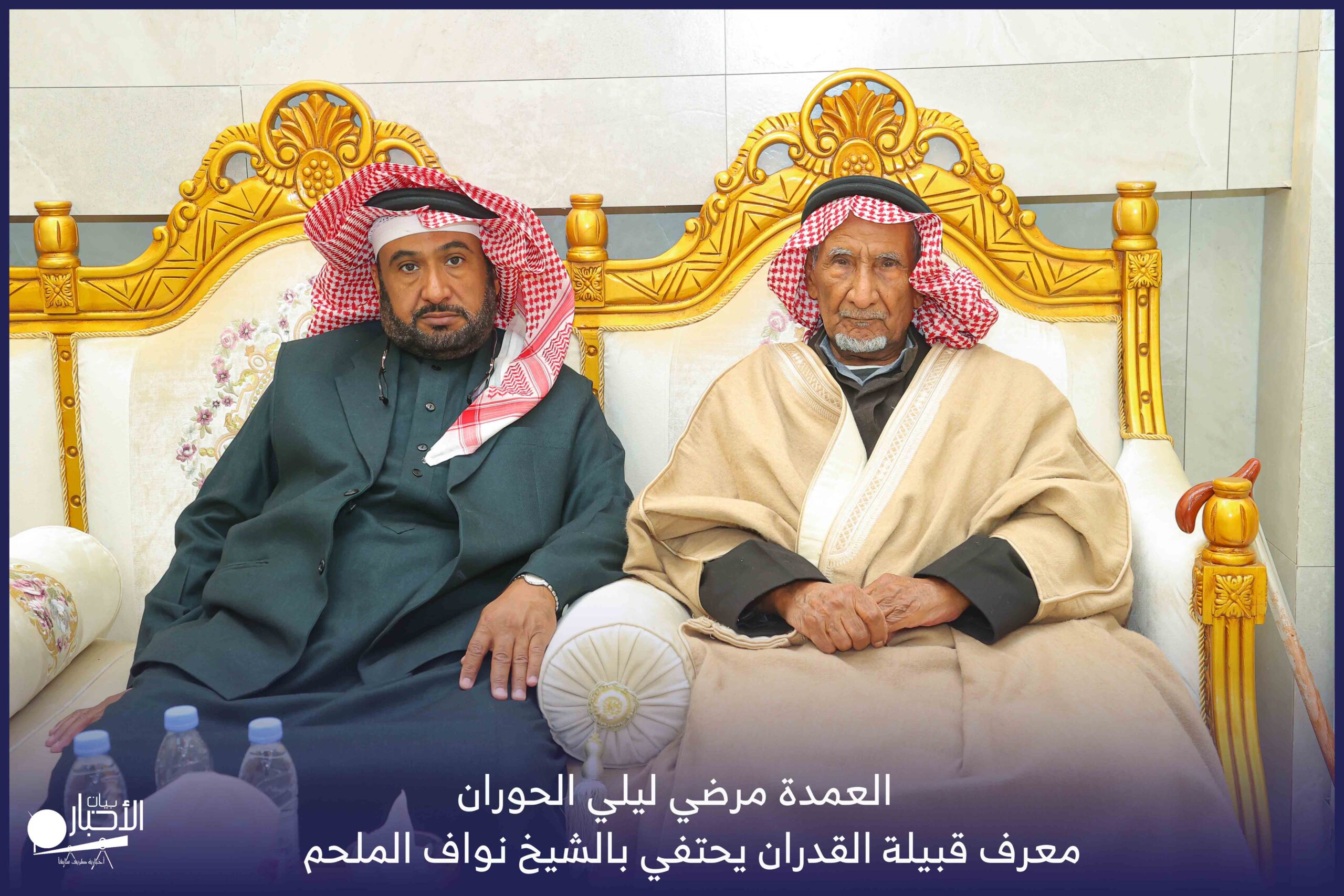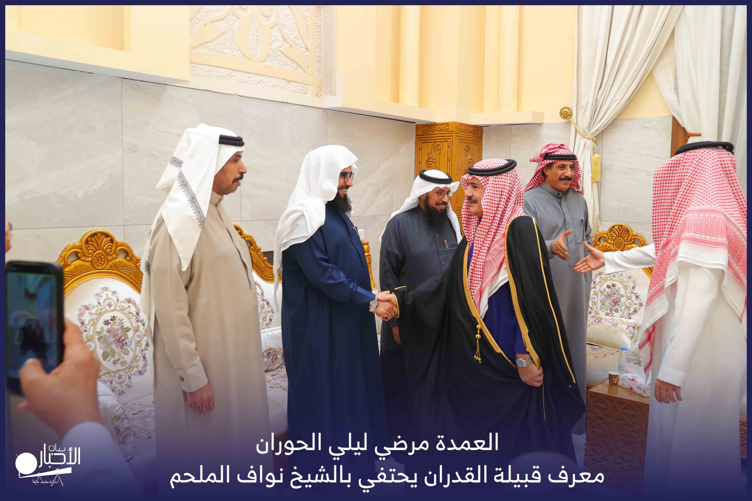 احتفى العمدة مرضي ليلي الحوران معرف قبيلة القدران بالشيخ نواف عبدالعزيز طراد الملحم، وذلك تزامناً مع زيارته لمحافظة طريف، وذلك وسط ترحيب كبير وحضور عدد من المشايخ ووجهاء المحافظة.