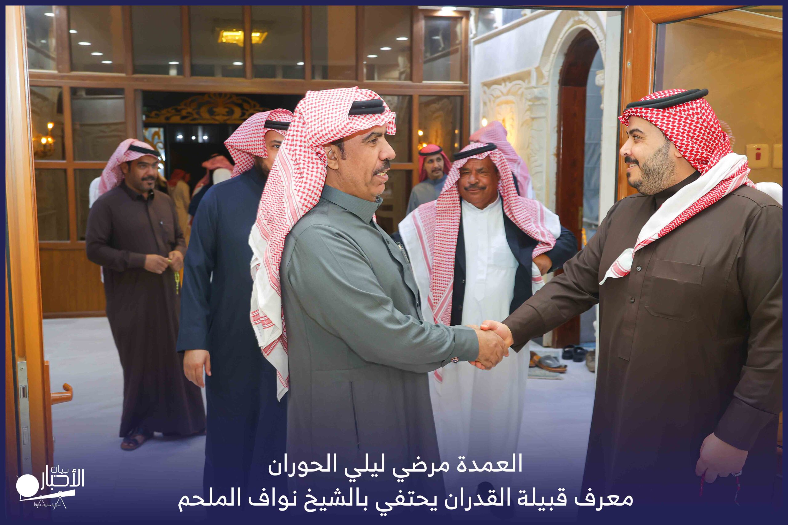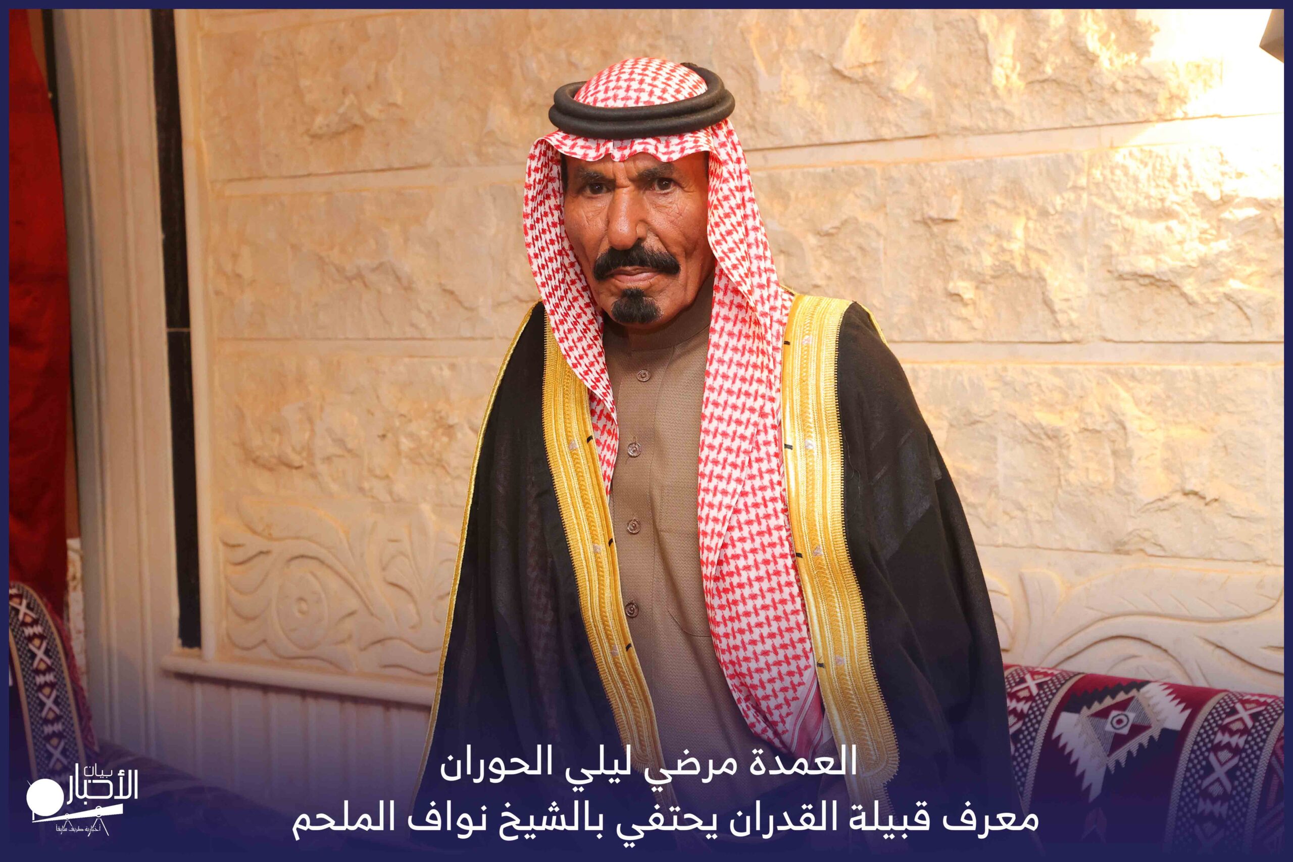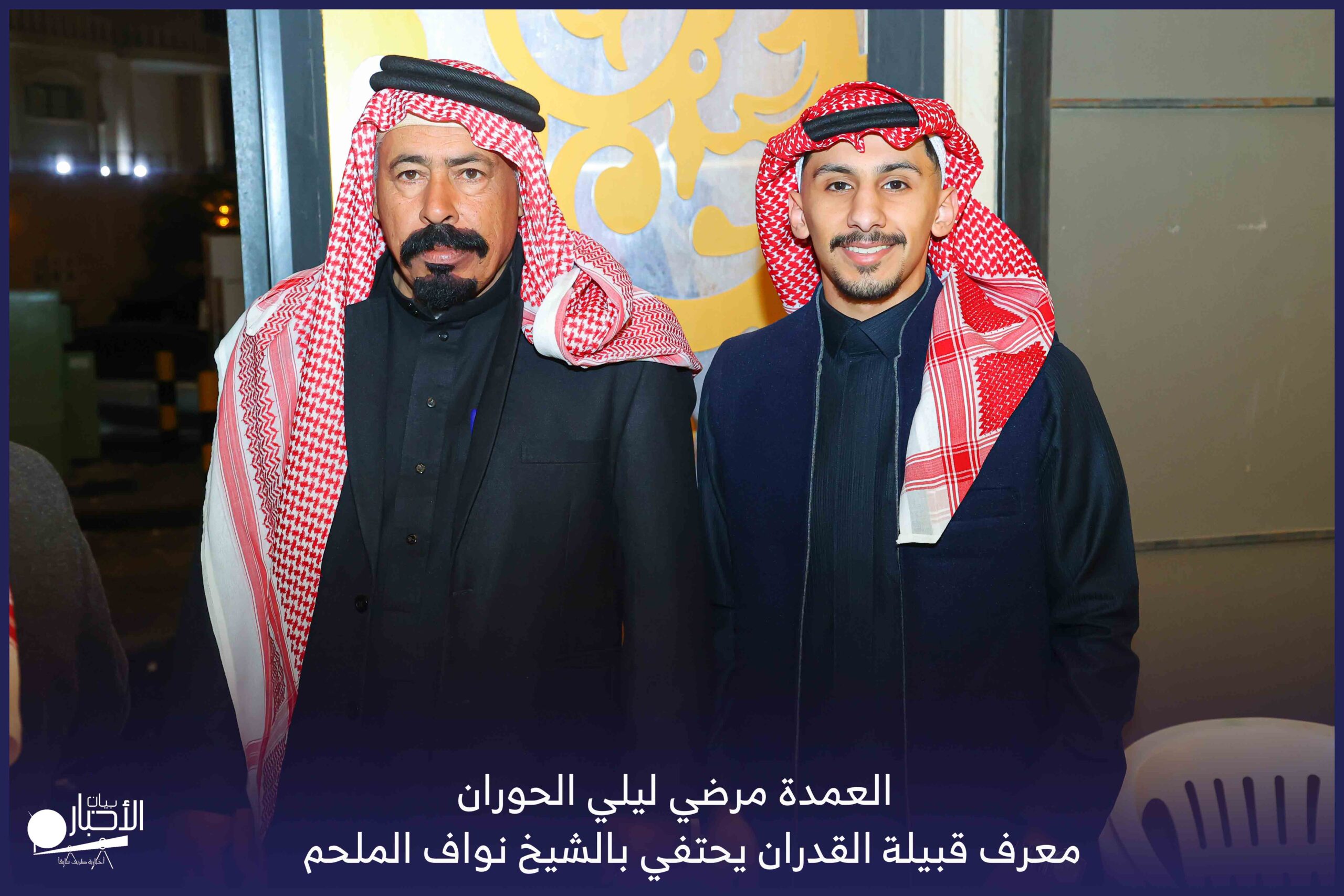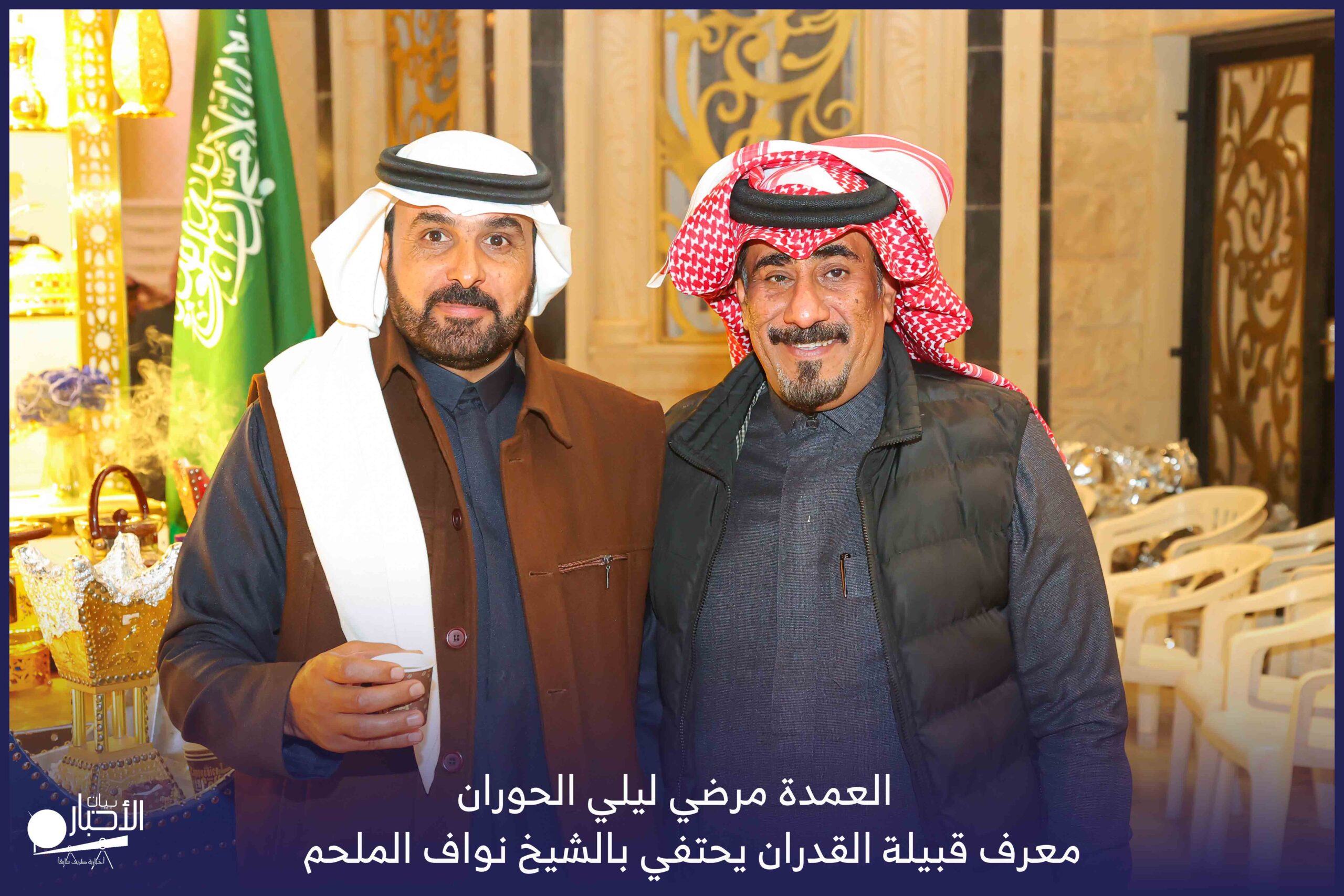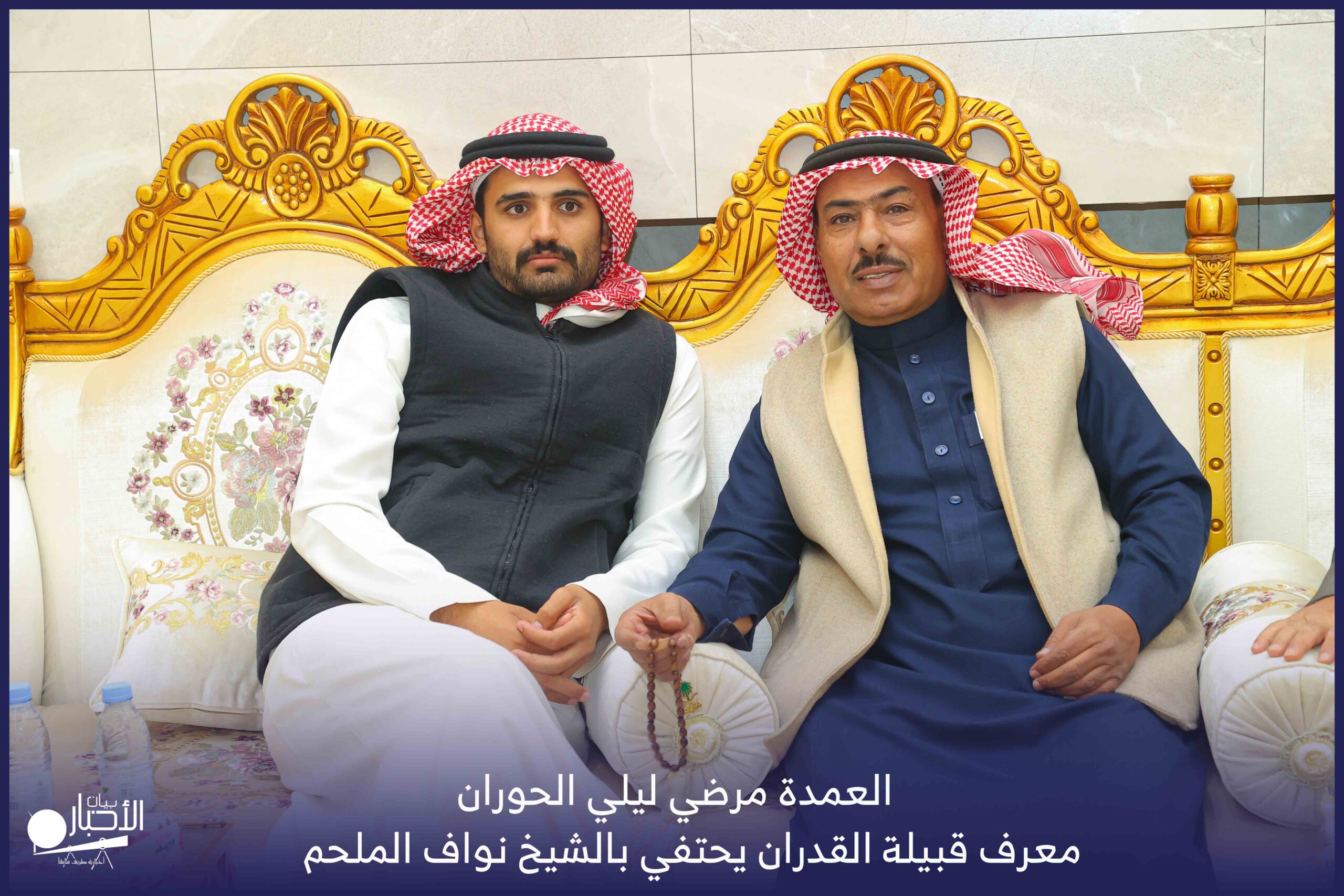 احتفى العمدة مرضي ليلي الحوران معرف قبيلة القدران بالشيخ نواف عبدالعزيز طراد الملحم، وذلك تزامناً مع زيارته لمحافظة طريف، وذلك وسط ترحيب كبير وحضور عدد من المشايخ ووجهاء المحافظة.