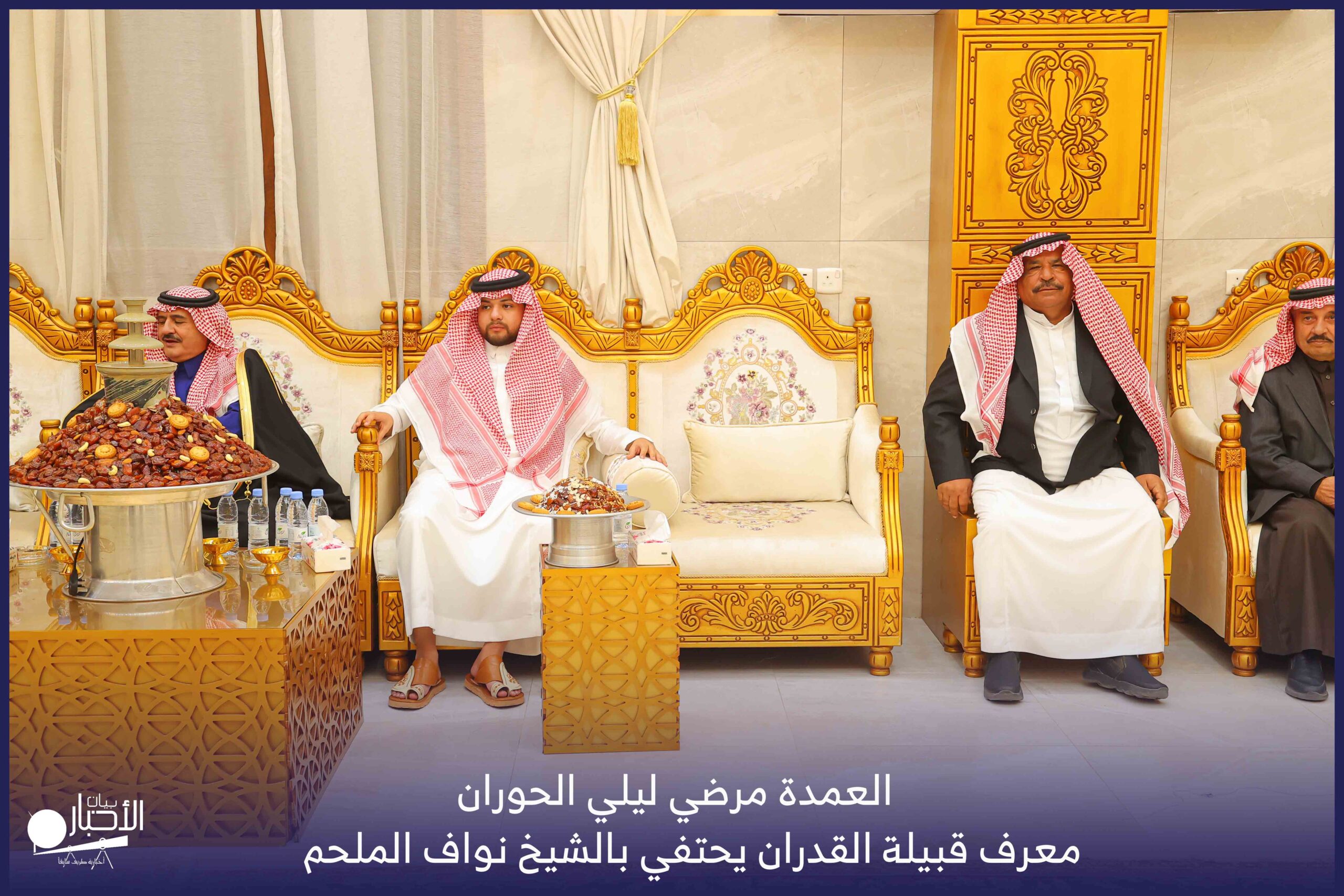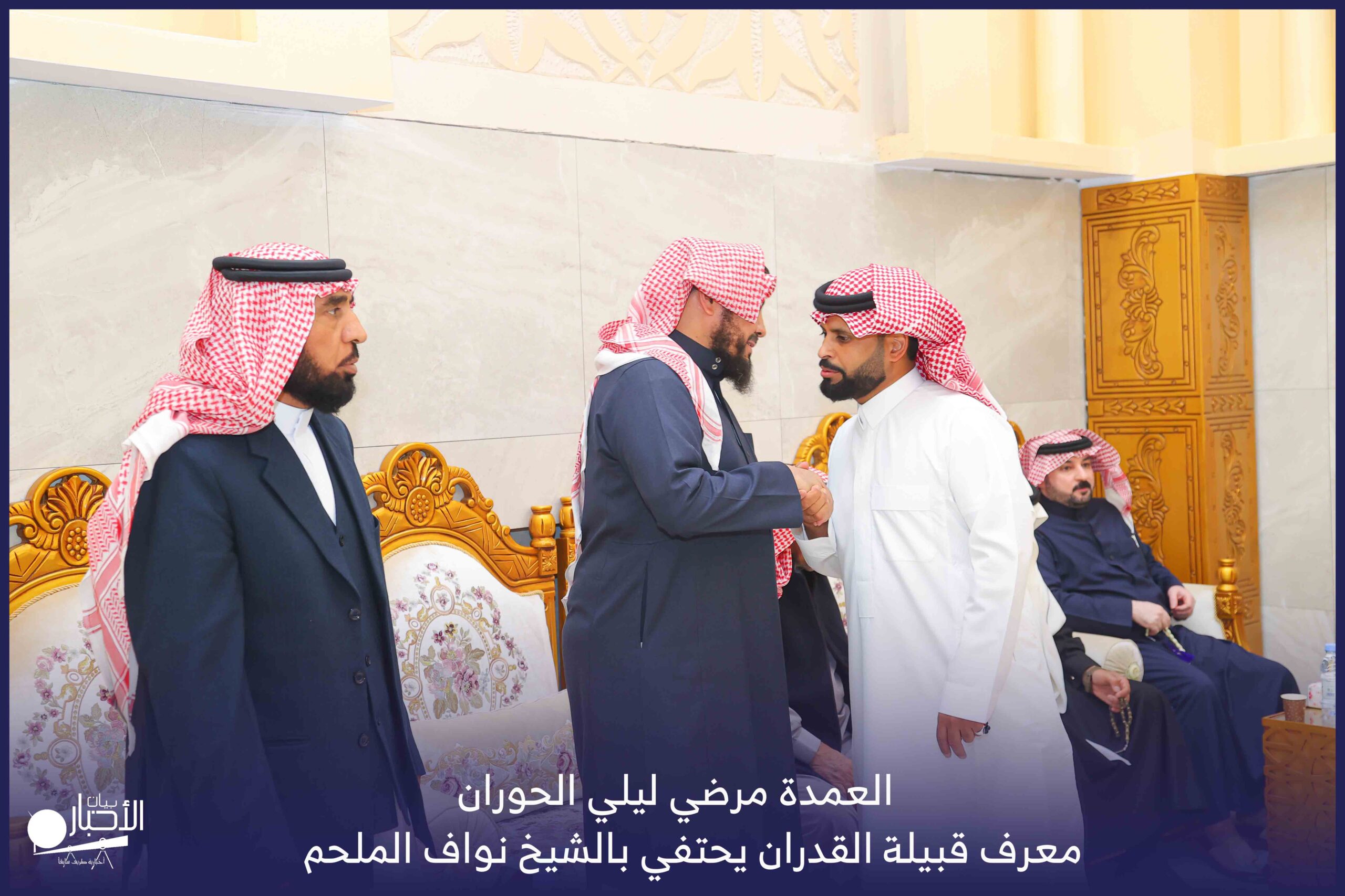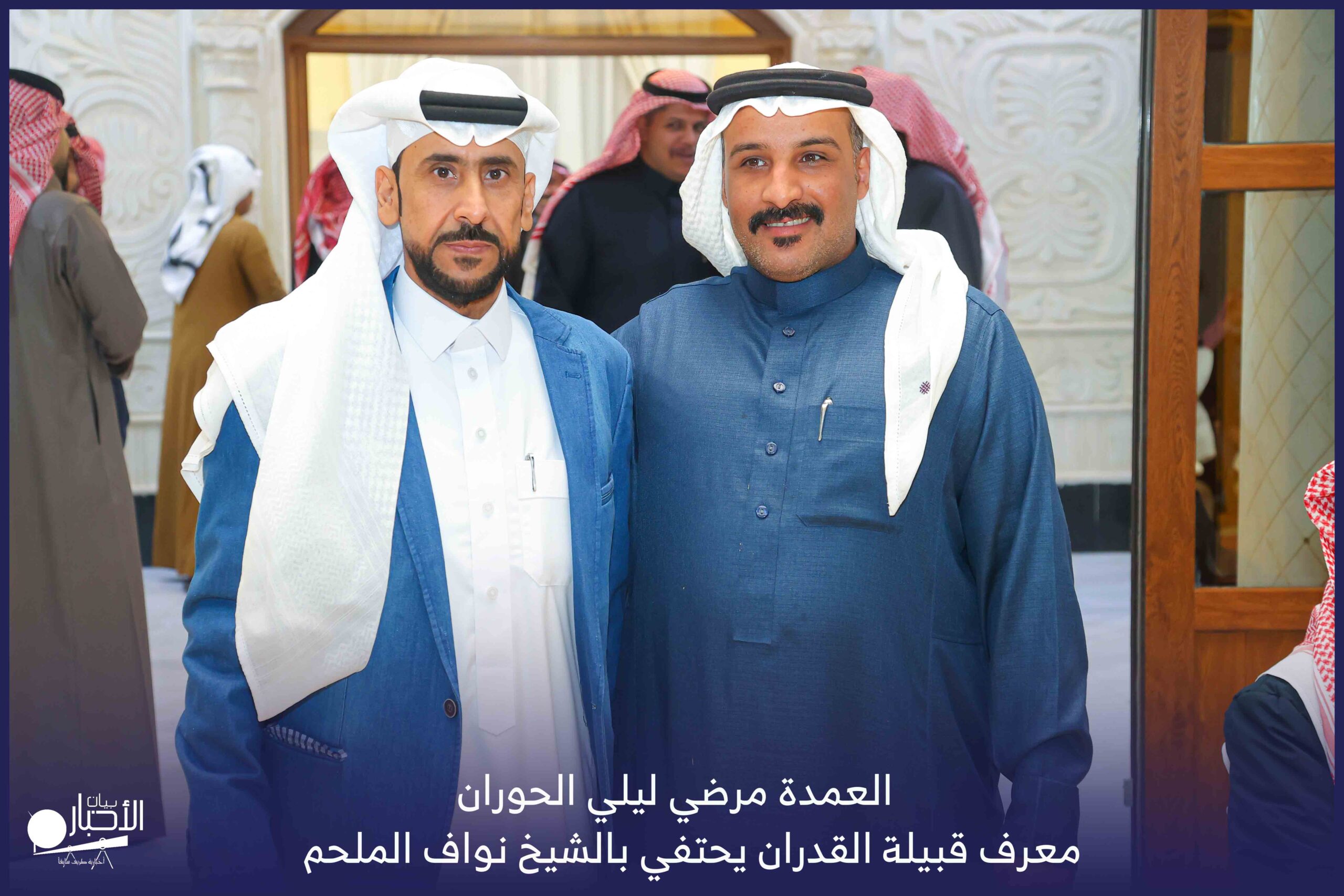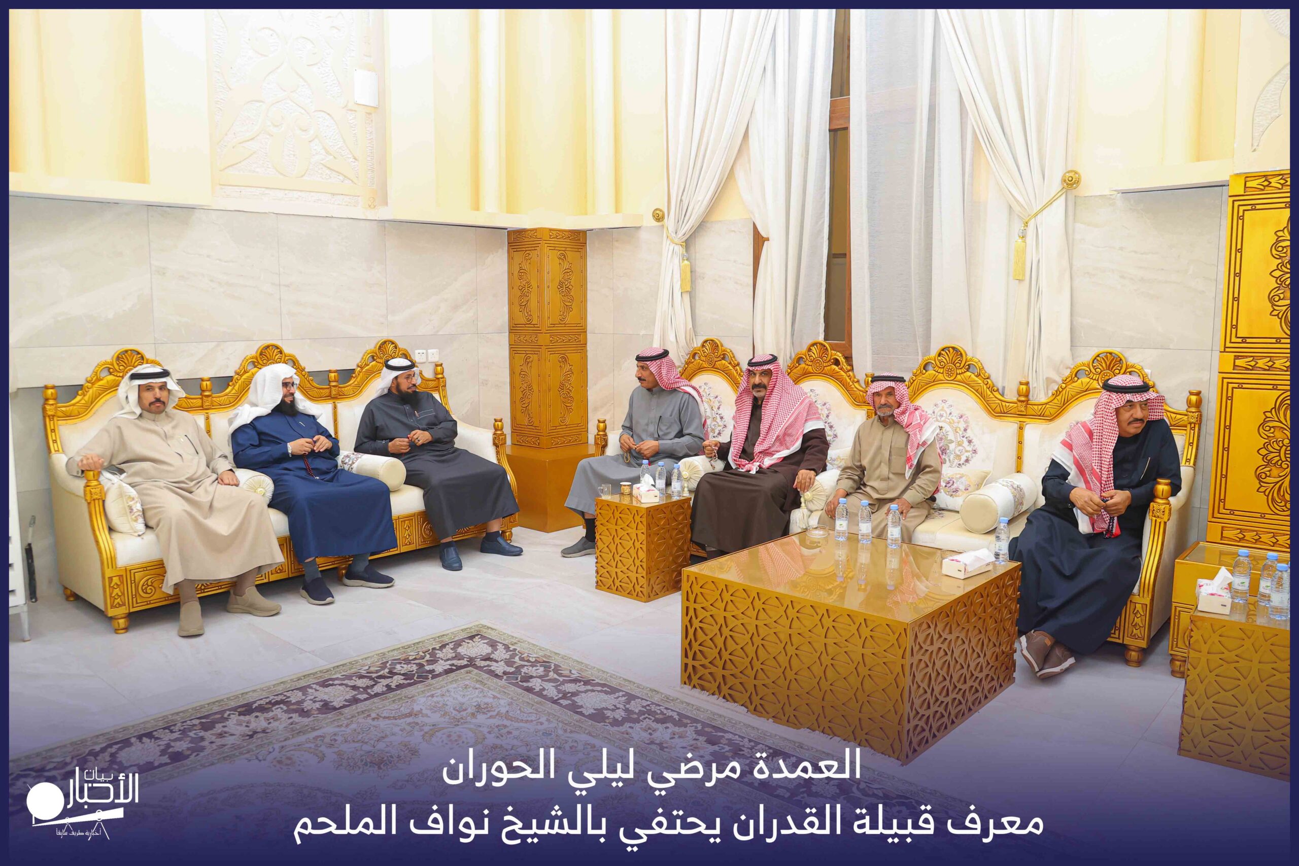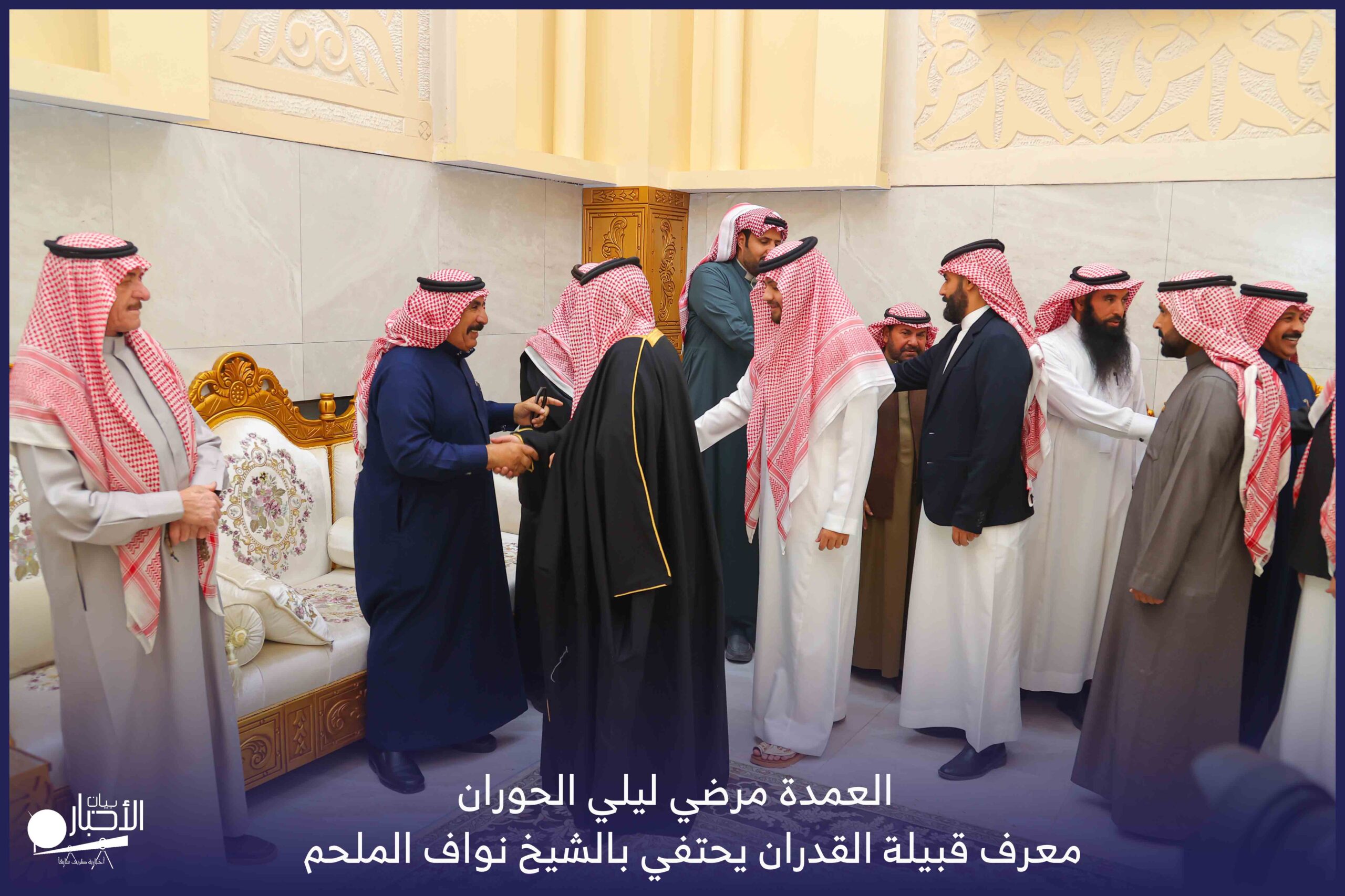احتفى العمدة مرضي ليلي الحوران معرف قبيلة القدران بالشيخ نواف عبدالعزيز طراد الملحم، وذلك تزامناً مع زيارته لمحافظة طريف، وذلك وسط ترحيب كبير وحضور عدد من المشايخ ووجهاء المحافظة.