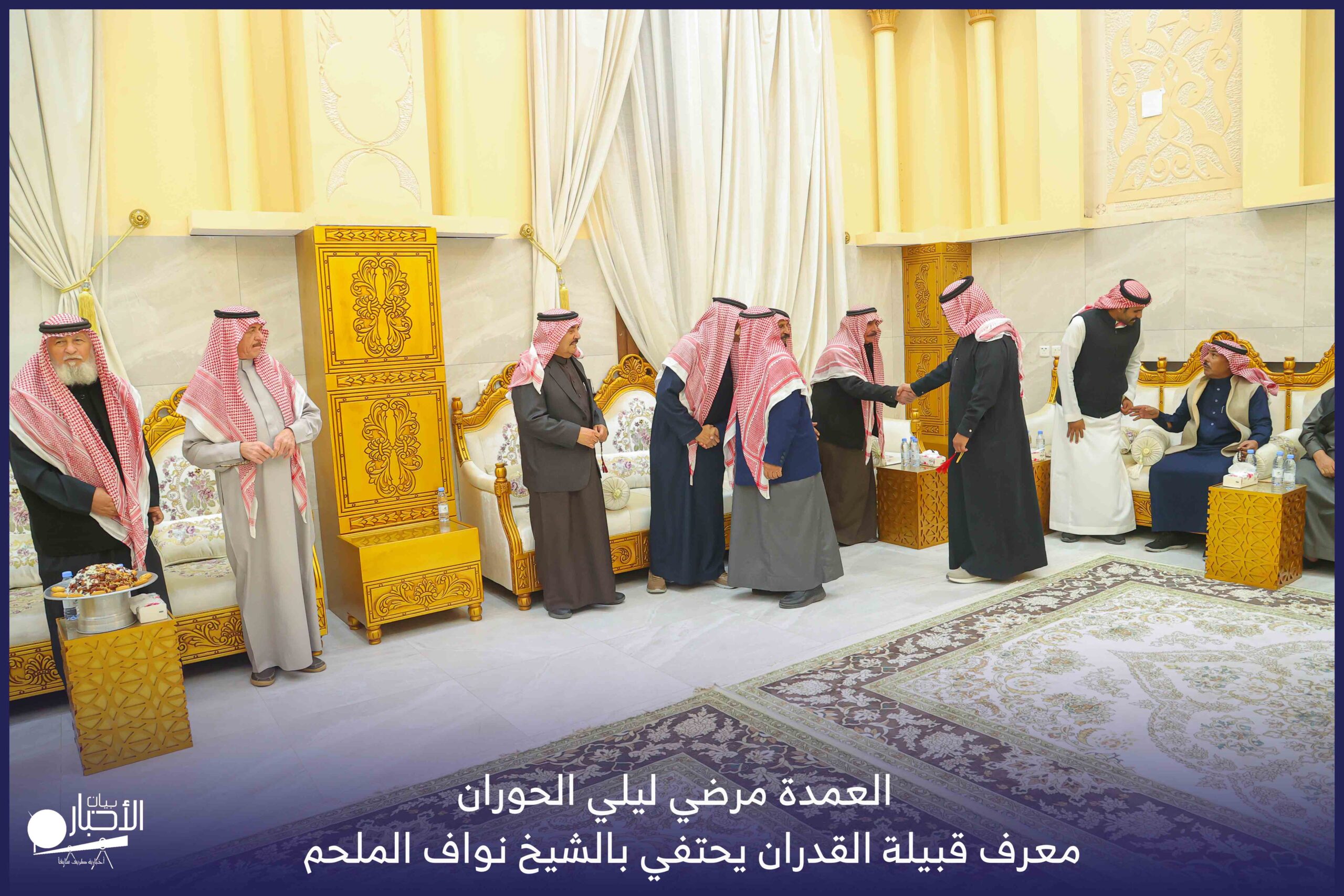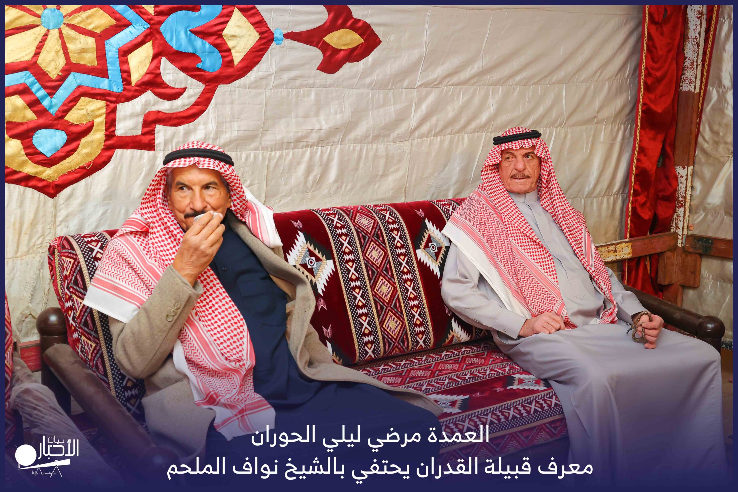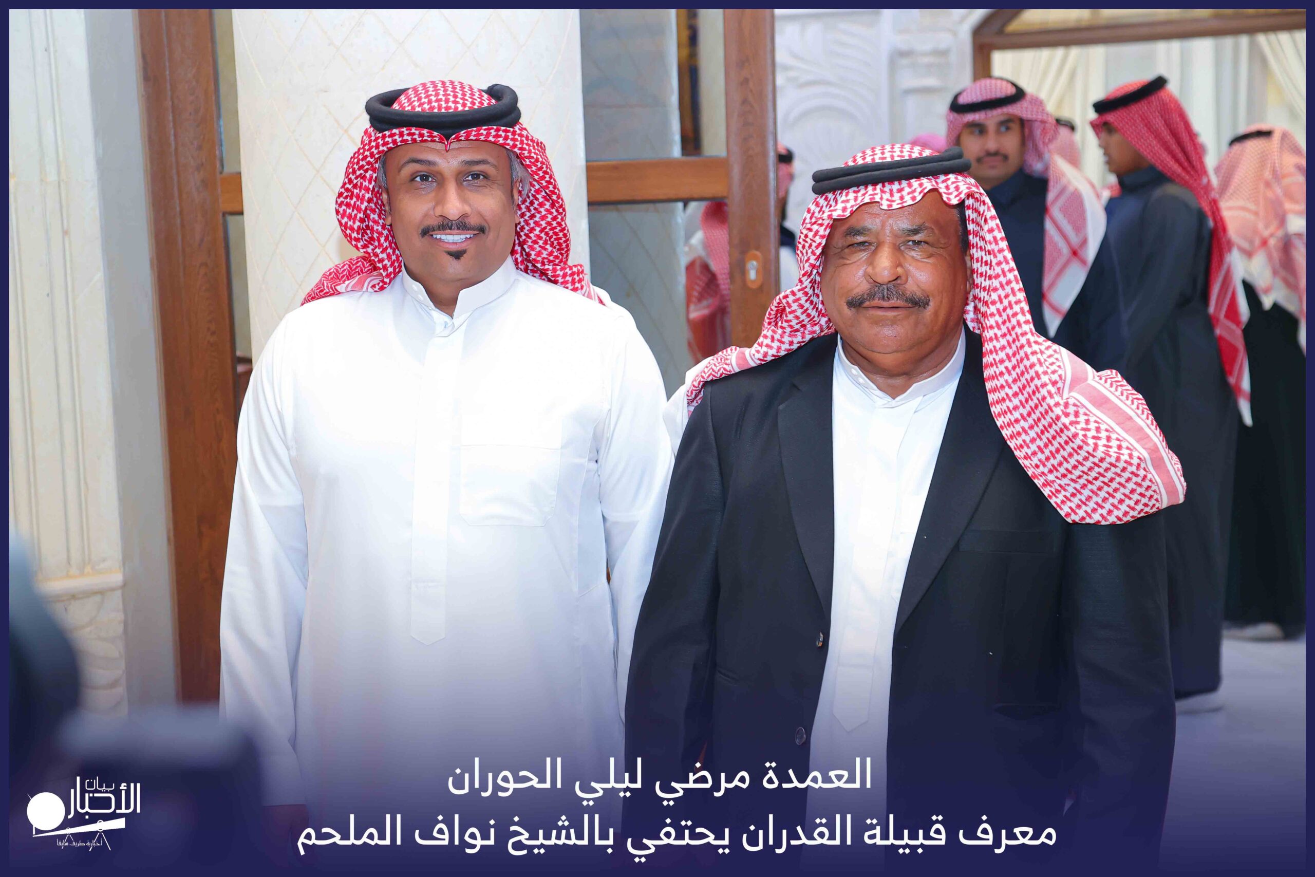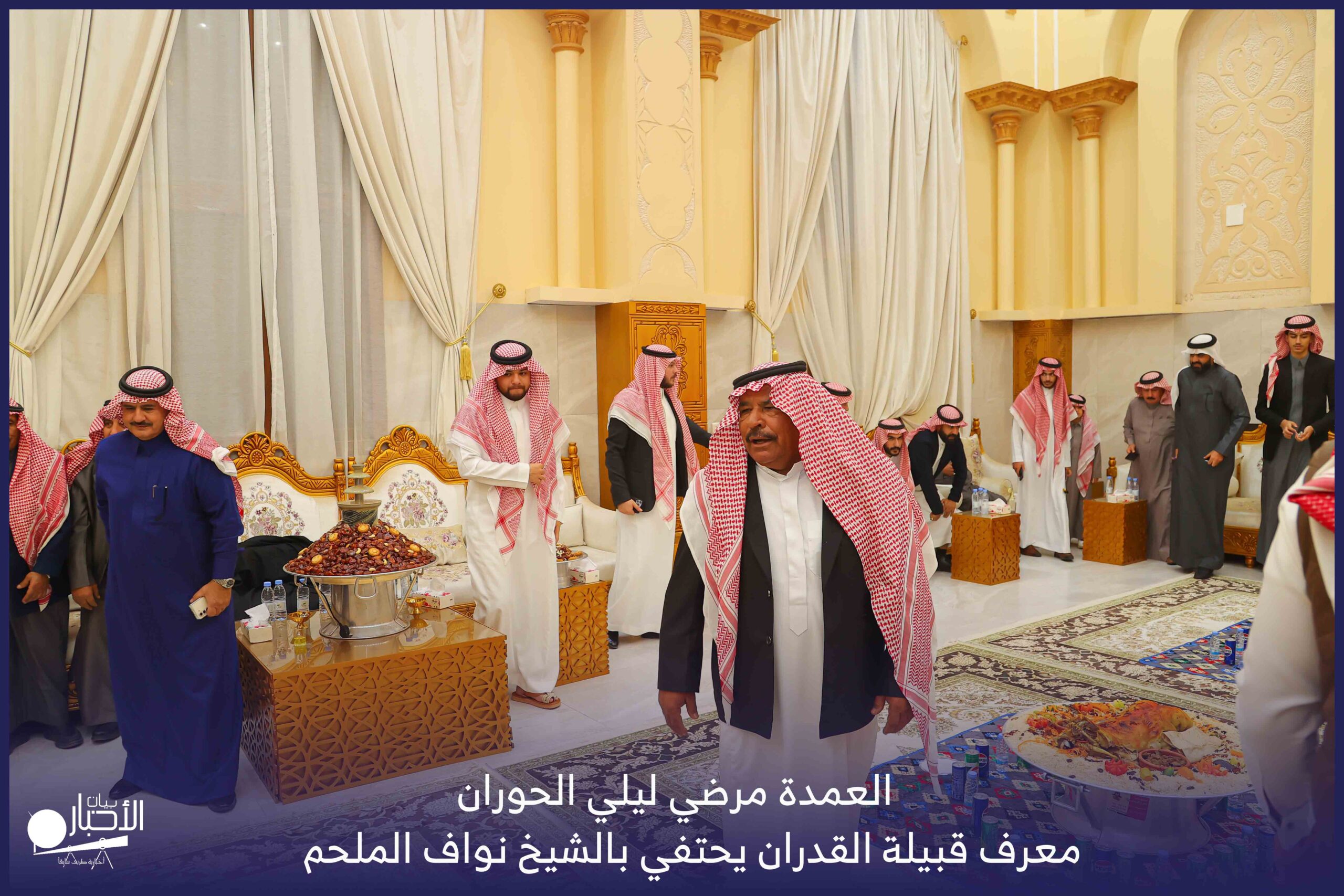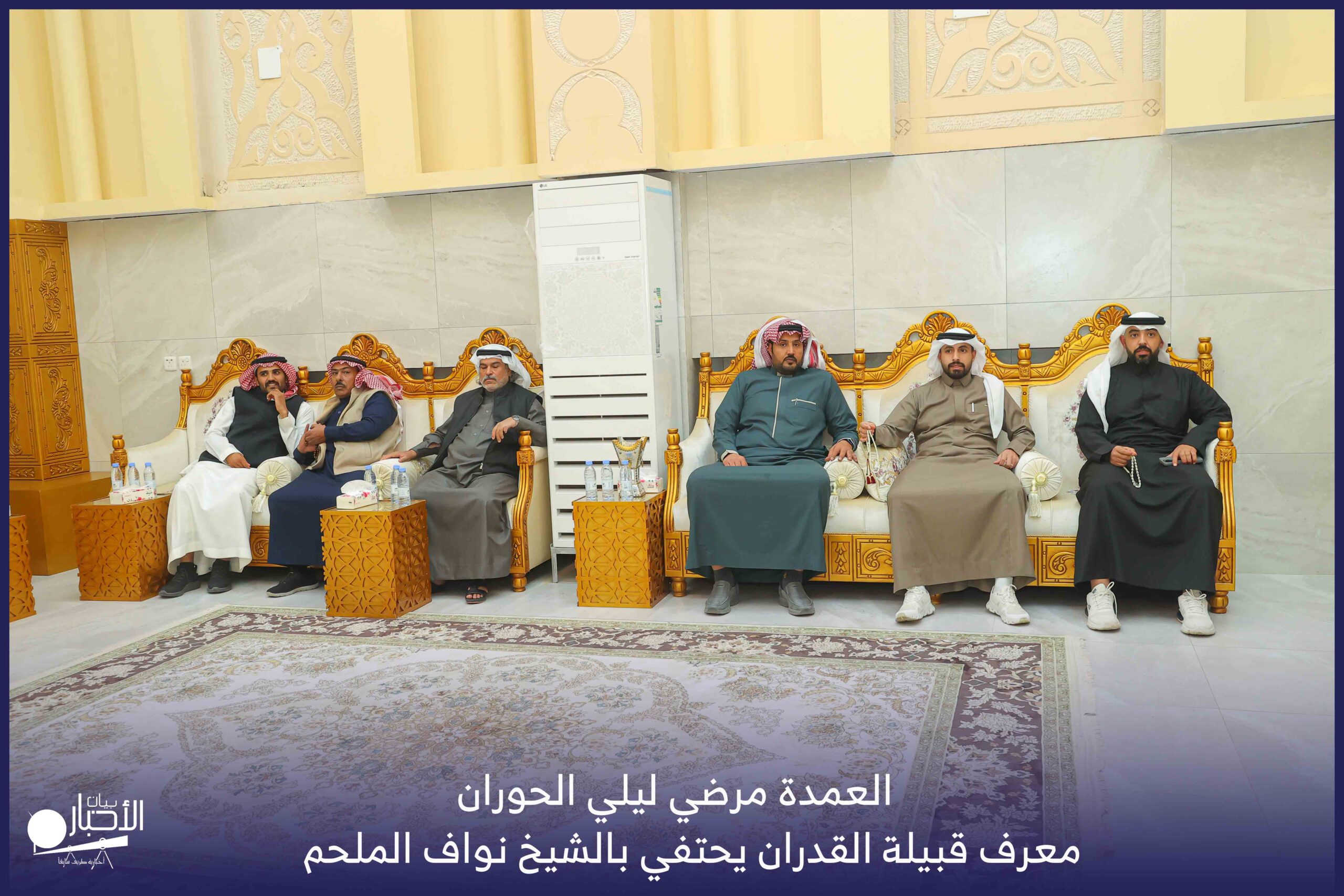 احتفى العمدة مرضي ليلي الحوران معرف قبيلة القدران بالشيخ نواف عبدالعزيز طراد الملحم، وذلك تزامناً مع زيارته لمحافظة طريف، وذلك وسط ترحيب كبير وحضور عدد من المشايخ ووجهاء المحافظة.
