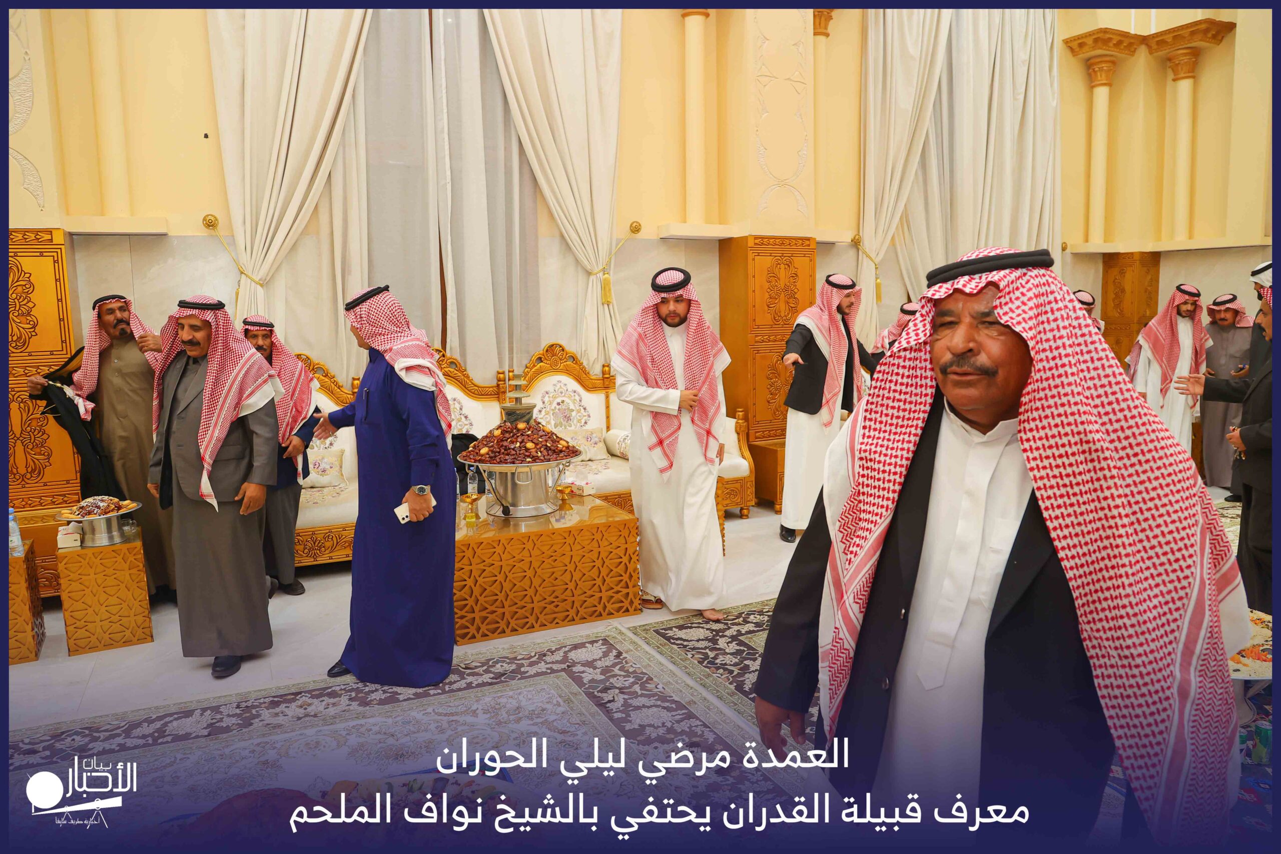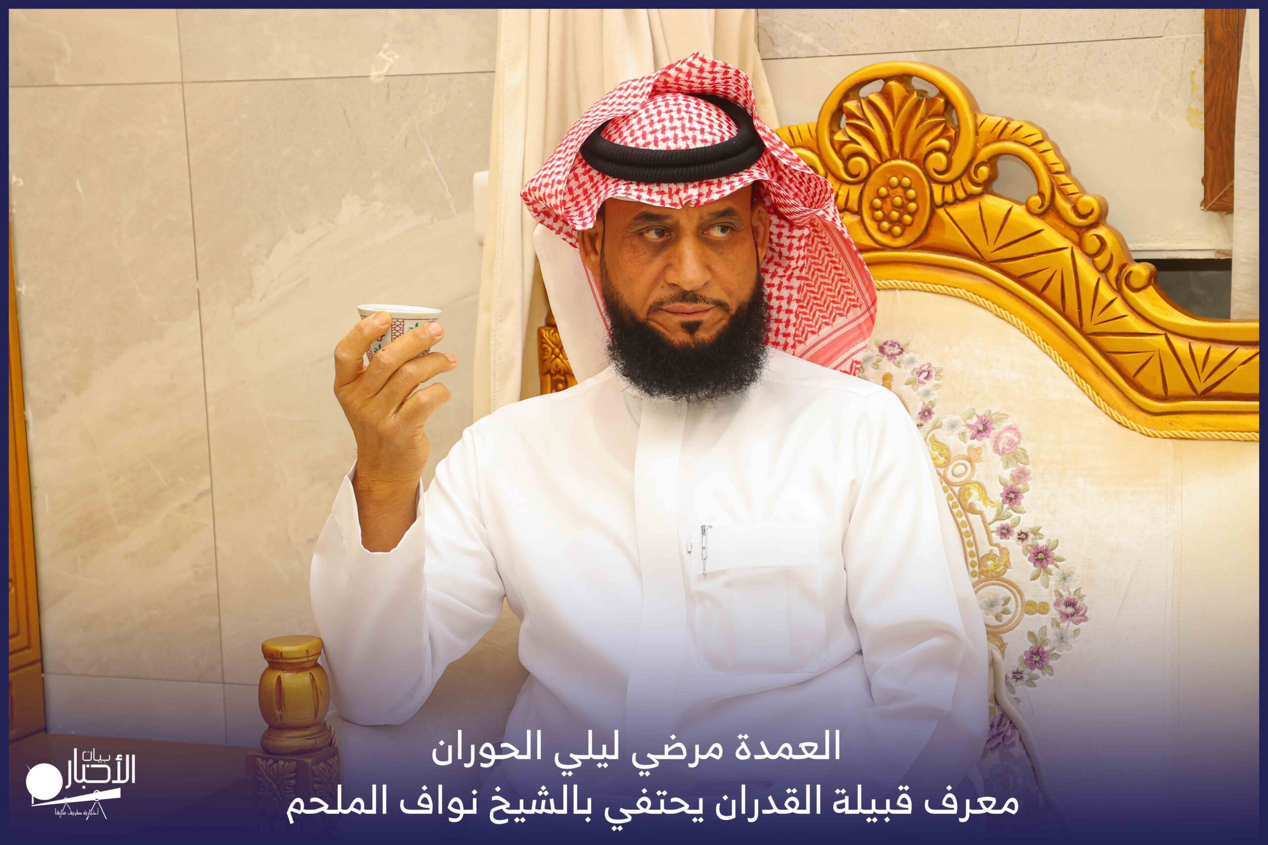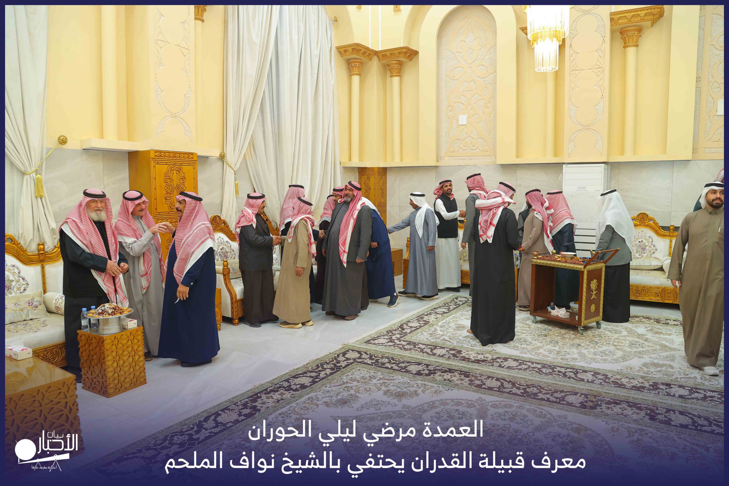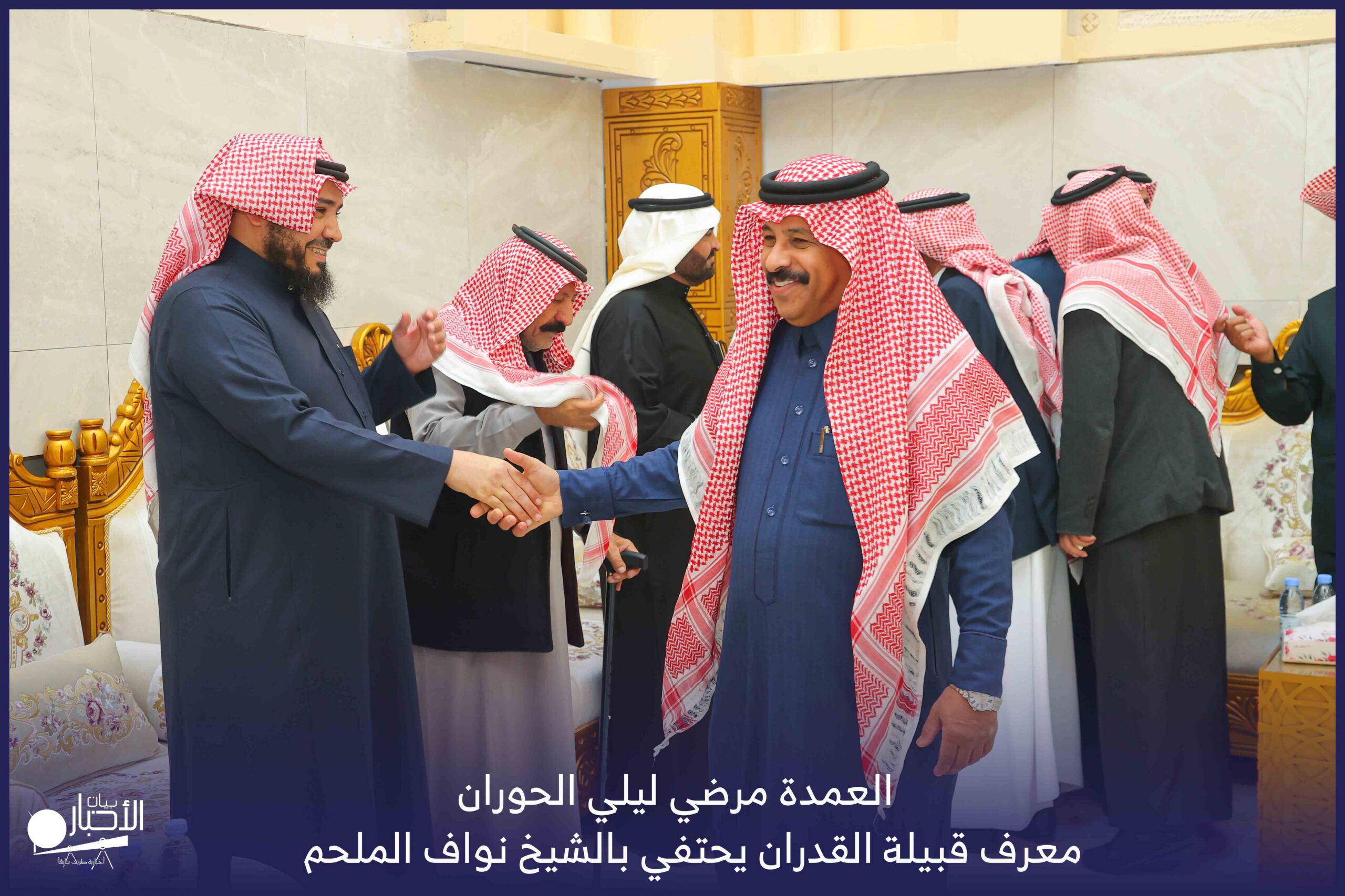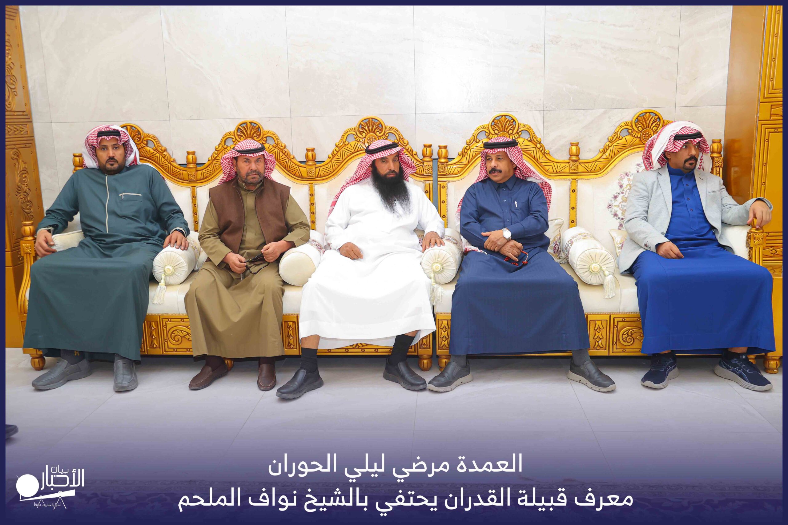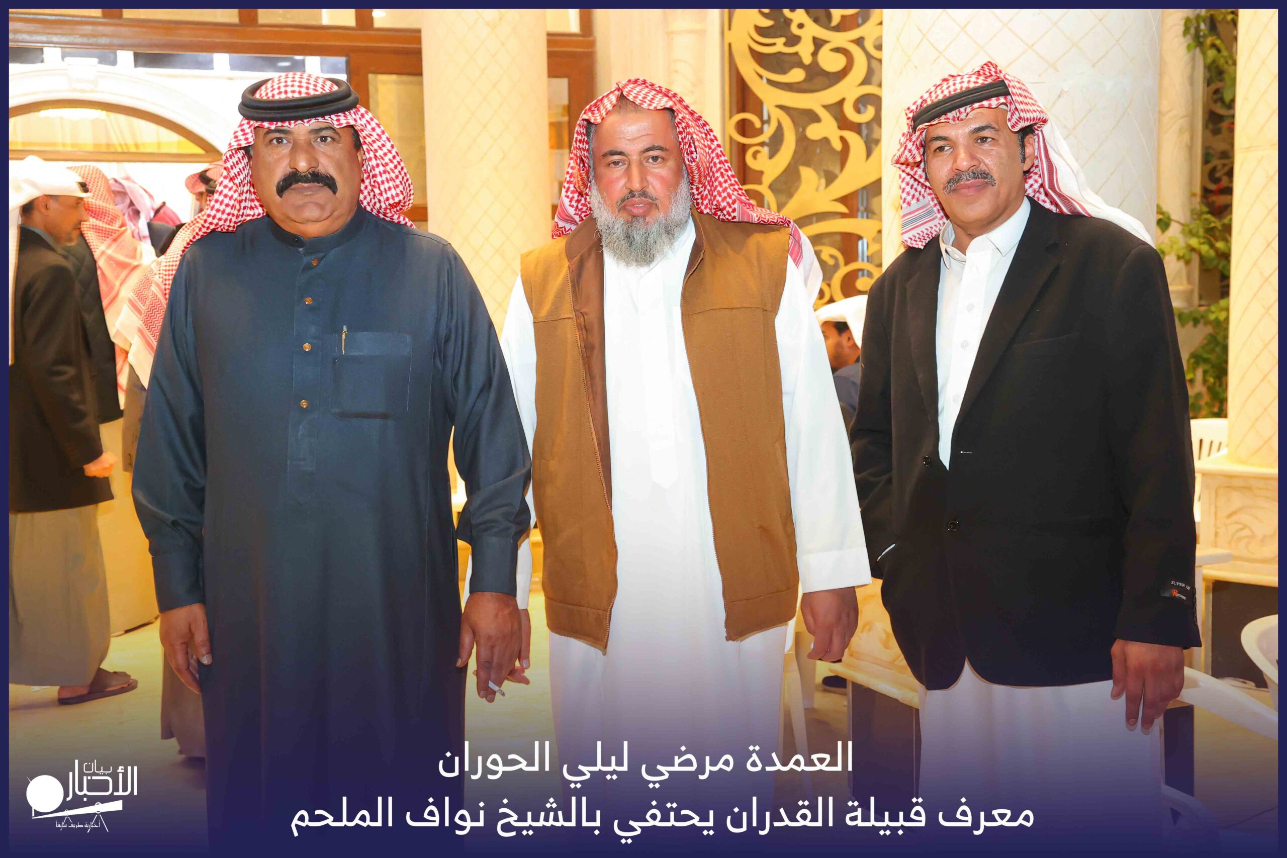 احتفى العمدة مرضي ليلي الحوران معرف قبيلة القدران بالشيخ نواف عبدالعزيز طراد الملحم، وذلك تزامناً مع زيارته لمحافظة طريف، وذلك وسط ترحيب كبير وحضور عدد من المشايخ ووجهاء المحافظة.