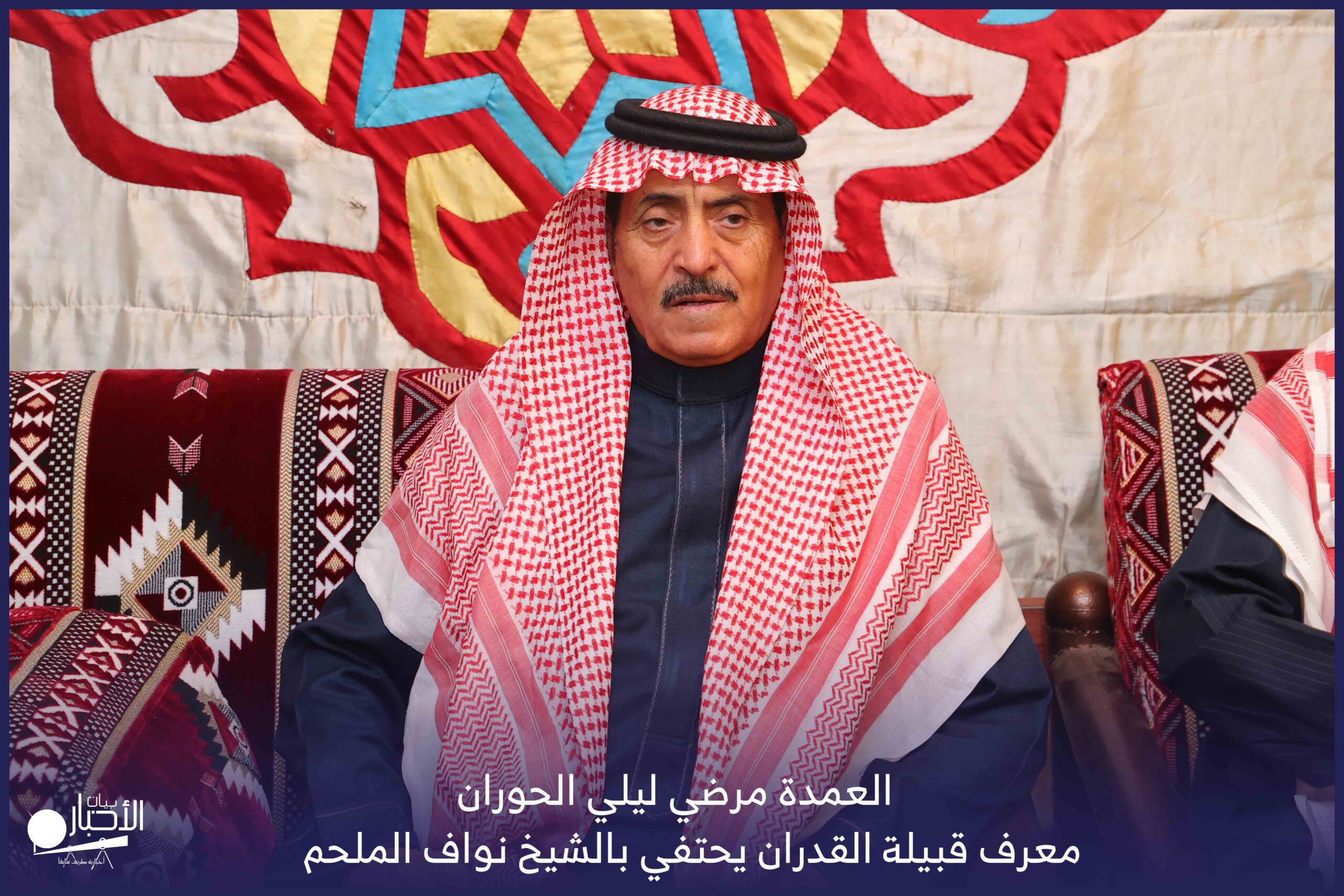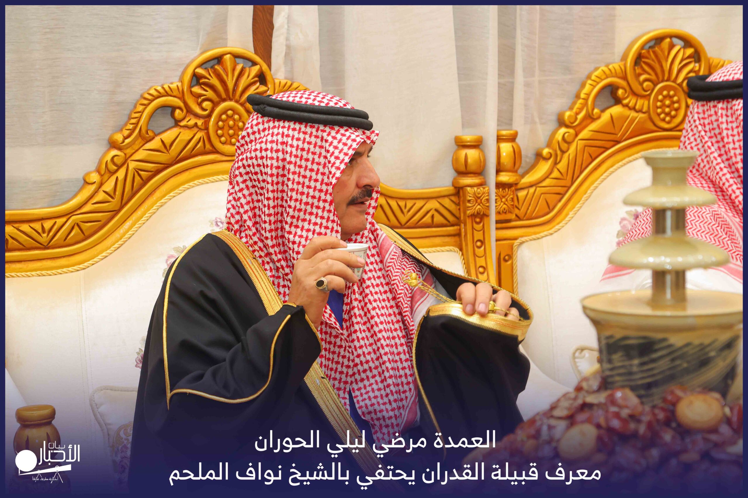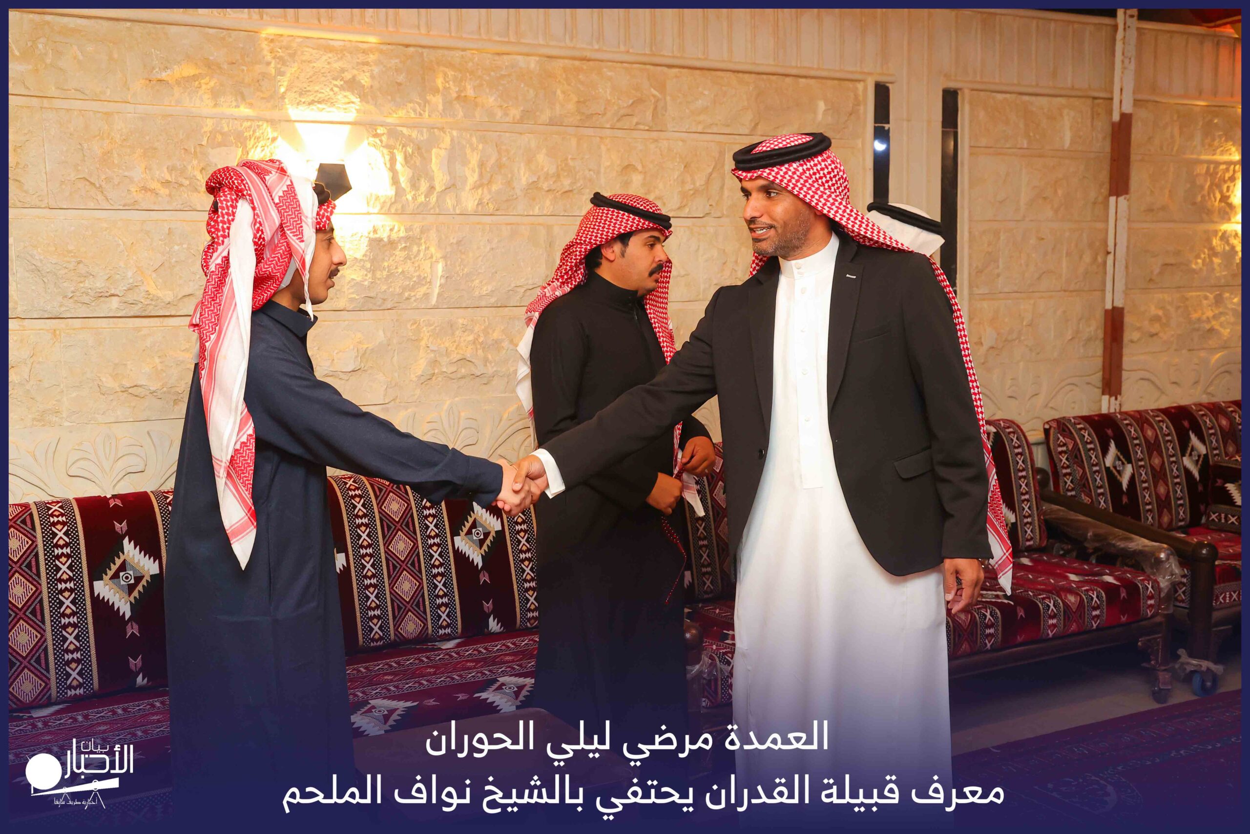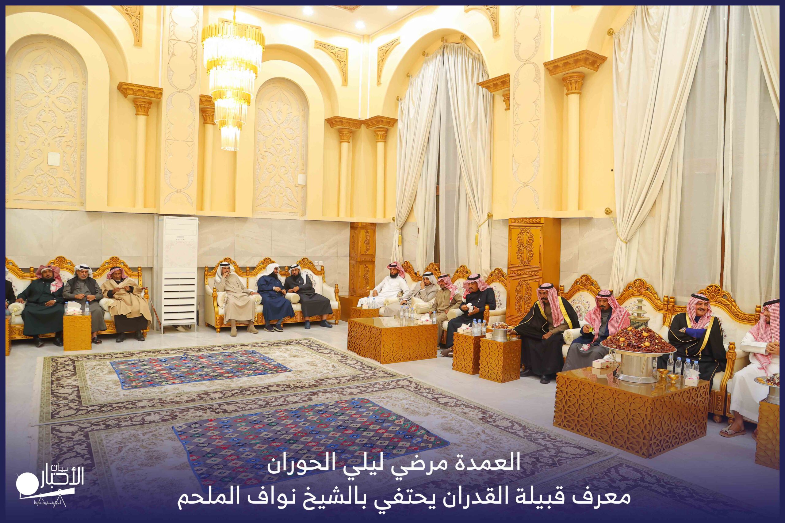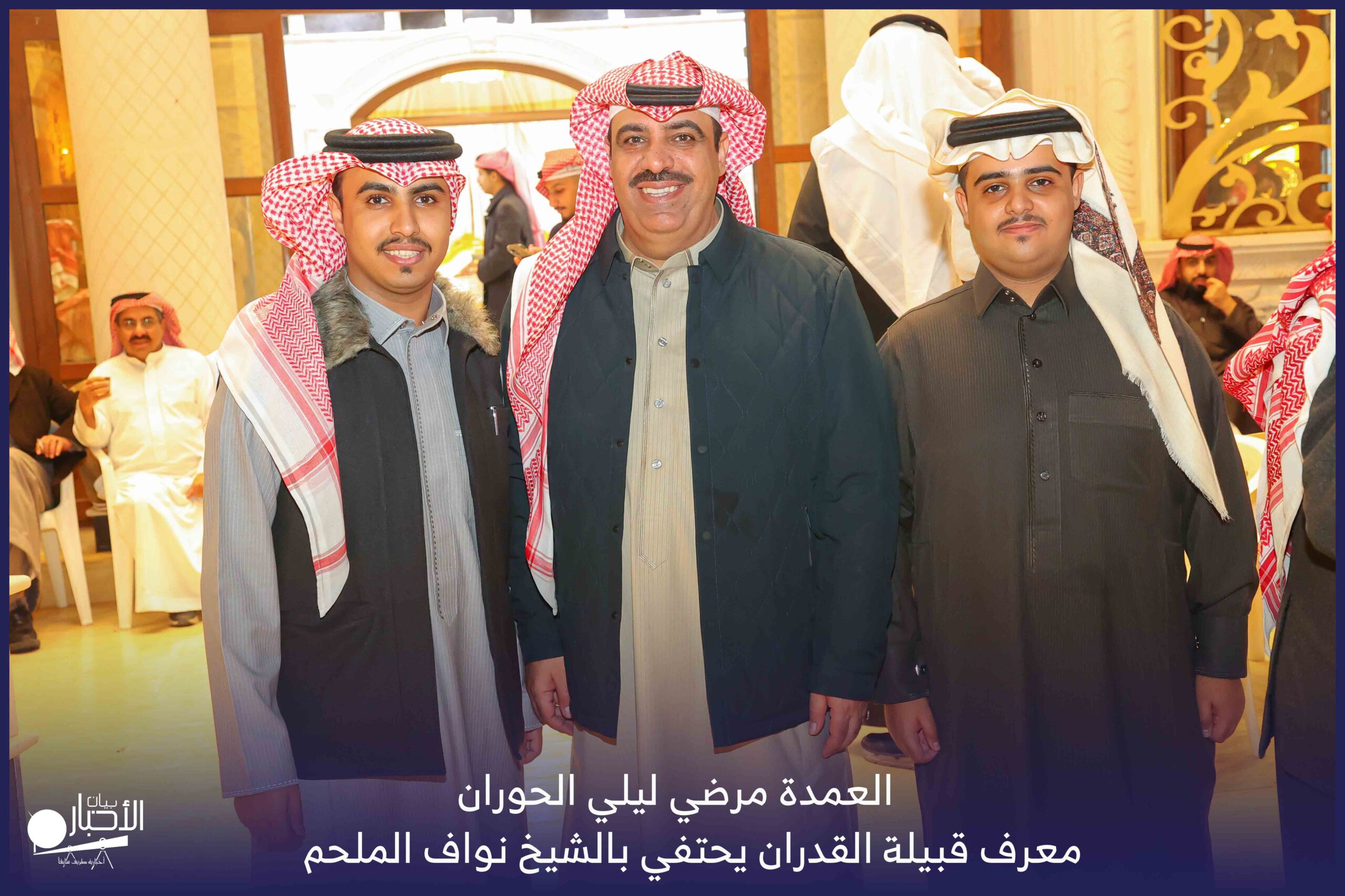 احتفى العمدة مرضي ليلي الحوران معرف قبيلة القدران بالشيخ نواف عبدالعزيز طراد الملحم، وذلك تزامناً مع زيارته لمحافظة طريف، وذلك وسط ترحيب كبير وحضور عدد من المشايخ ووجهاء المحافظة.