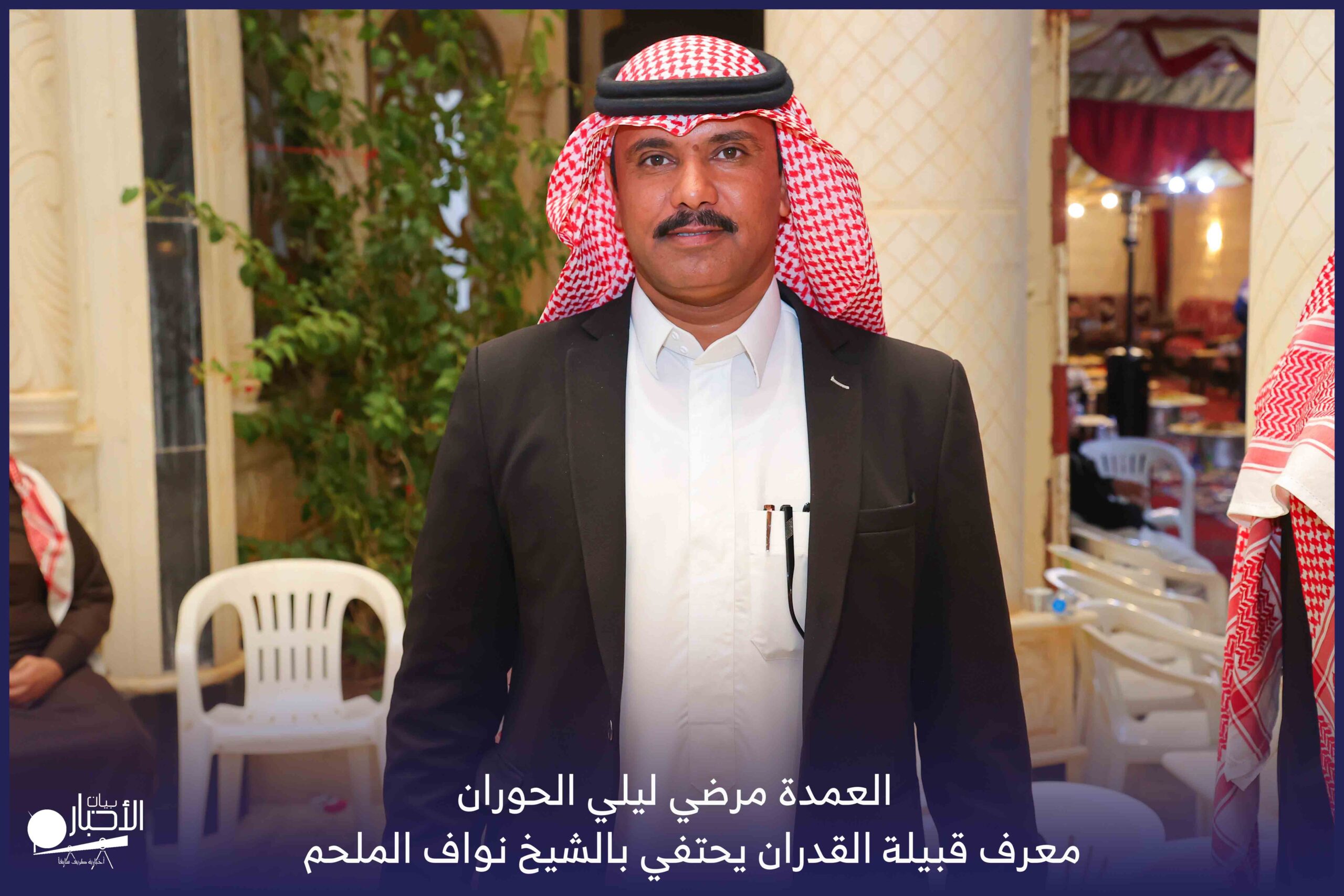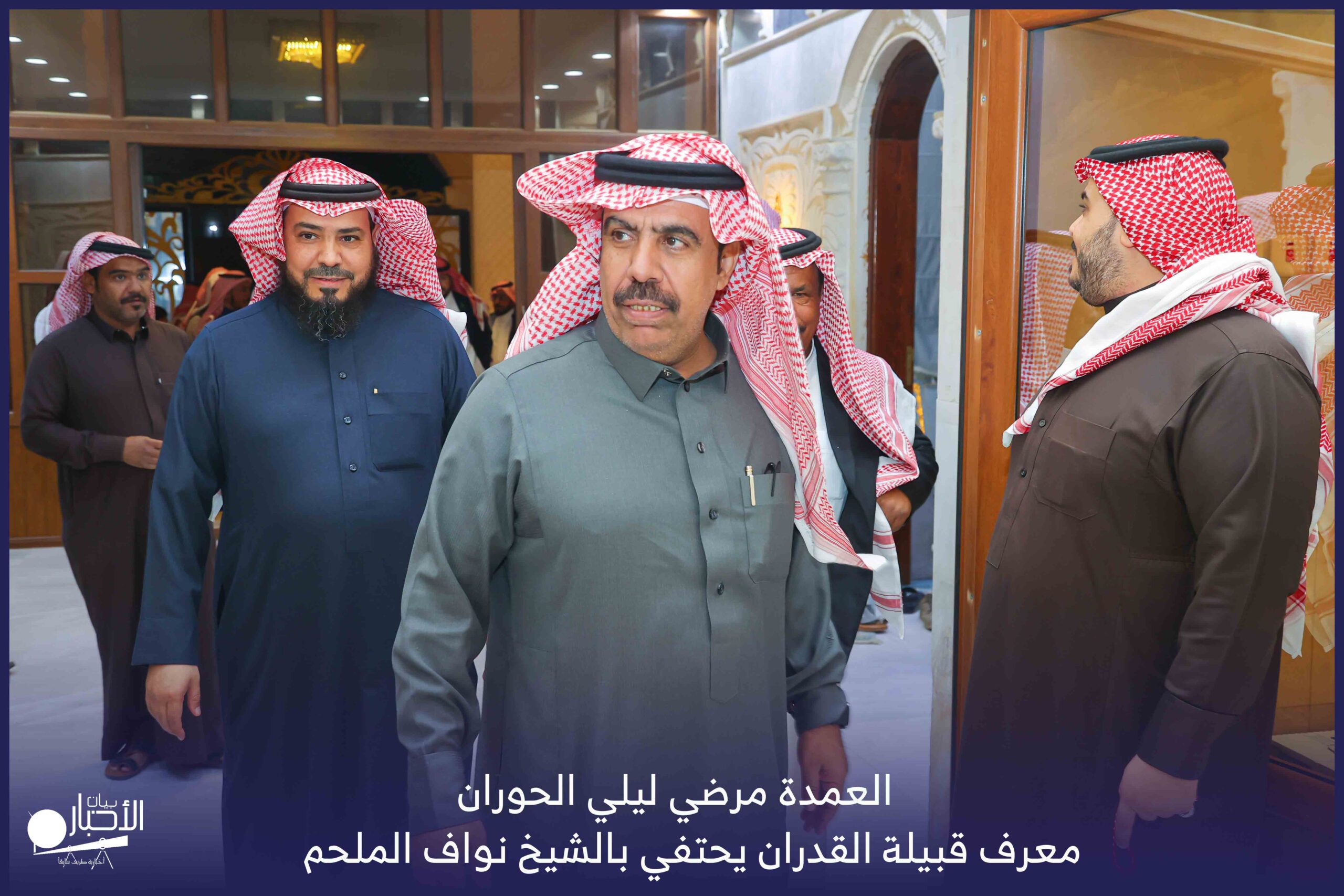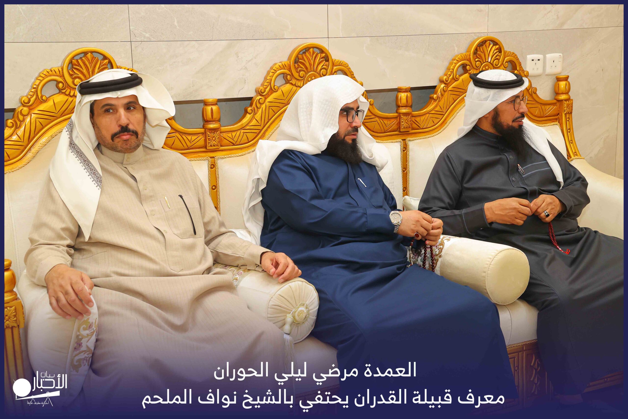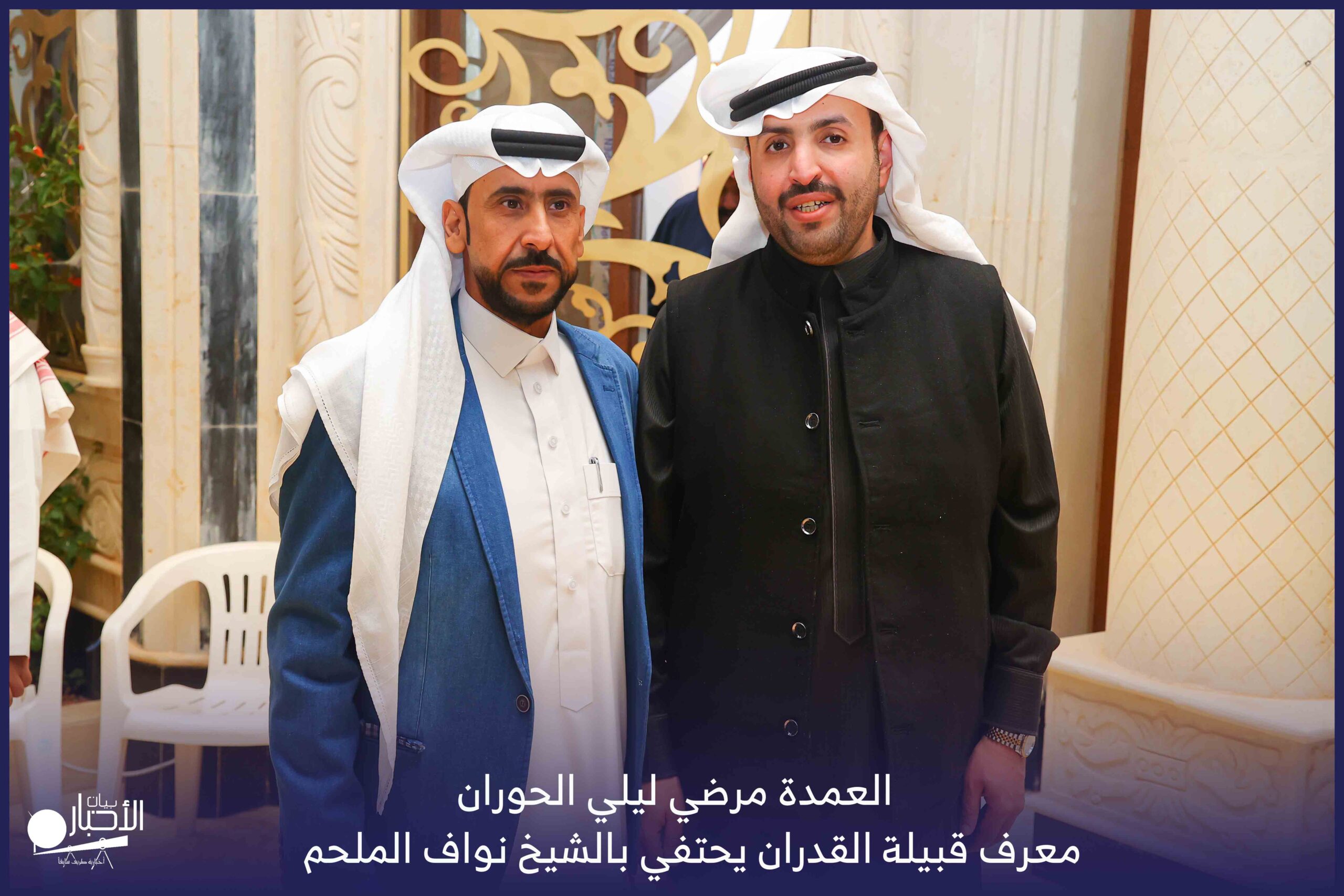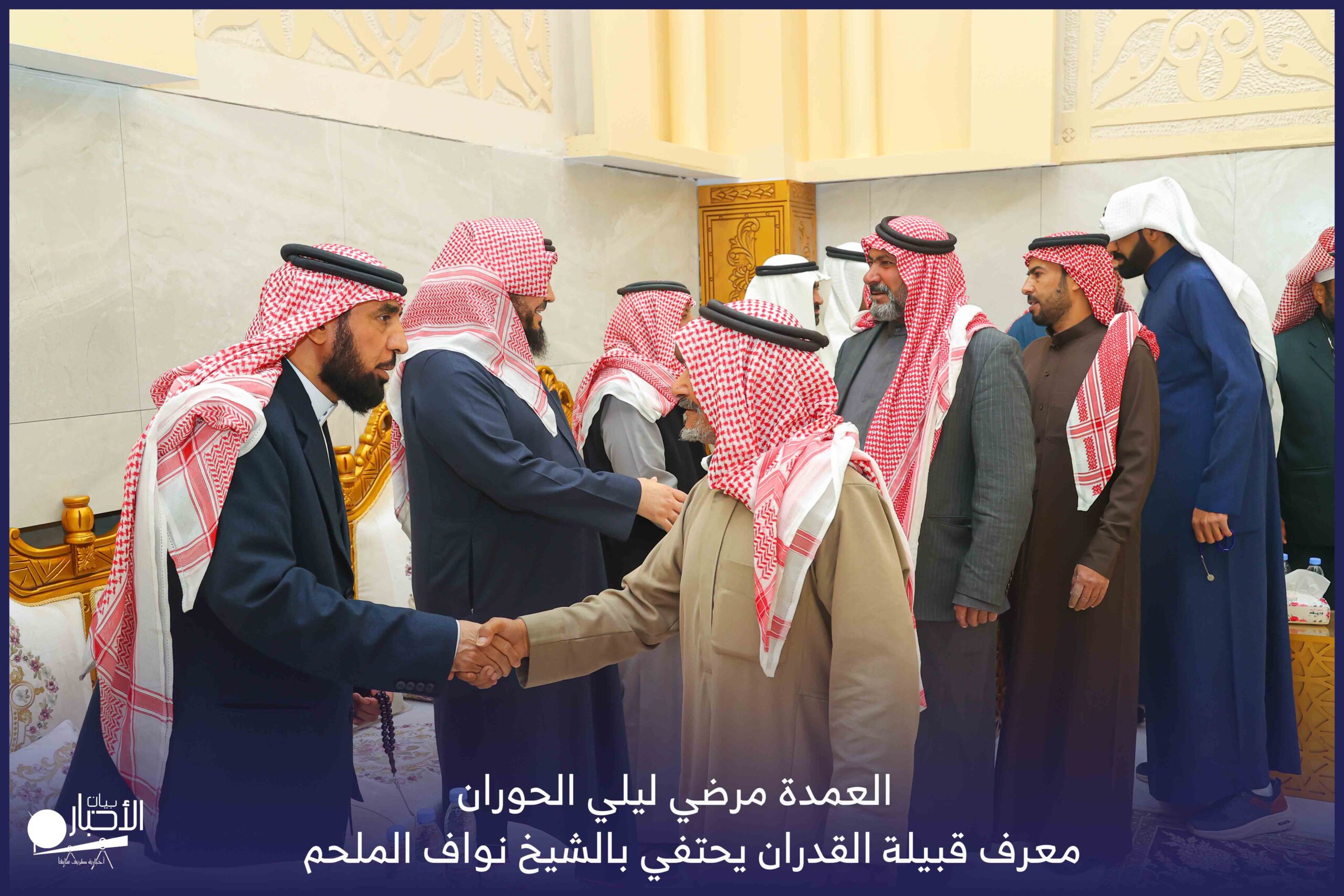 احتفى العمدة مرضي ليلي الحوران معرف قبيلة القدران بالشيخ نواف عبدالعزيز طراد الملحم، وذلك تزامناً مع زيارته لمحافظة طريف، وذلك وسط ترحيب كبير وحضور عدد من المشايخ ووجهاء المحافظة.