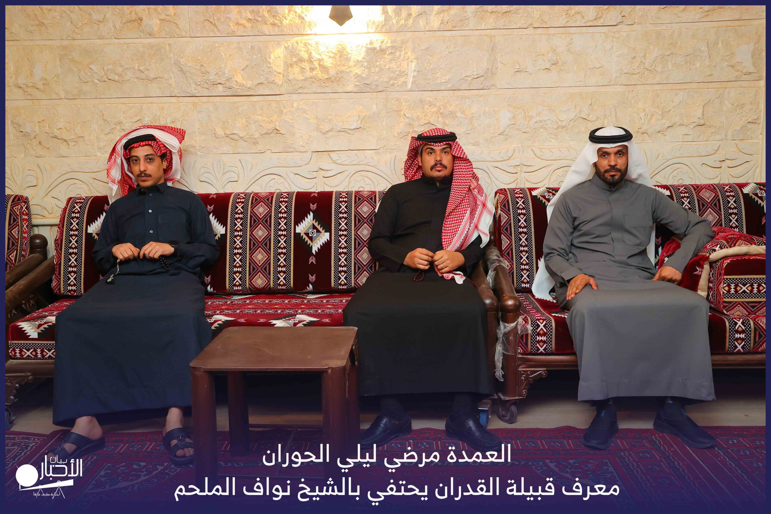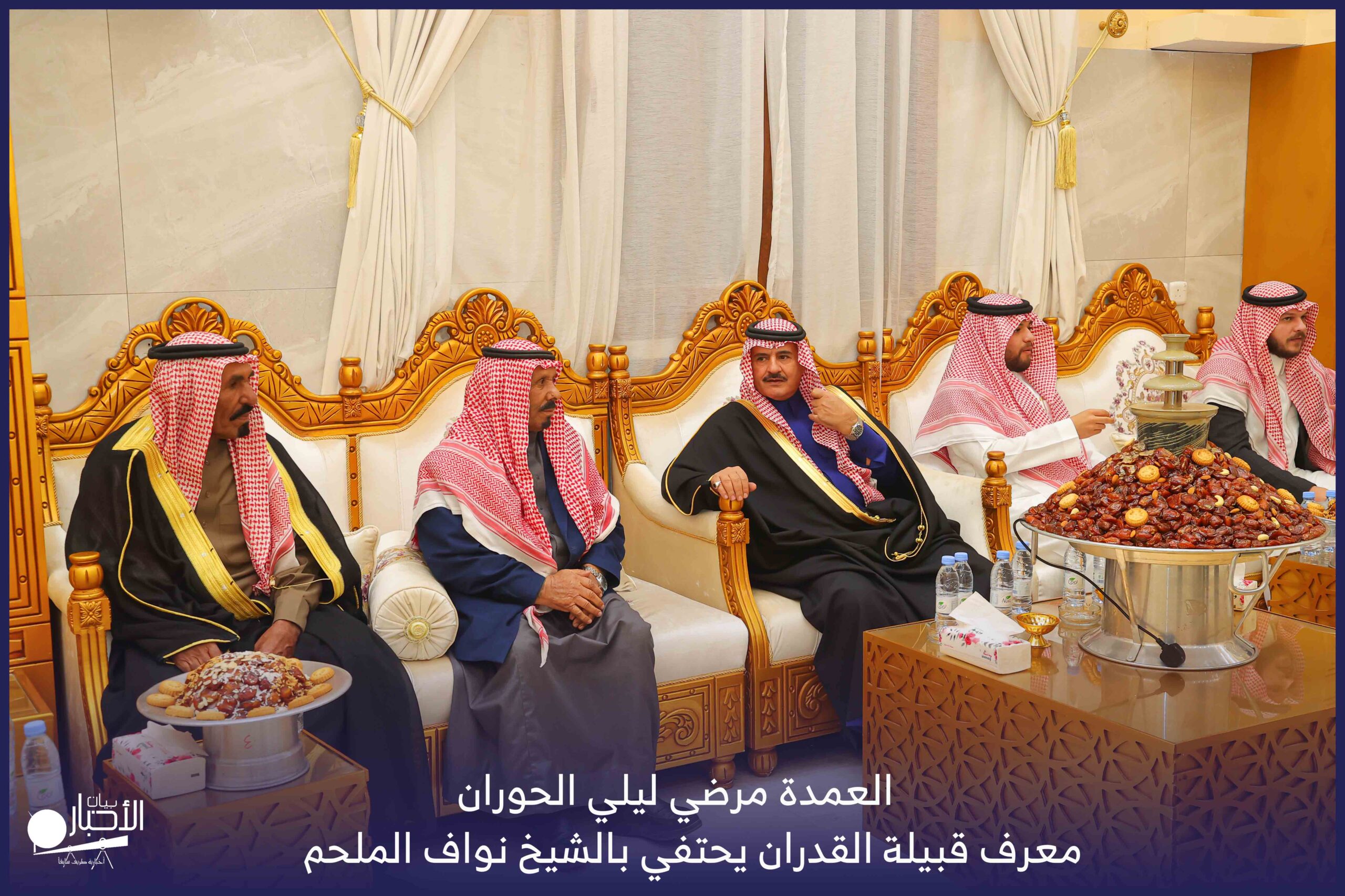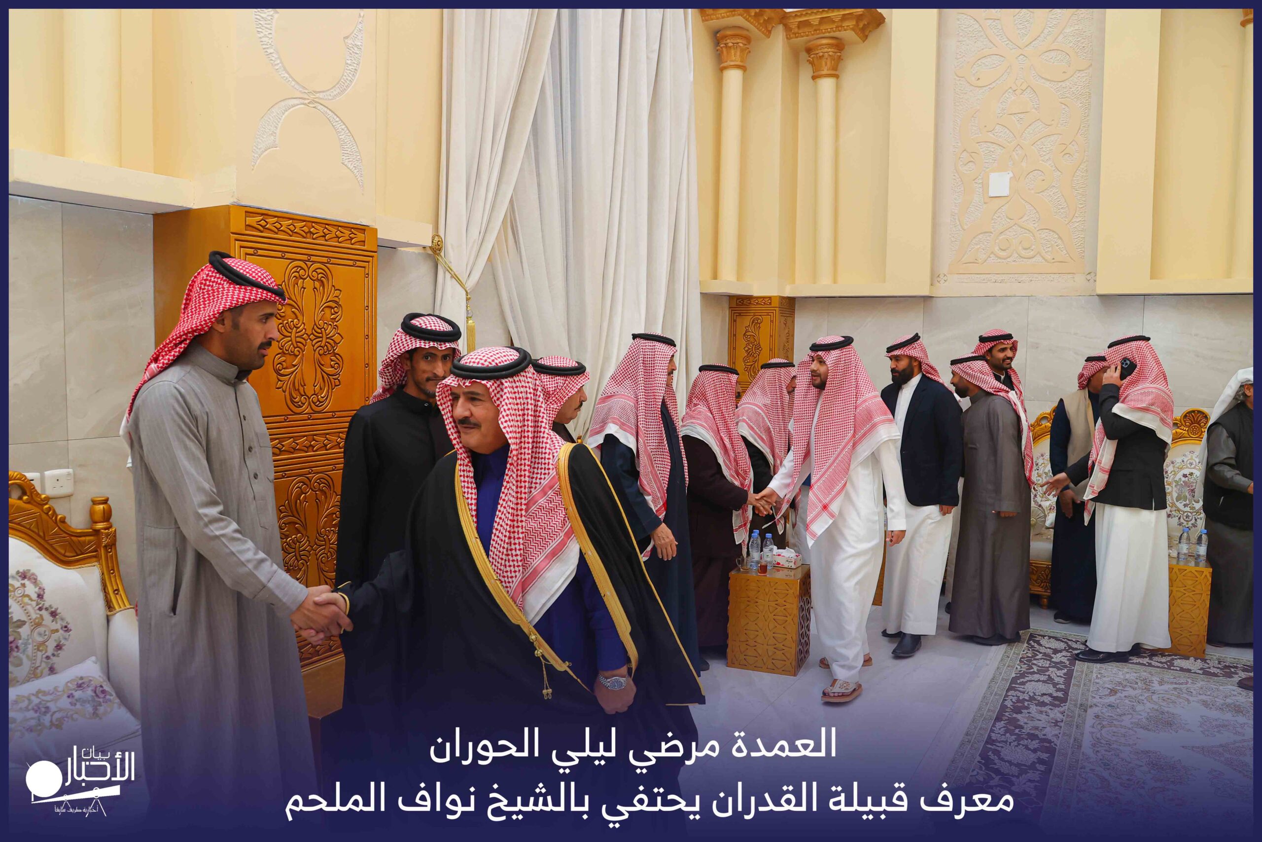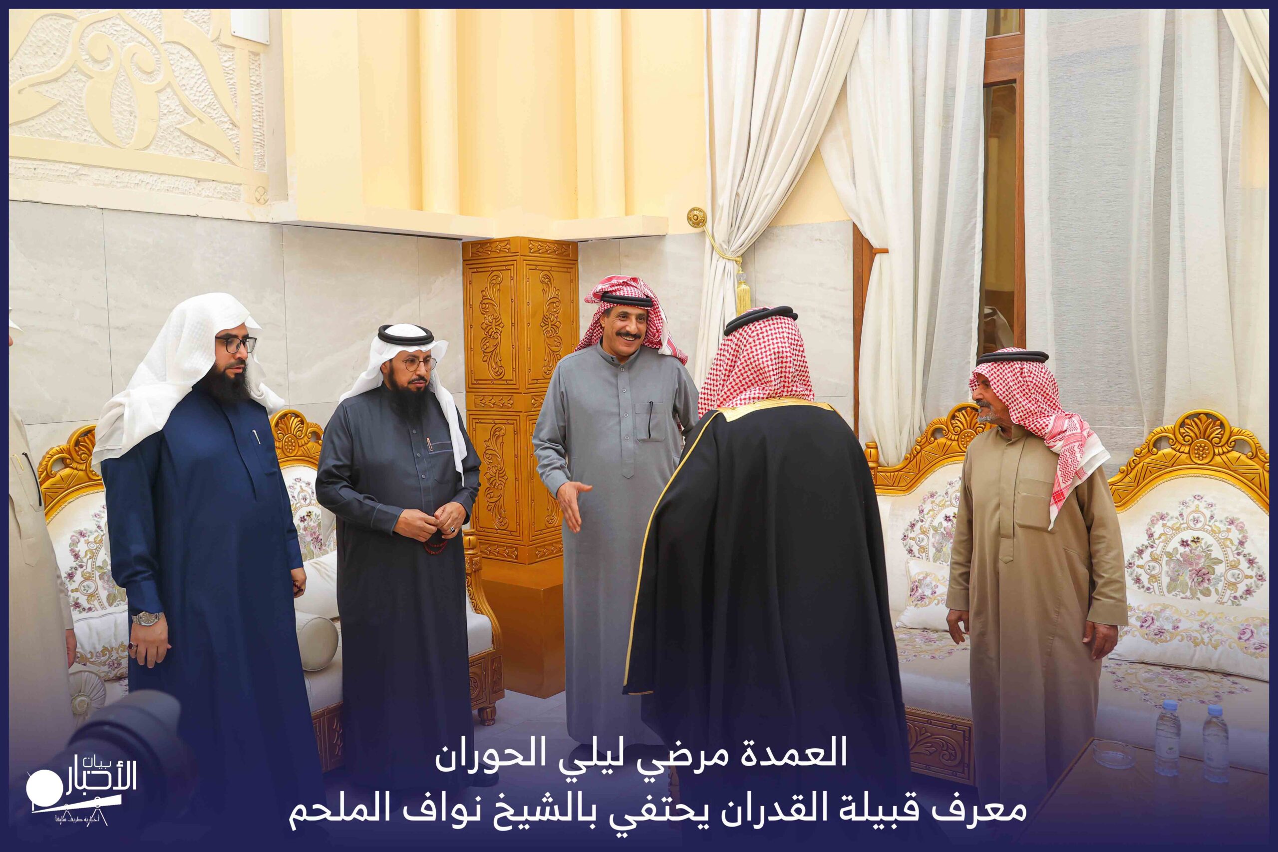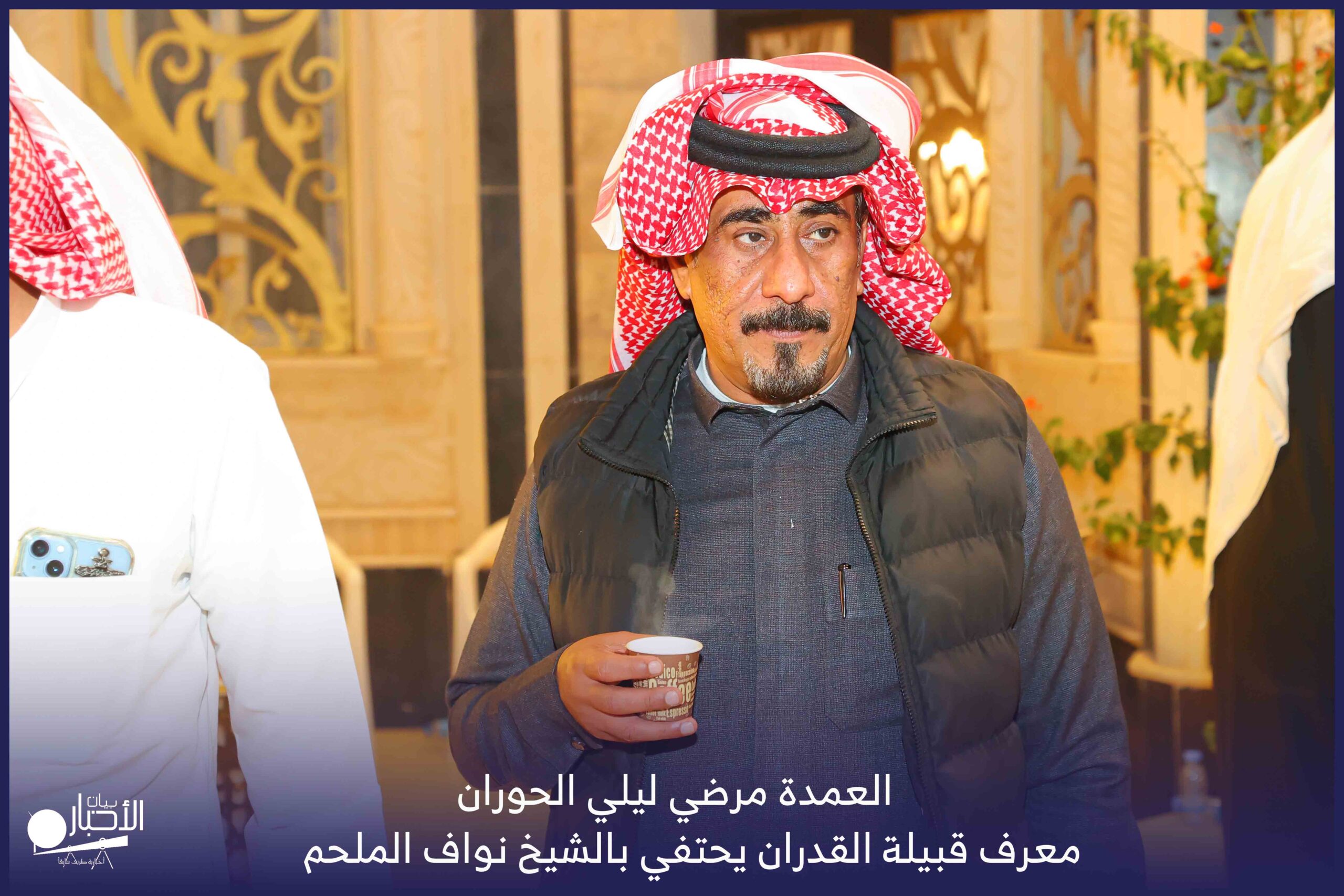 احتفى العمدة مرضي ليلي الحوران معرف قبيلة القدران بالشيخ نواف عبدالعزيز طراد الملحم، وذلك تزامناً مع زيارته لمحافظة طريف، وذلك وسط ترحيب كبير وحضور عدد من المشايخ ووجهاء المحافظة.