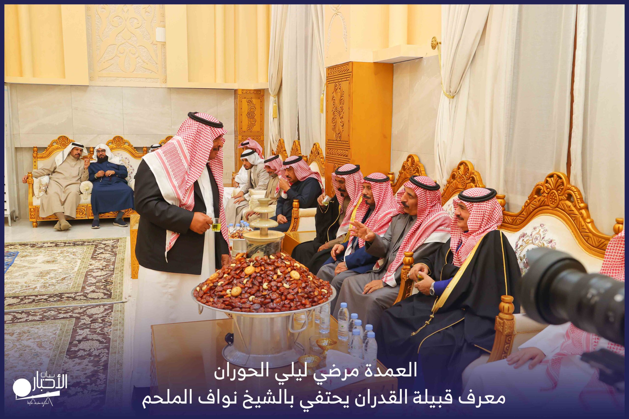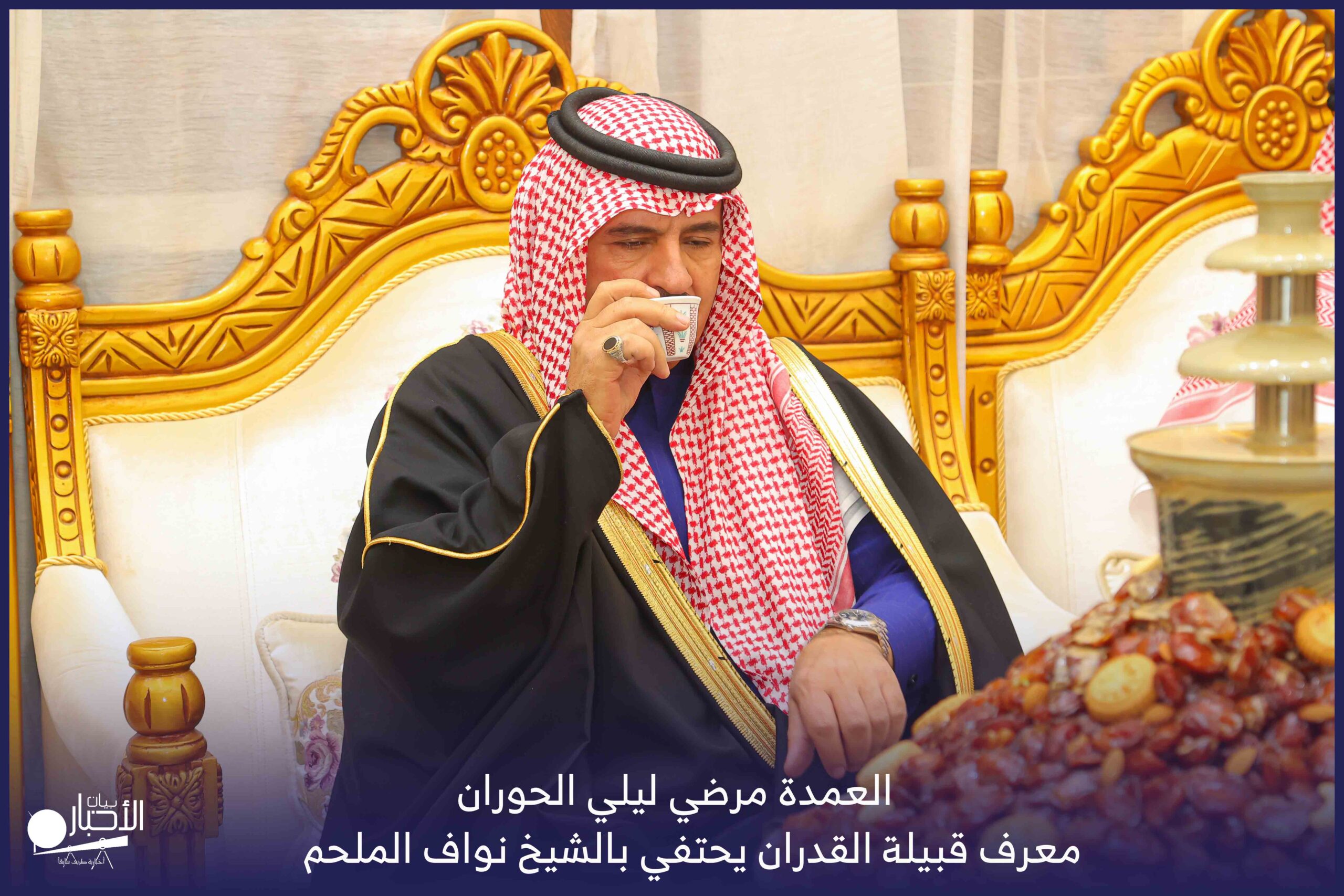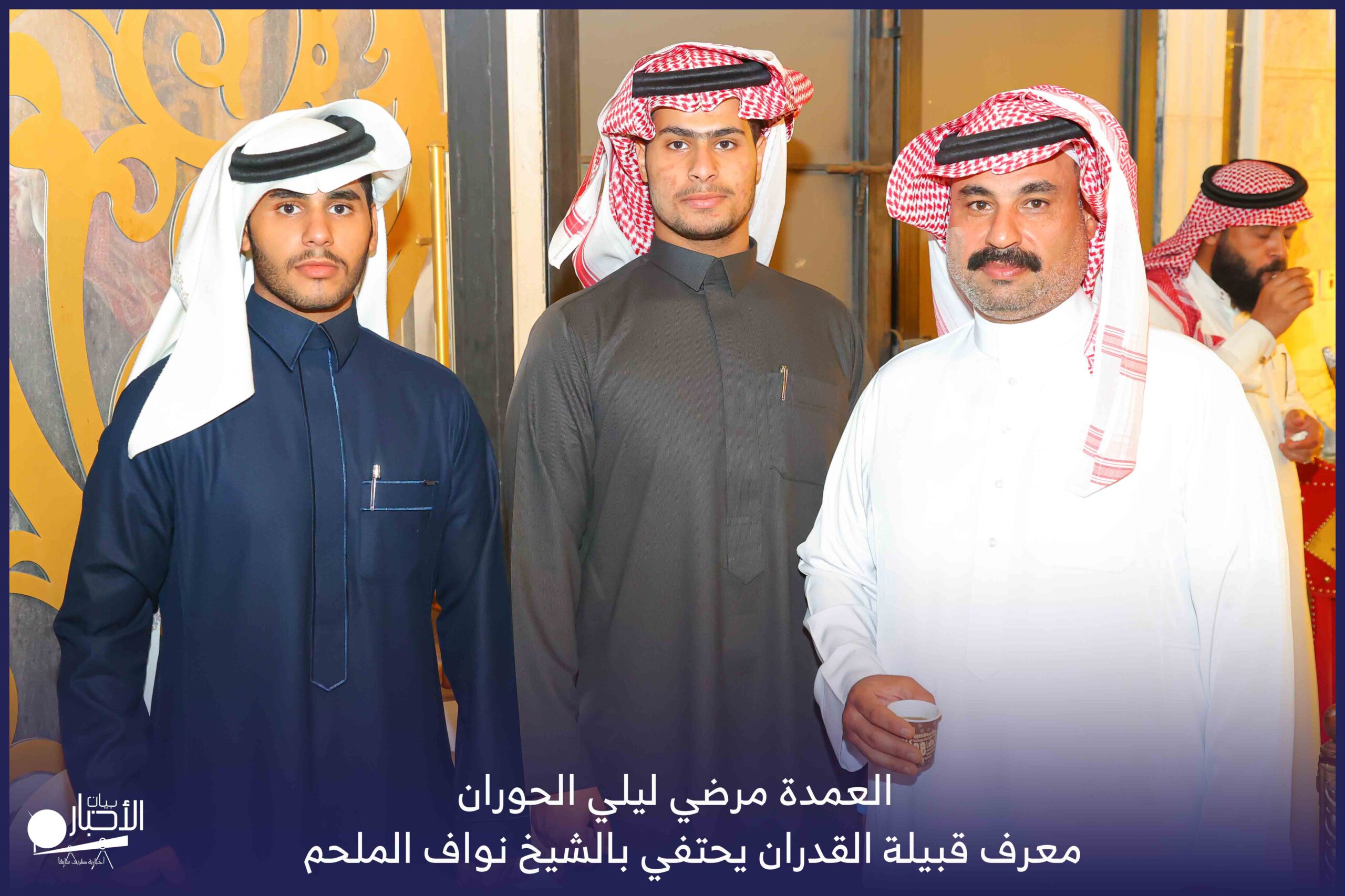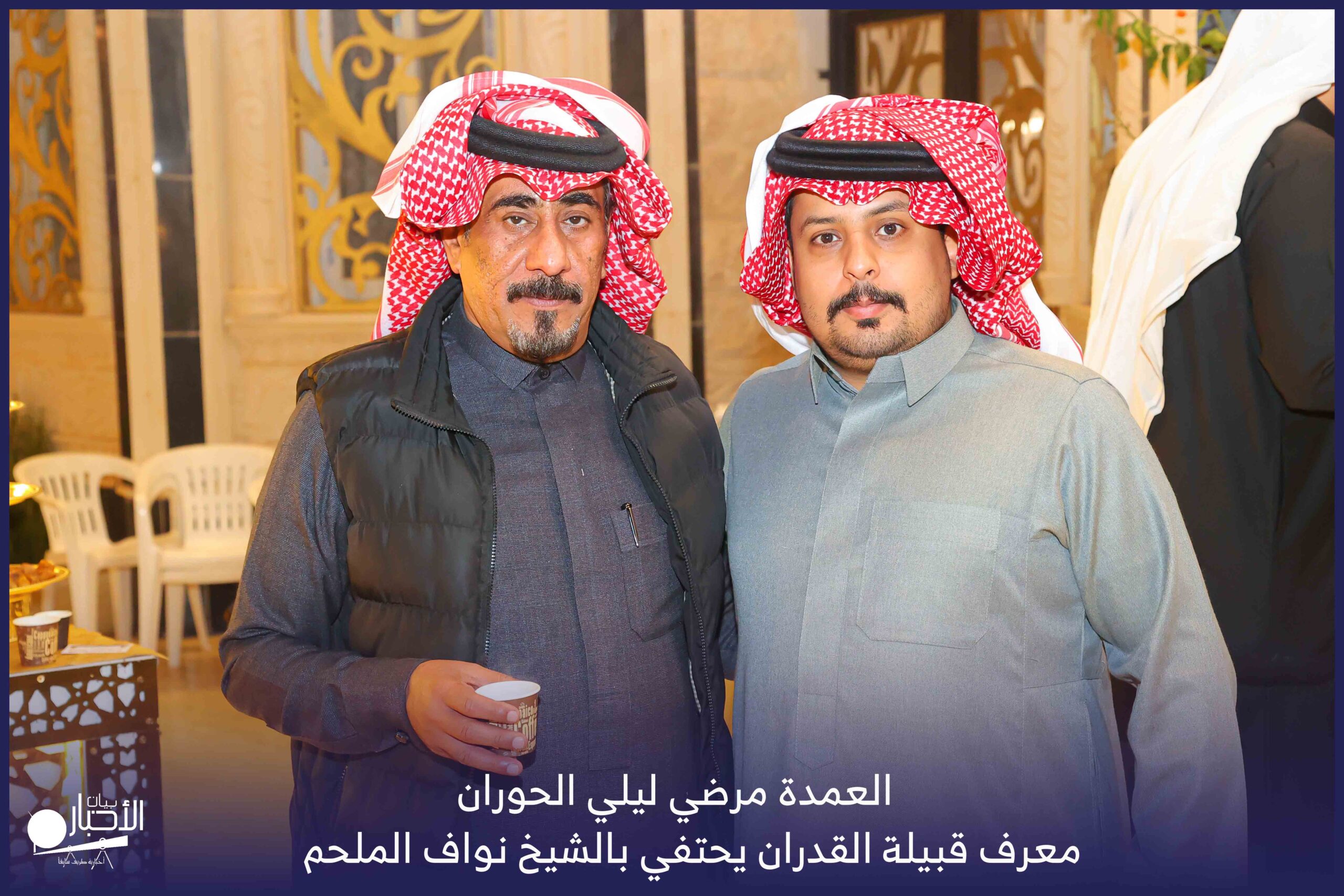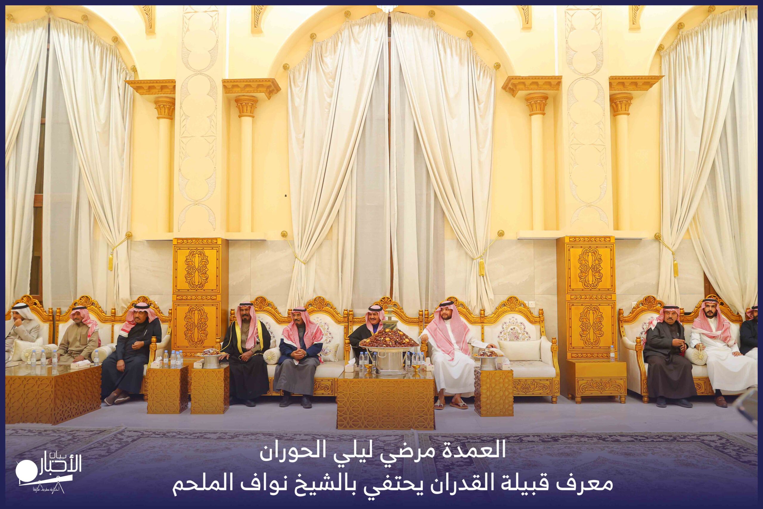احتفى العمدة مرضي ليلي الحوران معرف قبيلة القدران بالشيخ نواف عبدالعزيز طراد الملحم، وذلك تزامناً مع زيارته لمحافظة طريف، وذلك وسط ترحيب كبير وحضور عدد من المشايخ ووجهاء المحافظة.
