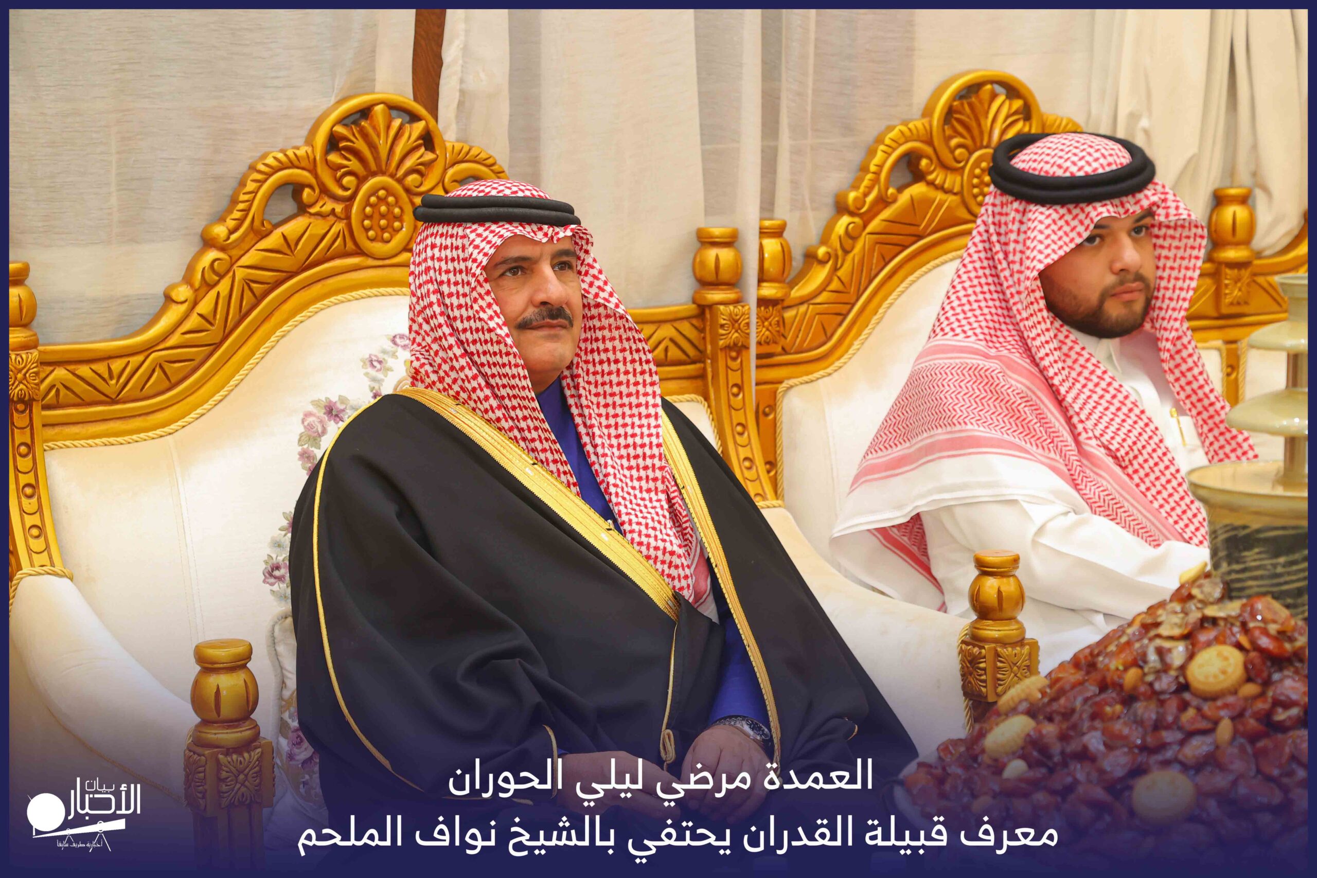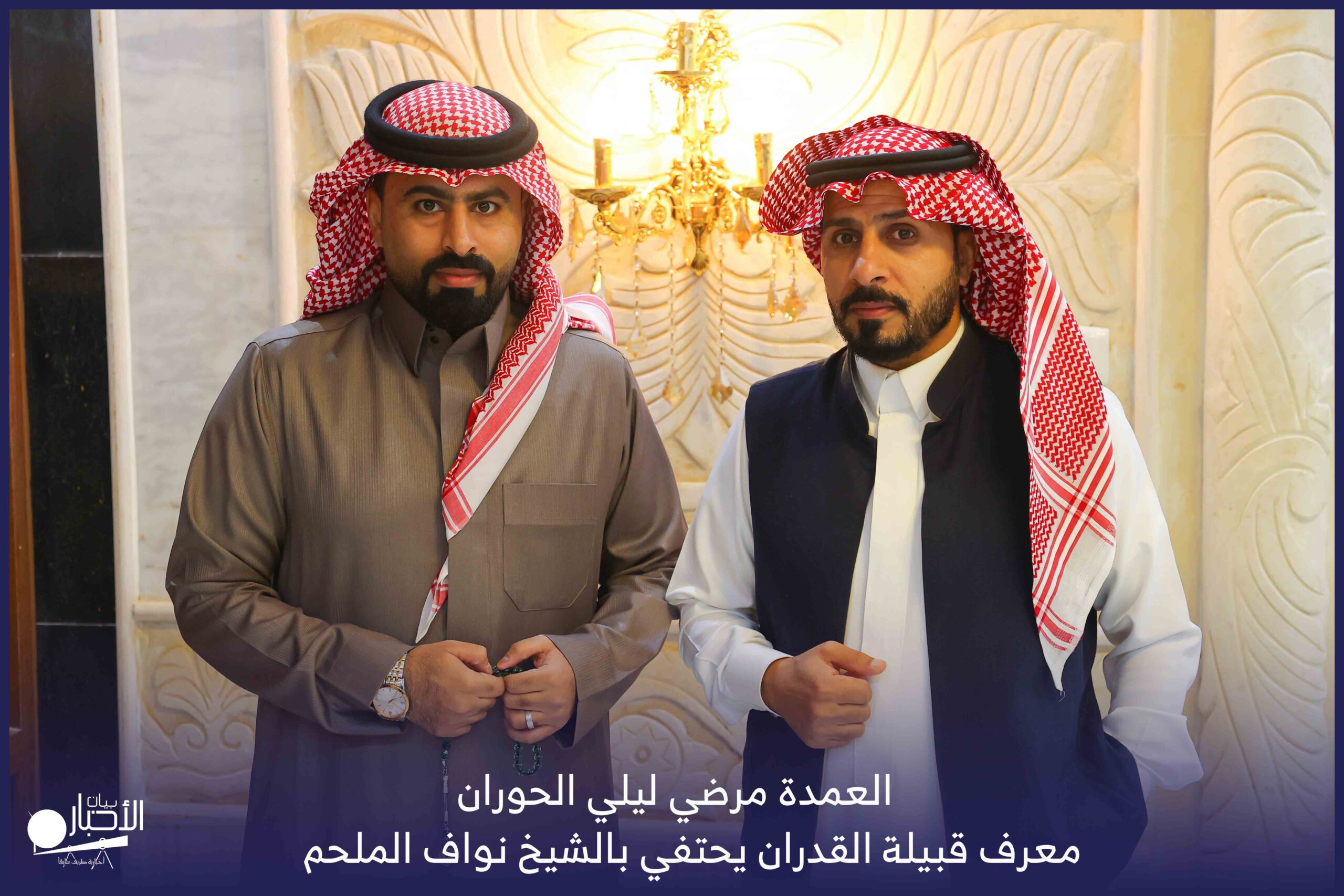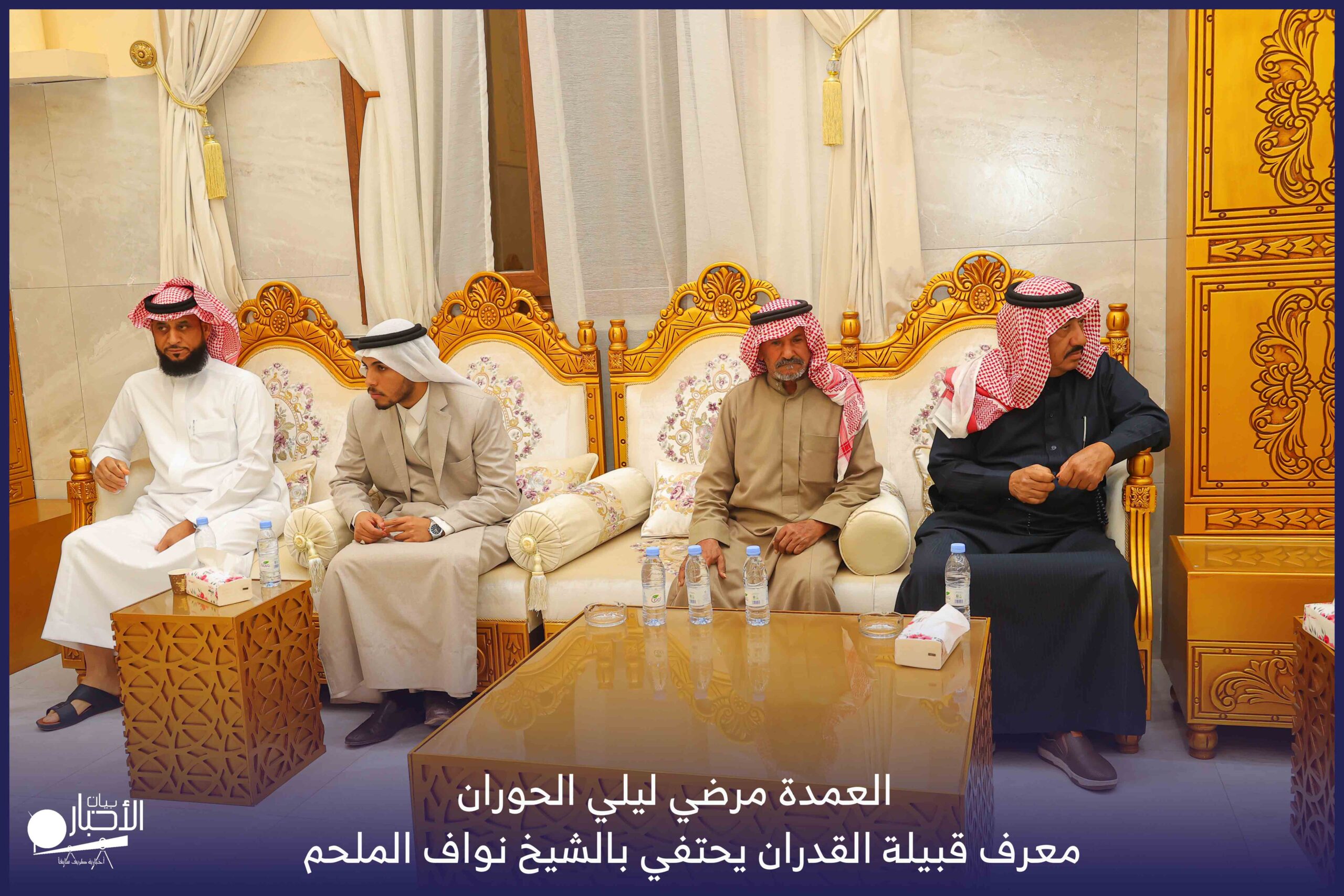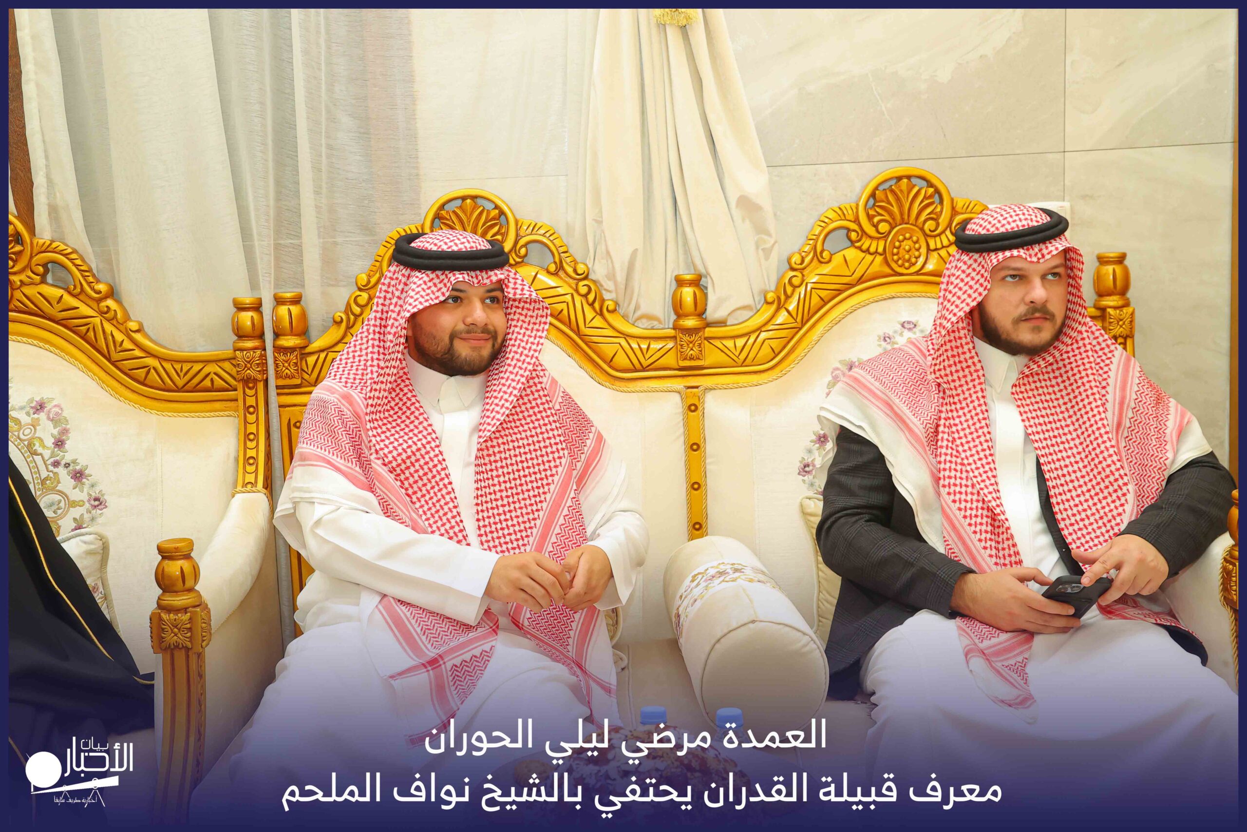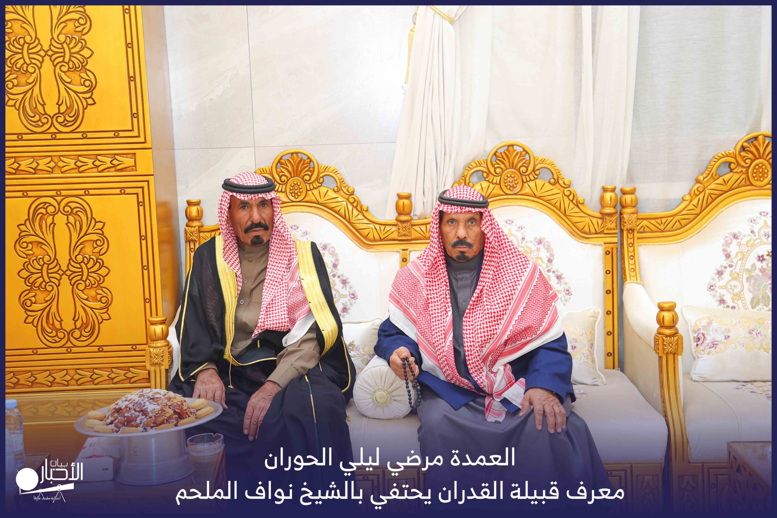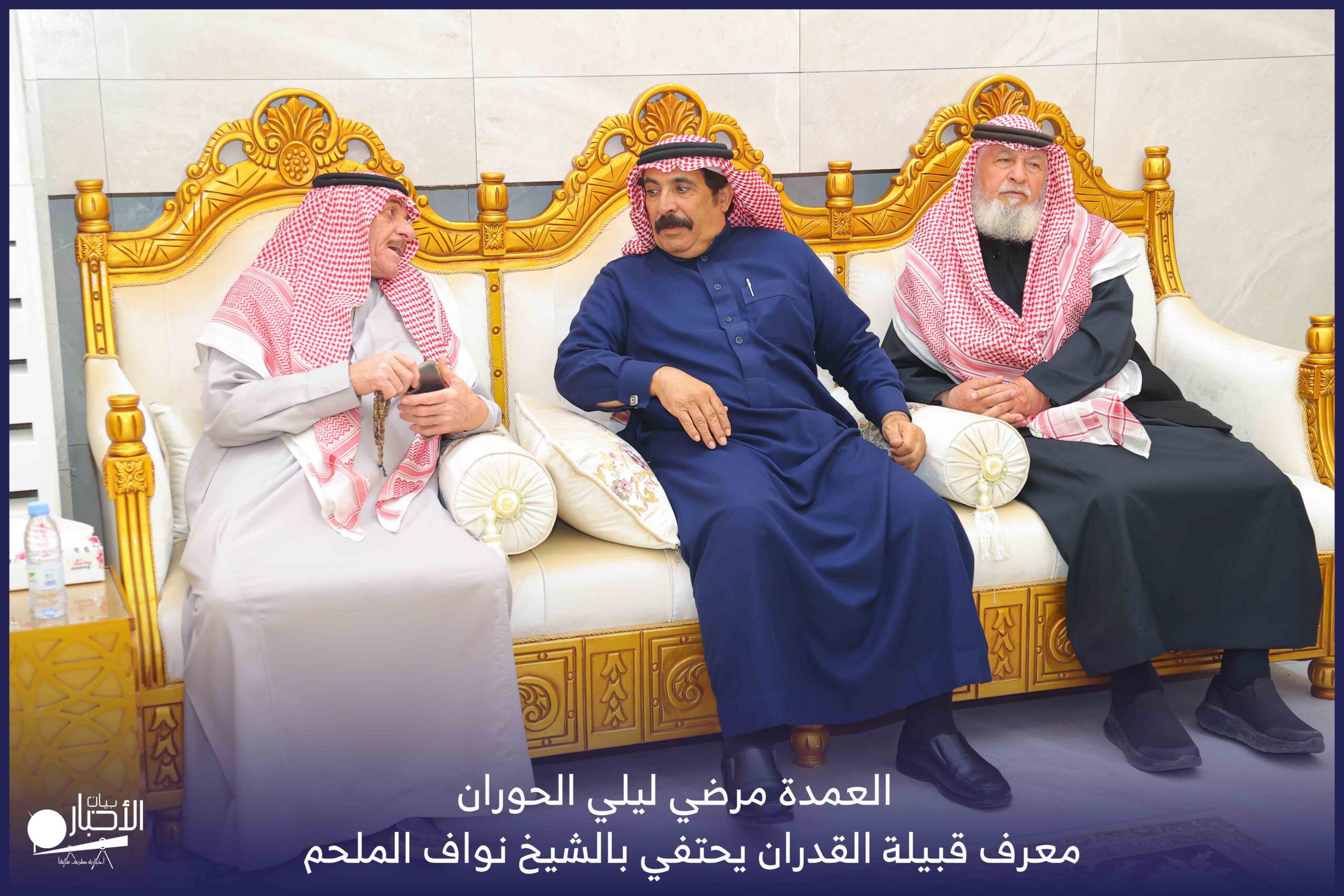 احتفى العمدة مرضي ليلي الحوران معرف قبيلة القدران بالشيخ نواف عبدالعزيز طراد الملحم، وذلك تزامناً مع زيارته لمحافظة طريف، وذلك وسط ترحيب كبير وحضور عدد من المشايخ ووجهاء المحافظة.