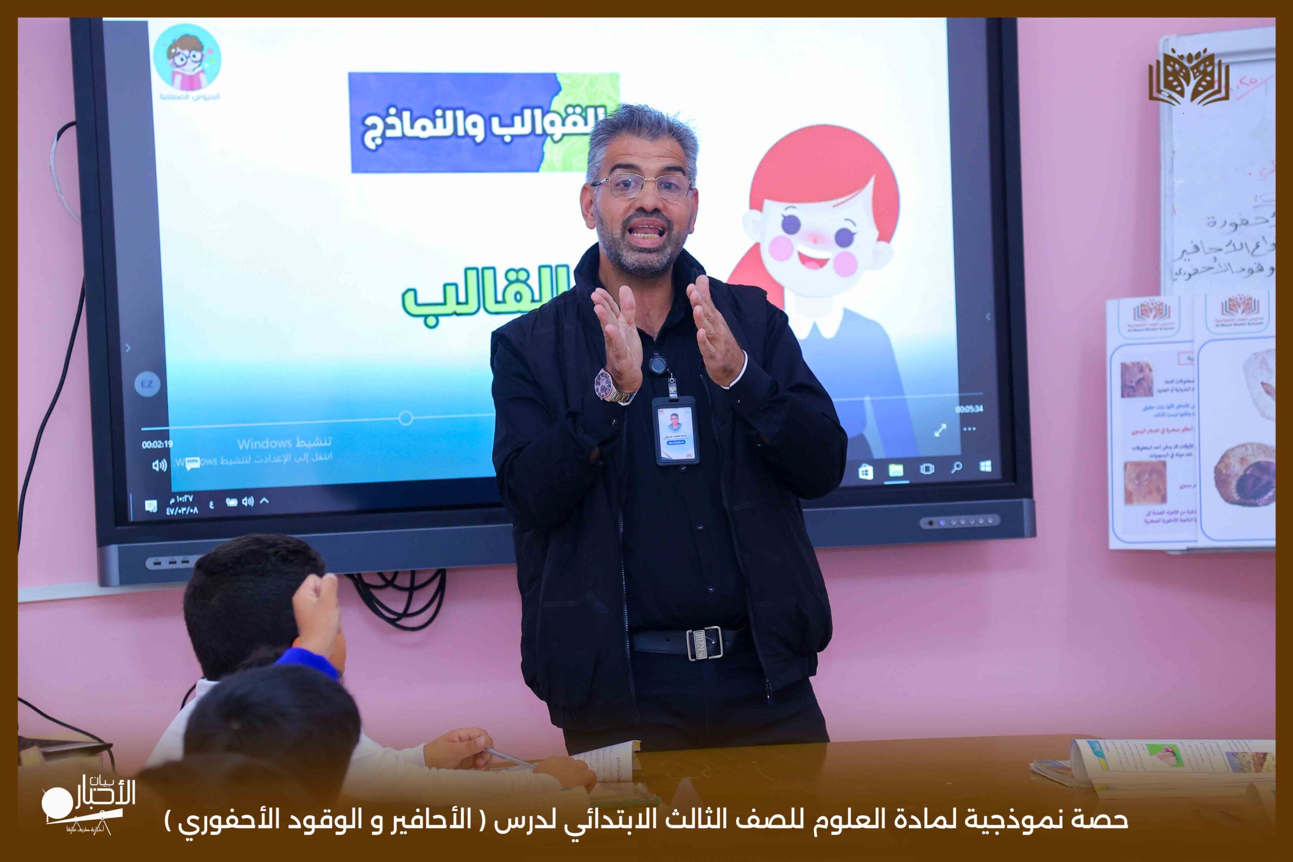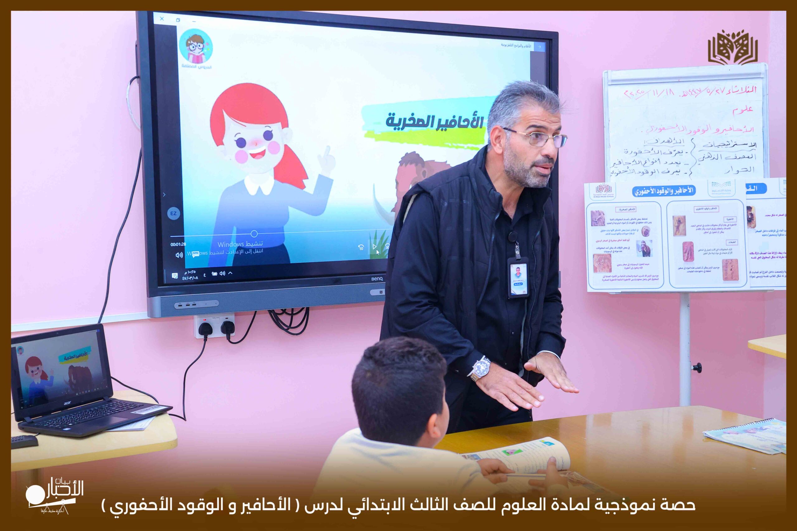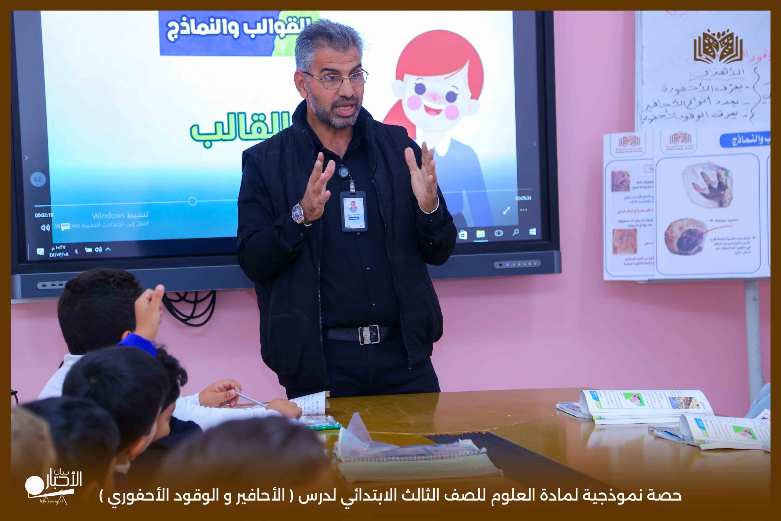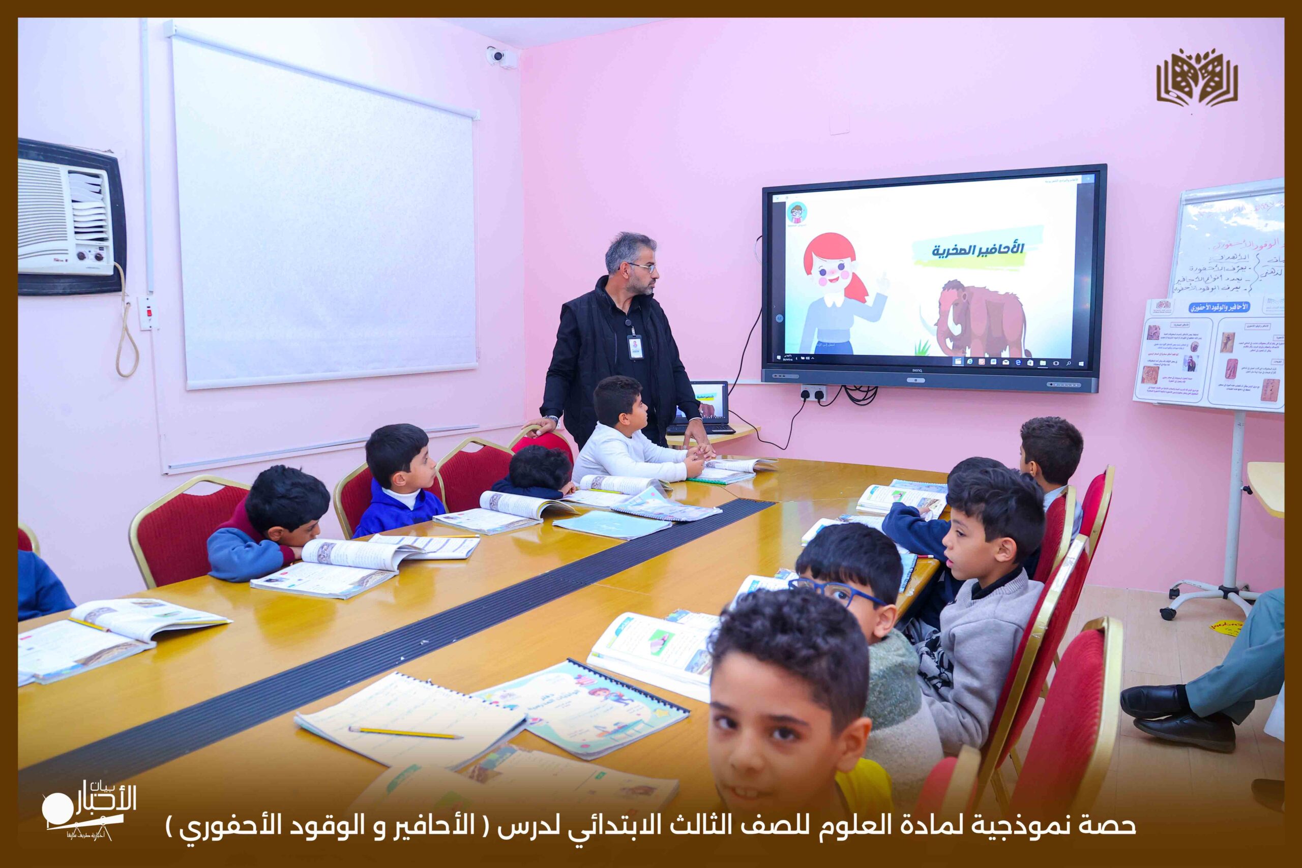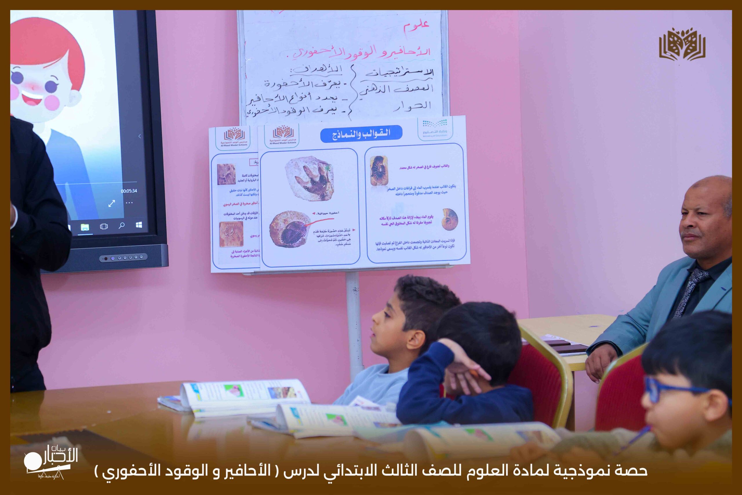 أقامت مدارس الوعد النموذجية حصة نموذجية لمادة العلوم للصف الثالث الابتدائي لدرس ( الأحافير و الوقود الأحفوري ) حيث استخدم المعلم استراتيجيات التعلم في التدريس ومنها ( التعلم النشط – العصف الذهني – المناقشة والحوار ) حيث تفاعل الطلاب مع المعلم أثناء الدرس تفاعلًا رائعًا ٠