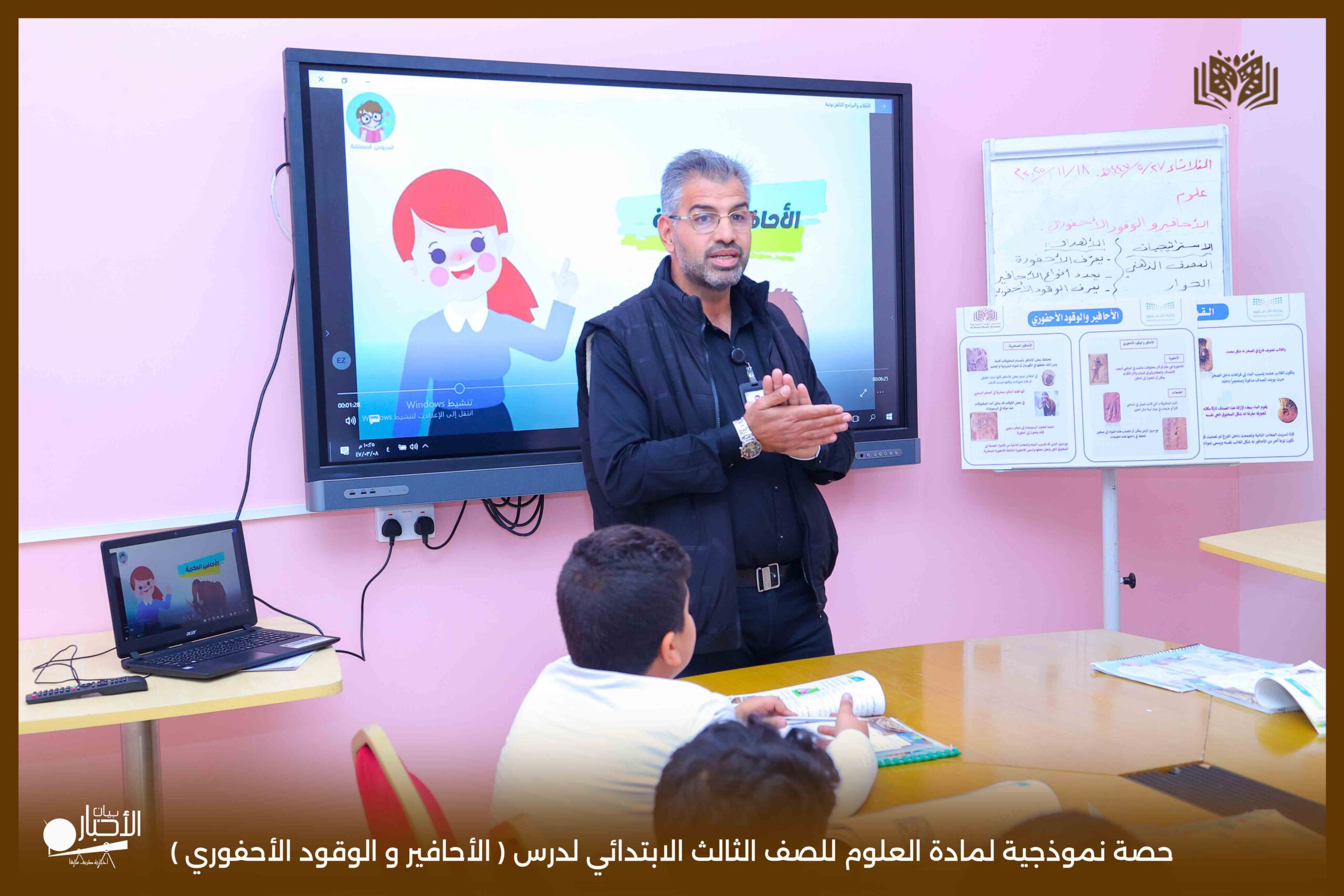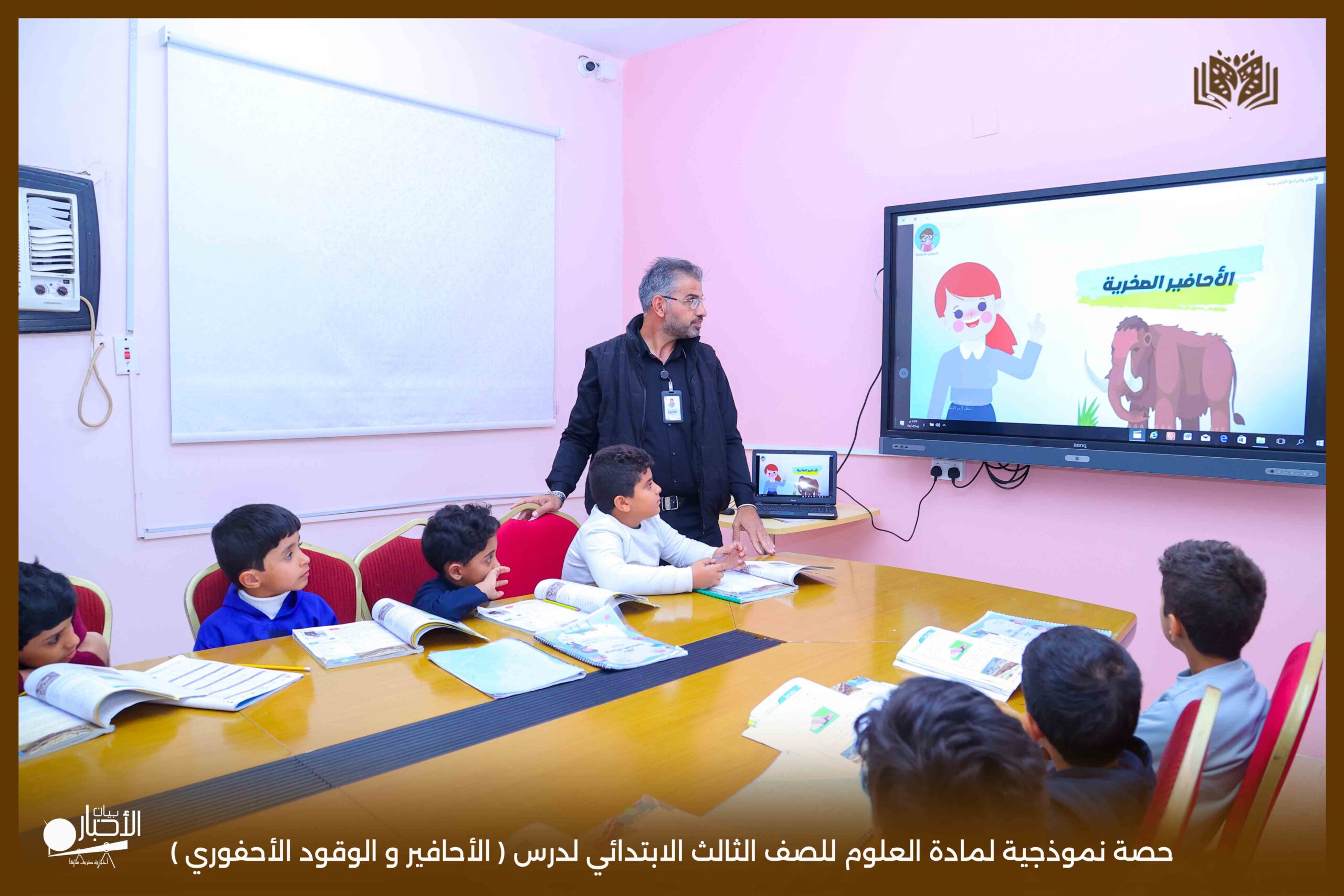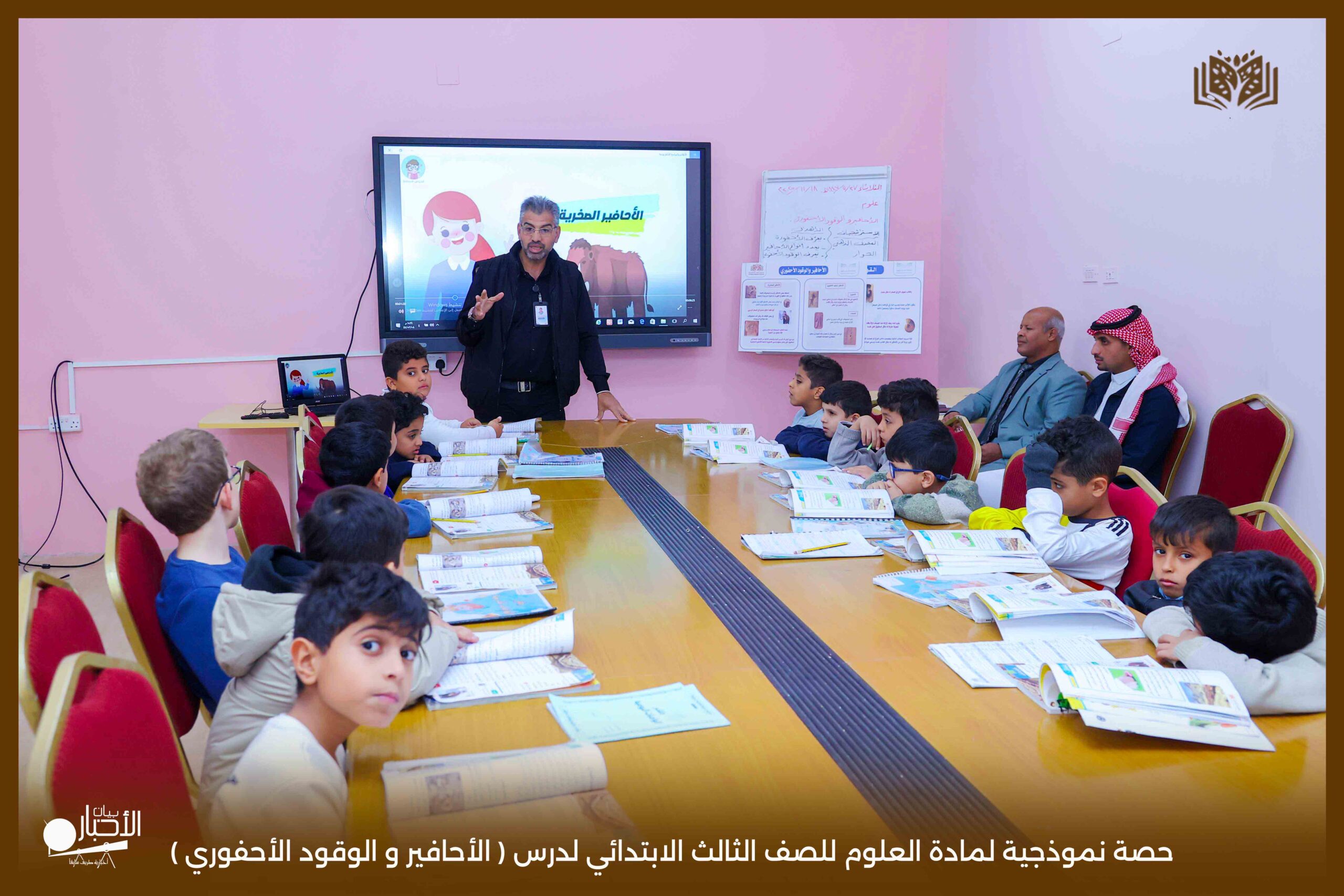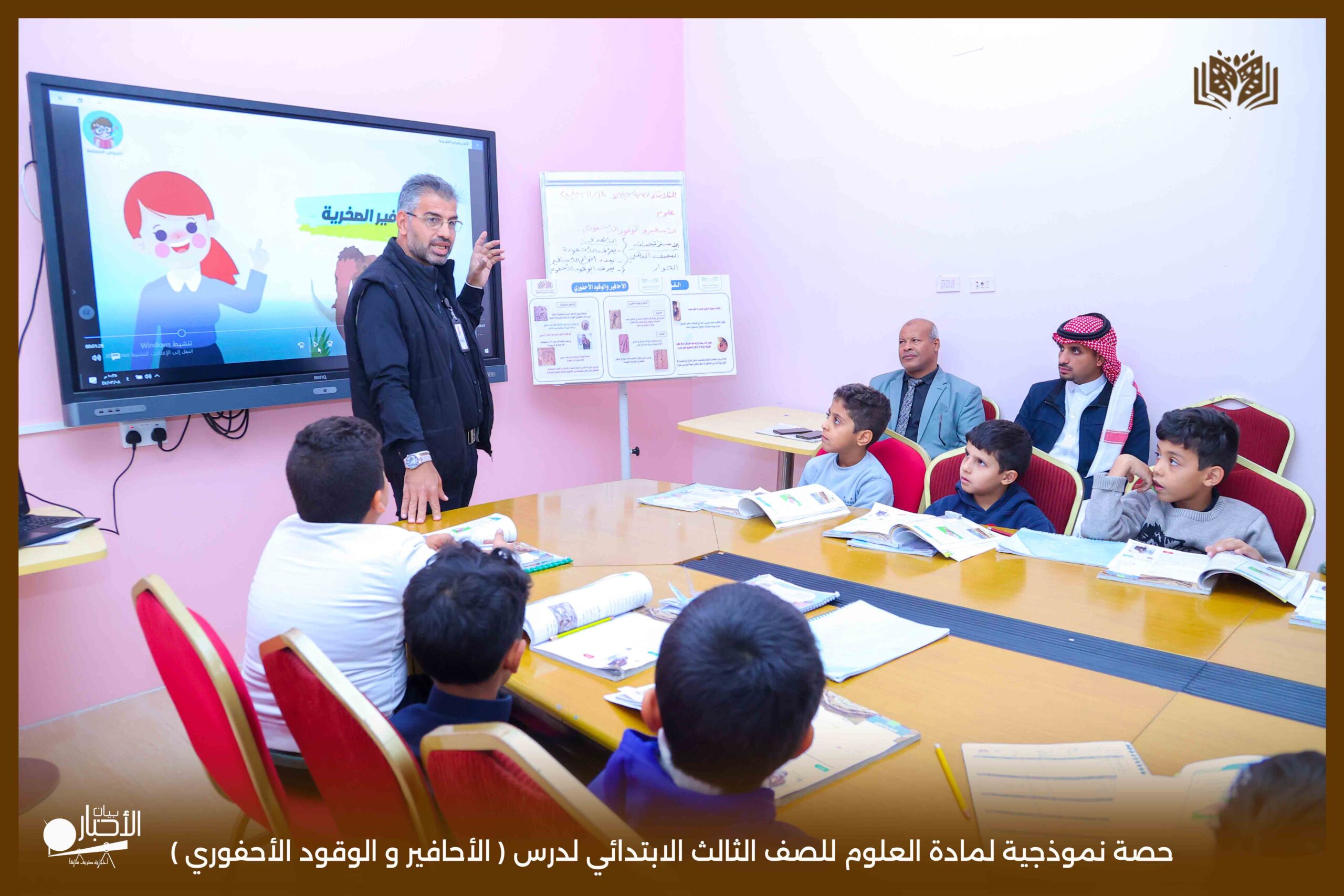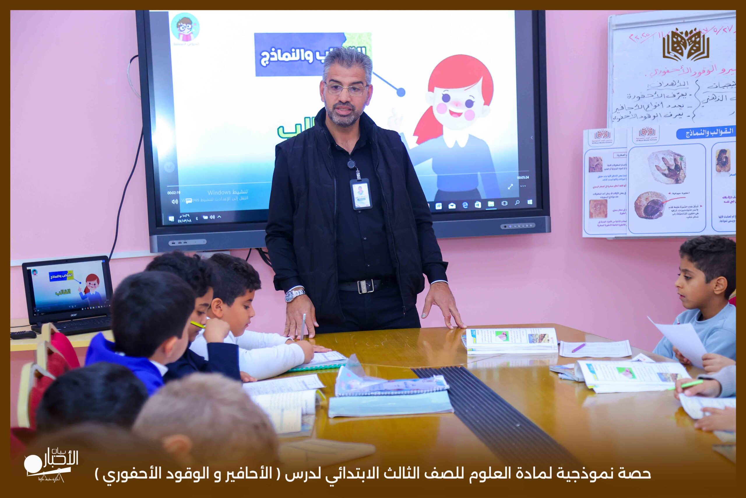 أقامت مدارس الوعد النموذجية حصة نموذجية لمادة العلوم للصف الثالث الابتدائي لدرس ( الأحافير و الوقود الأحفوري ) حيث استخدم المعلم استراتيجيات التعلم في التدريس ومنها ( التعلم النشط – العصف الذهني – المناقشة والحوار ) حيث تفاعل الطلاب مع المعلم أثناء الدرس تفاعلًا رائعًا ٠
