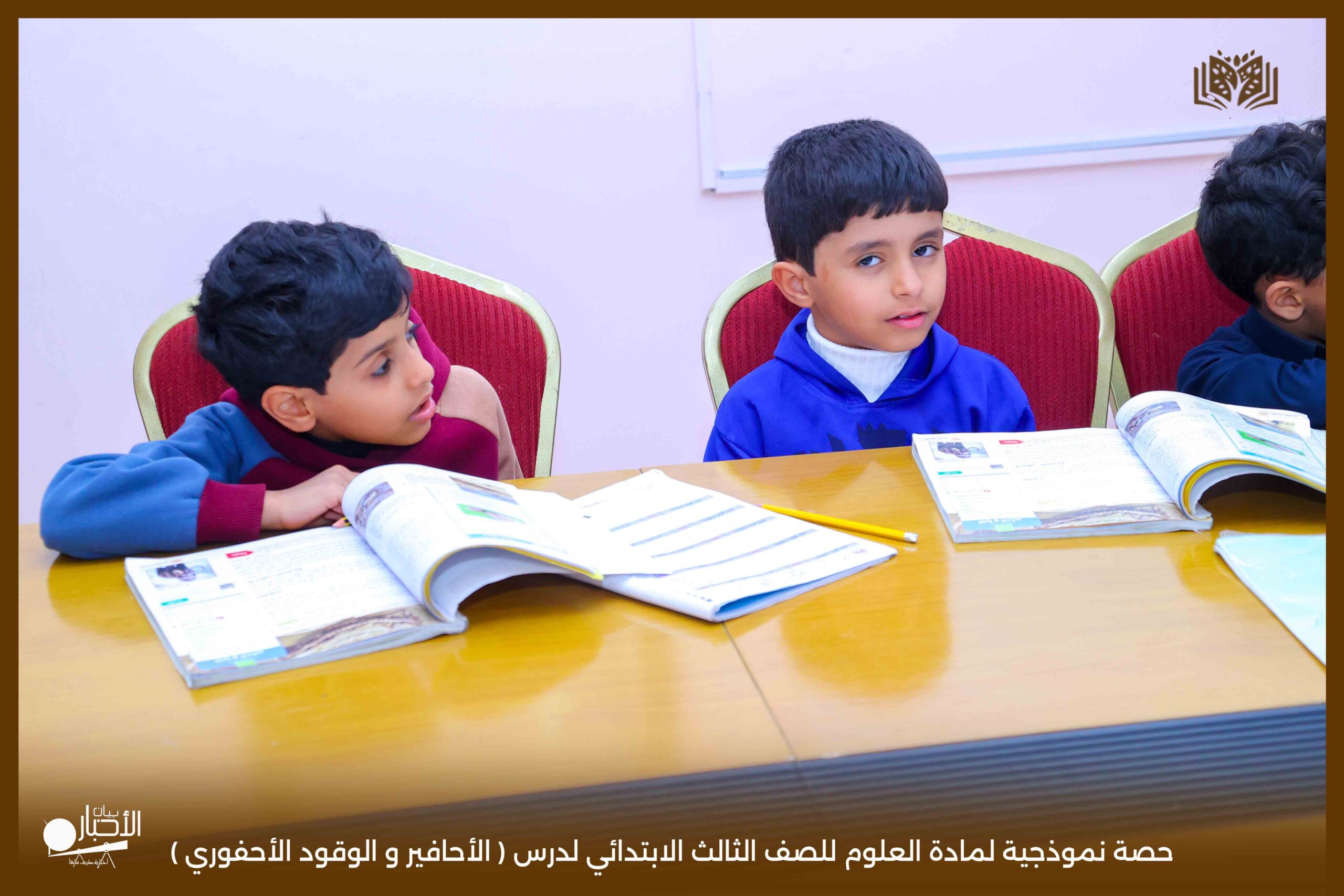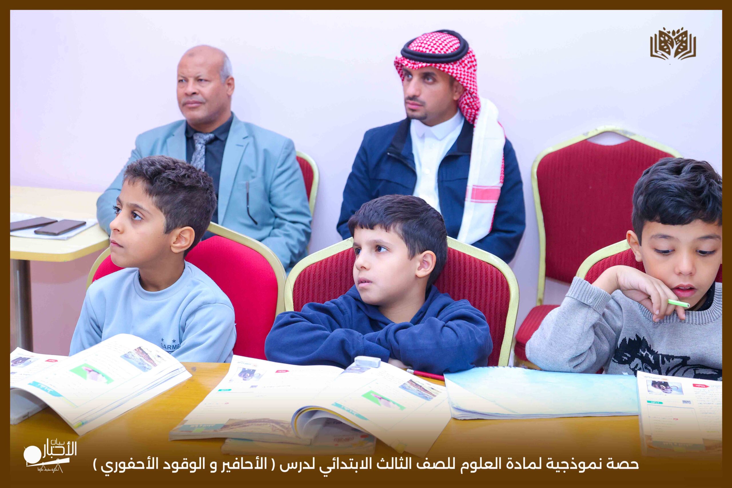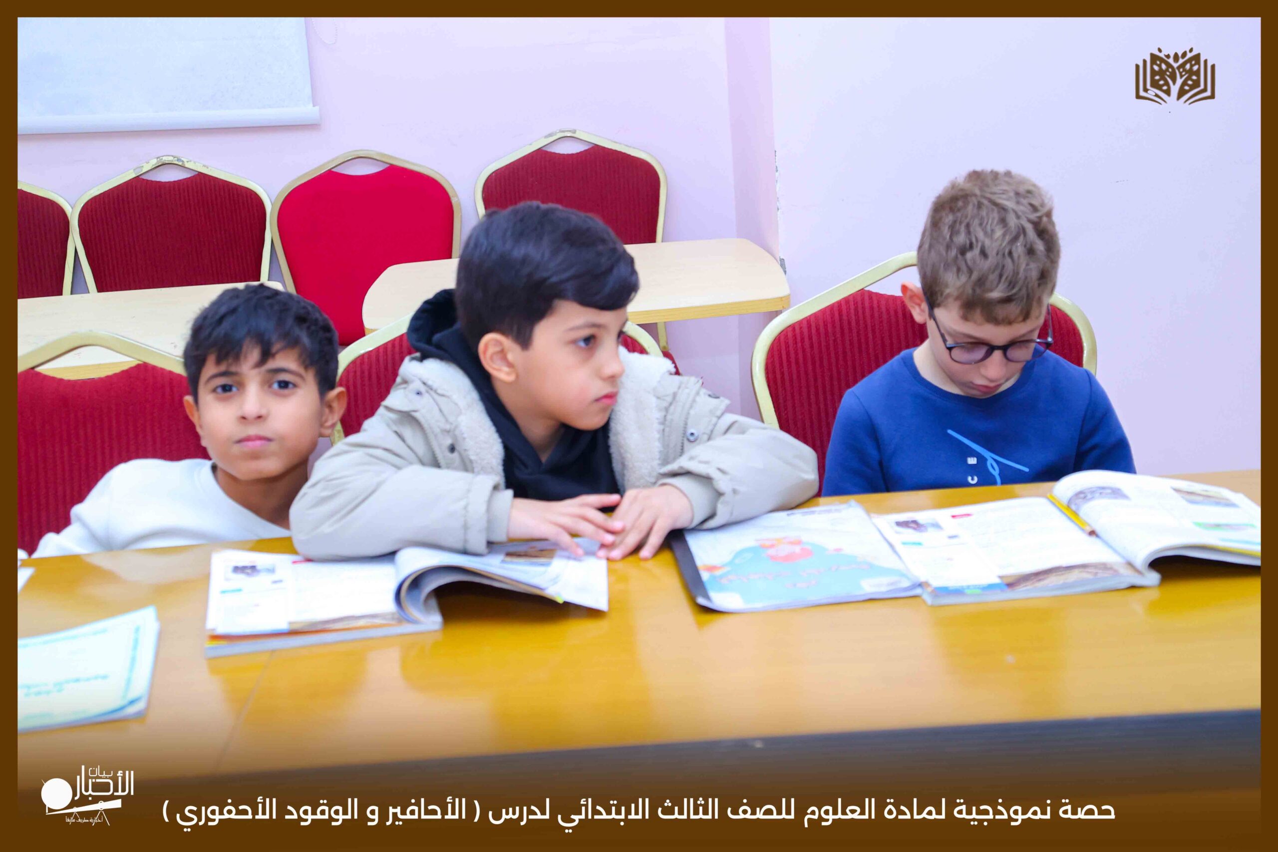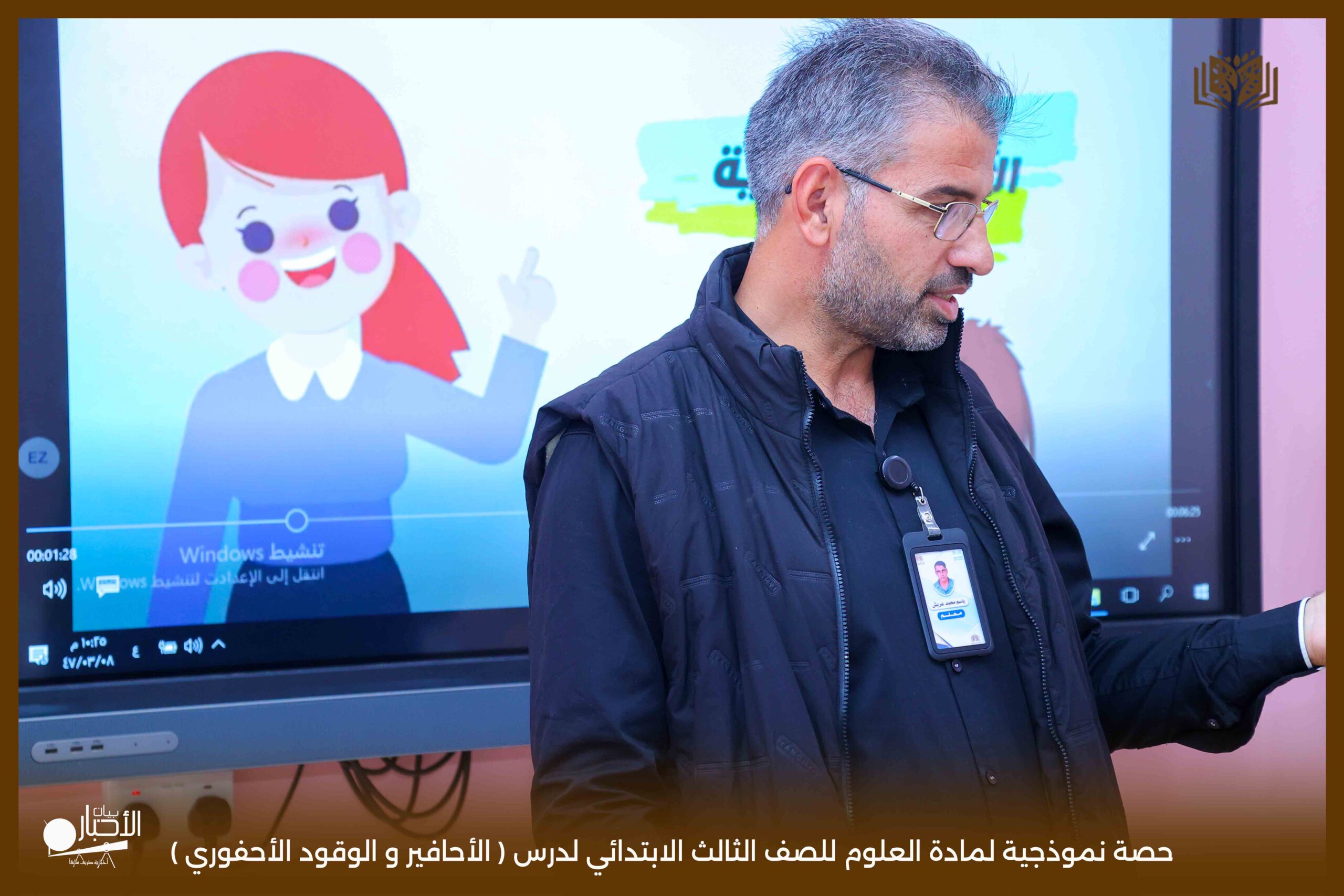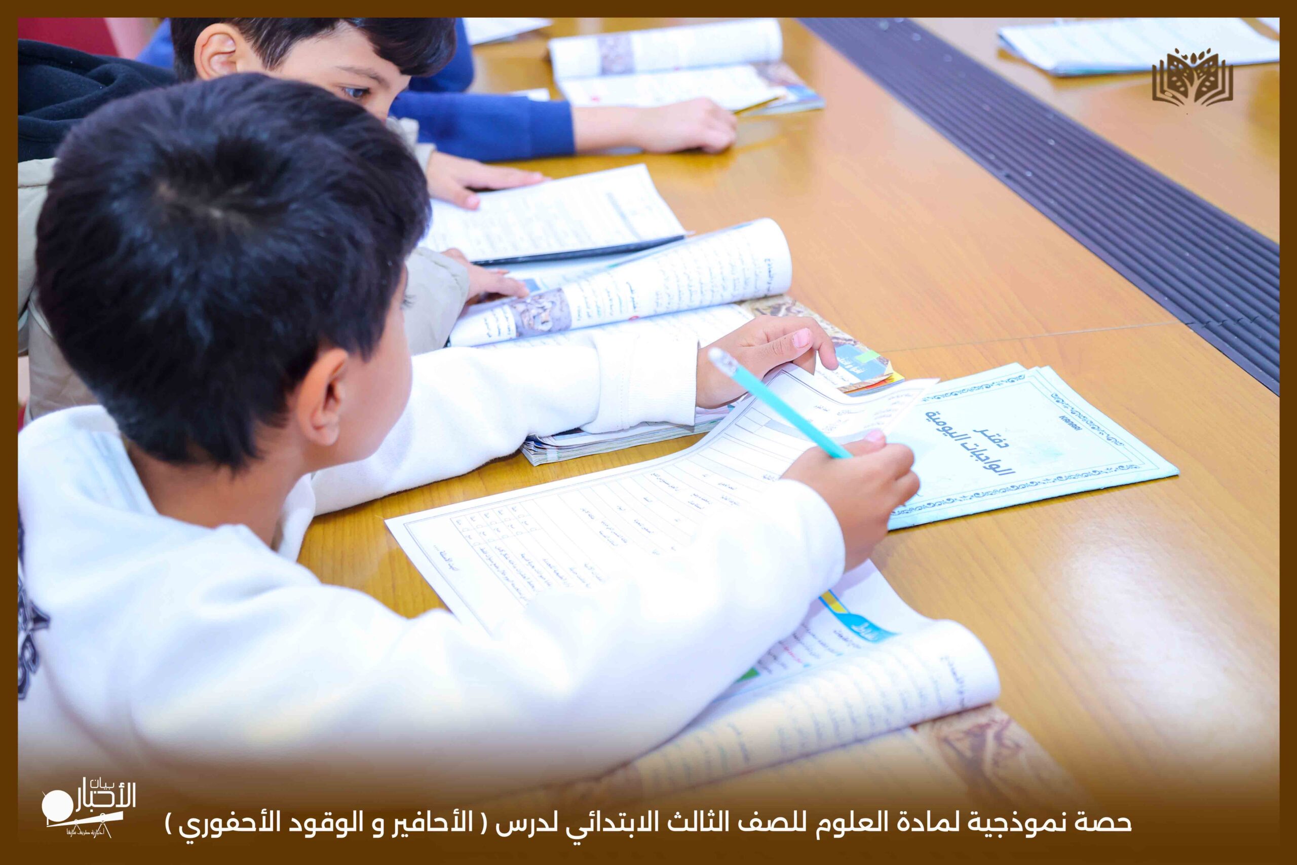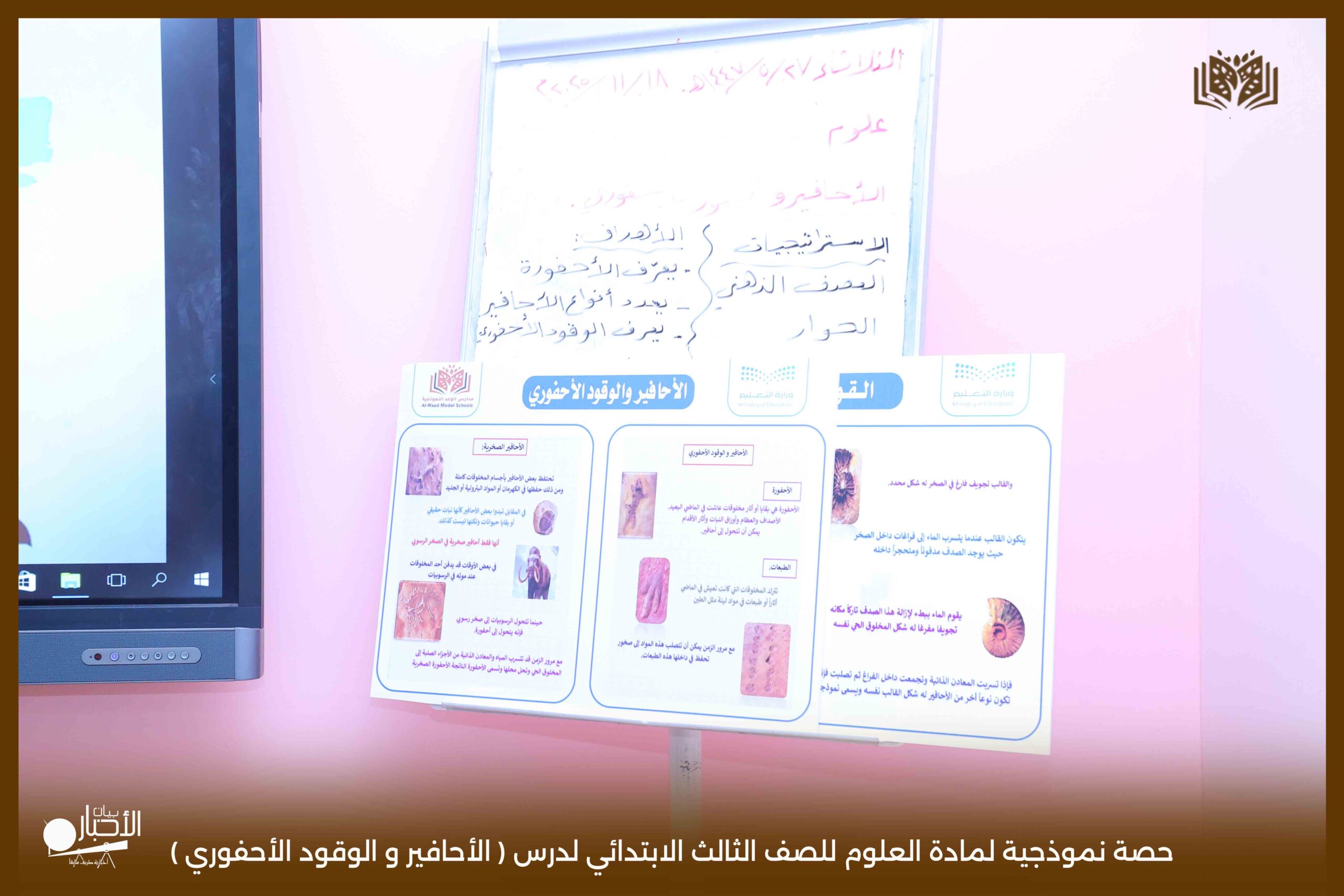 أقامت مدارس الوعد النموذجية حصة نموذجية لمادة العلوم للصف الثالث الابتدائي لدرس ( الأحافير و الوقود الأحفوري ) حيث استخدم المعلم استراتيجيات التعلم في التدريس ومنها ( التعلم النشط – العصف الذهني – المناقشة والحوار ) حيث تفاعل الطلاب مع المعلم أثناء الدرس تفاعلًا رائعًا ٠