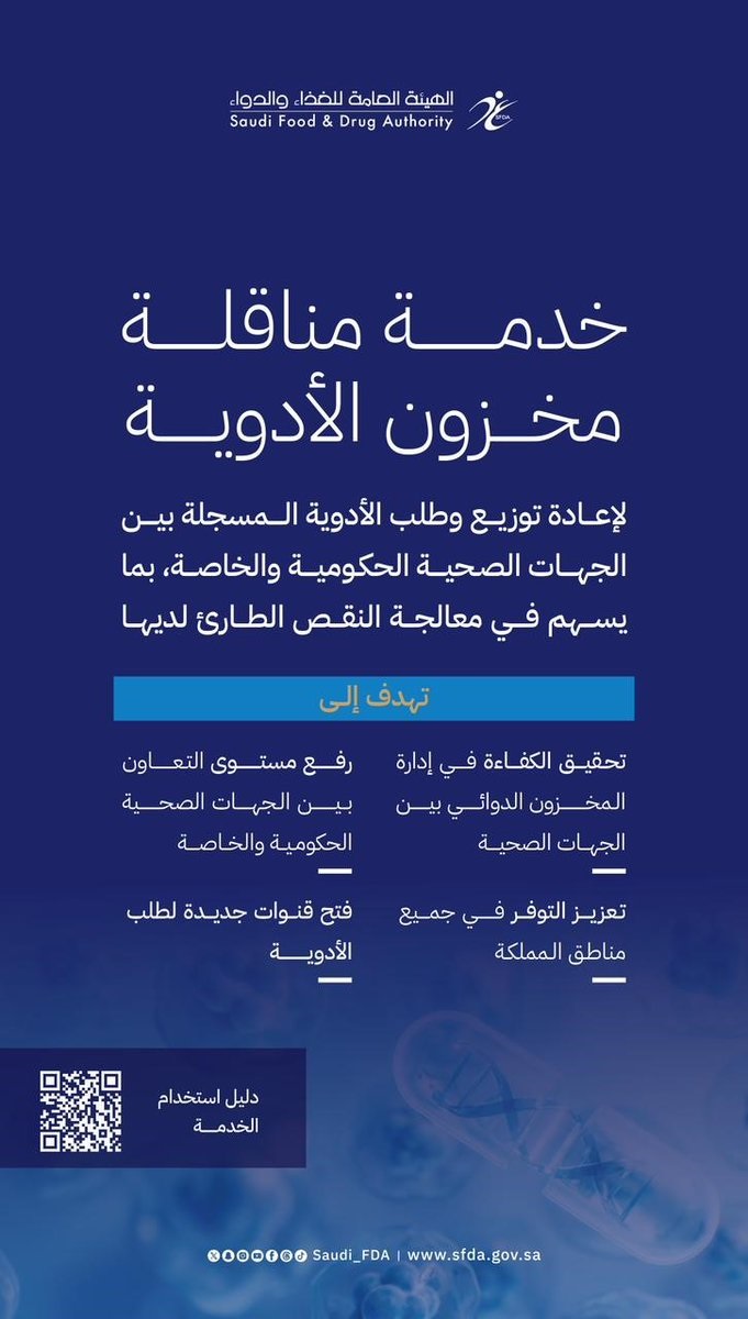 ووفق بيان الهيئة عبر صفحتها الرسمية على منصة “إكس”، تهدف الخدمة إلى تحقيق الكفاءة في إدارة المخزون الدوائي بين الجهات الصحية، ورفع مستوى التعاون بين الجهات الصحية الحكومية والخاصة، وتعزيز التوفر في جميع مناطق المملكة، بالإضافة إلى فتح قنوات جديدة لطلب الأدوية.