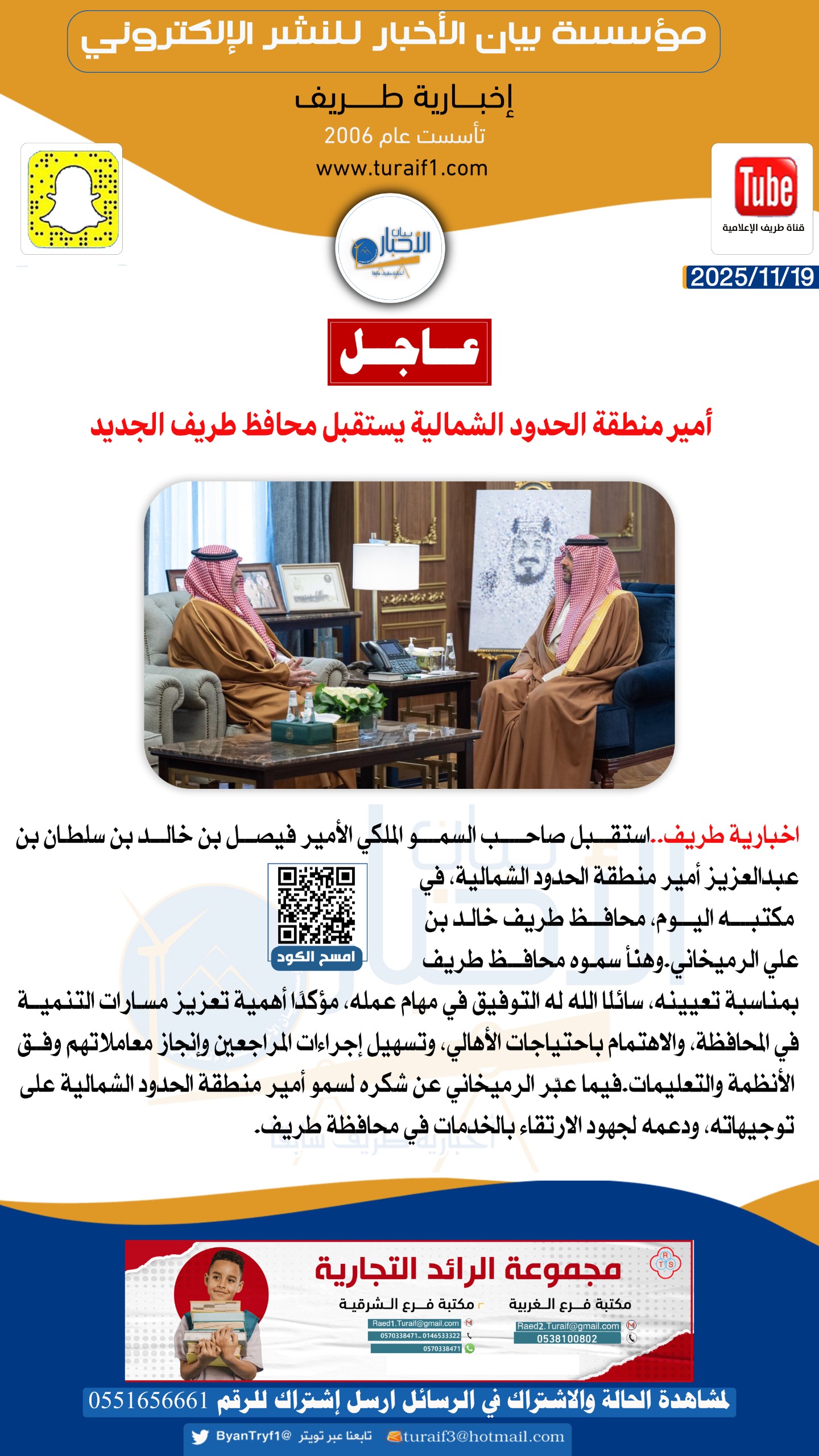 استقبل صاحب السمو الملكي الأمير فيصل بن خالد بن سلطان بن عبدالعزيز أمير منطقة الحدود الشمالية، في مكتبه اليوم، محافظ طريف خالد بن علي الرميخاني.