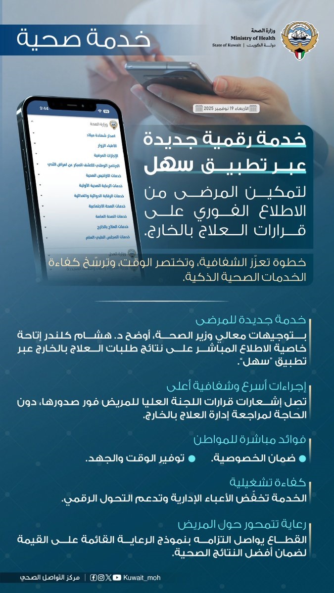 أطلقت وزارة الصحة خدمة رقمية جديدة عبر تطبيق “سهل” لتمكين المرضى من الاطلاع الفوري على قرارات العلاج بالخارج.