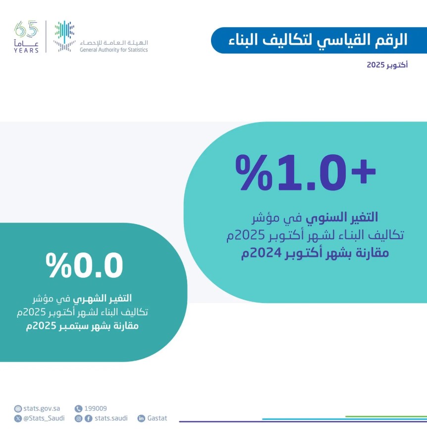 ووفقًا لنتائج النشرة، سجَّل الرقم القياسي لتكاليف البناء في المملكة ارتفاعًا نسبته 1.0% خلال أكتوبر 2025 مقارنةً بنظيره من العام الماضي، ويعزى ذلك إلى ارتفاع تكاليف القطاع السكني بنسبة 1.0% والقطاع غير السكني 0.9%.