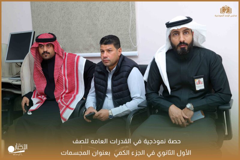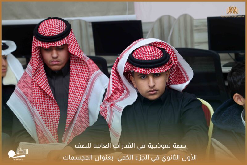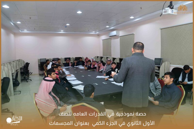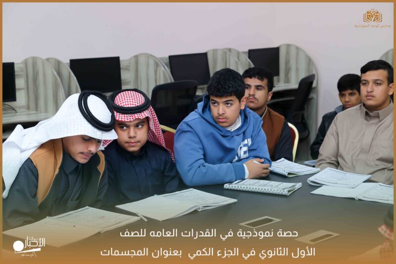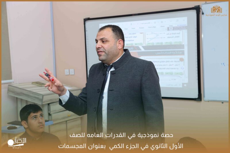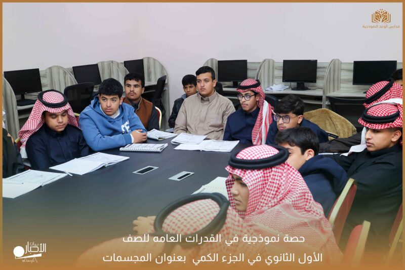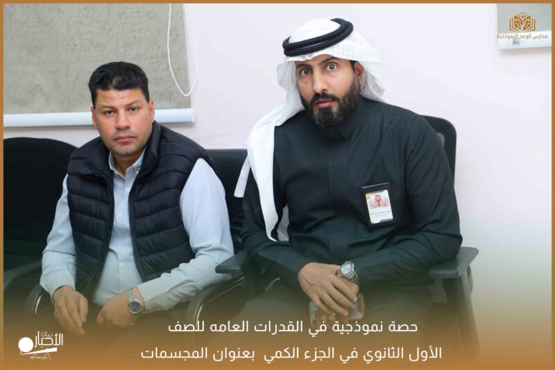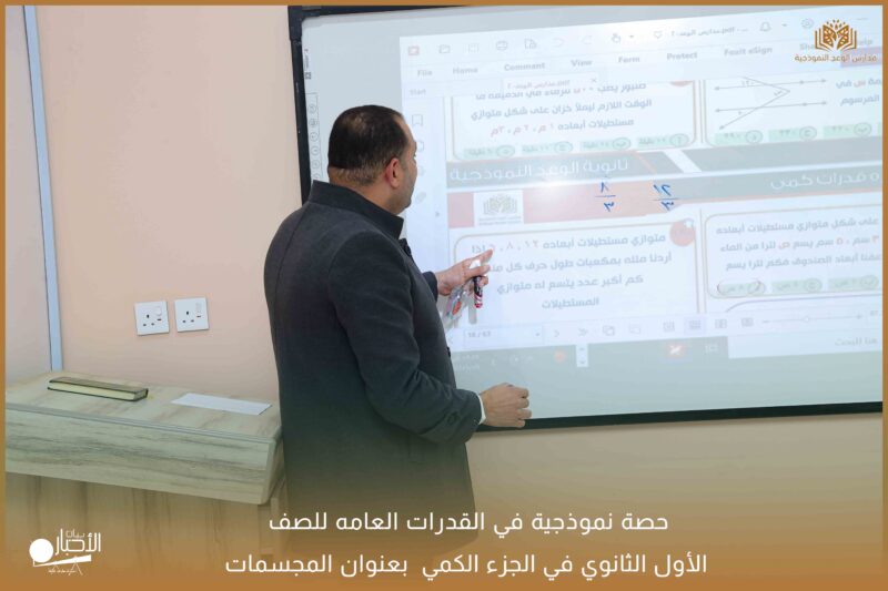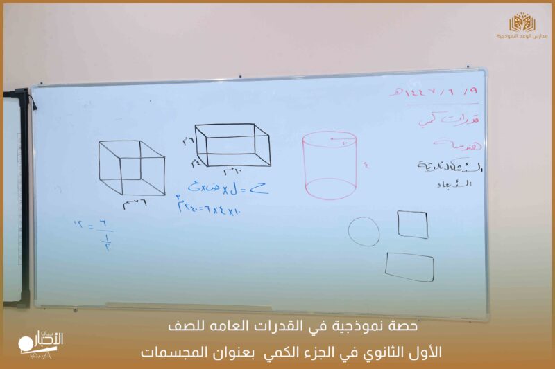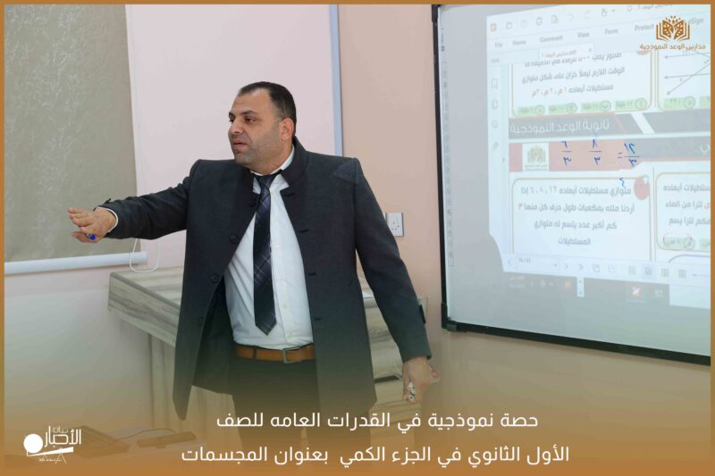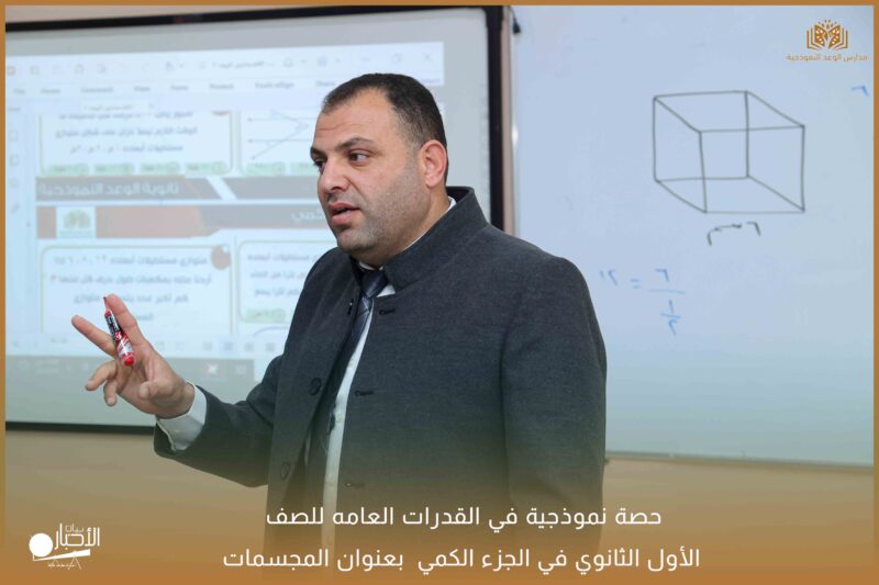 قدمت اليوم مدارس الوعد النموذجية للمرحلة الثانوية حصة نموذجية في القدرات العامه للصف الأول الثانوي في الجزء الكمي كانت بعنوان المجسمات قدم الحصة المعلم أنور إسماعيل في حضور مدير المدرسة الأستاذ عبد الرحمن حمود الرويلي والمشرف الفني الأستاذ محمد سعد.