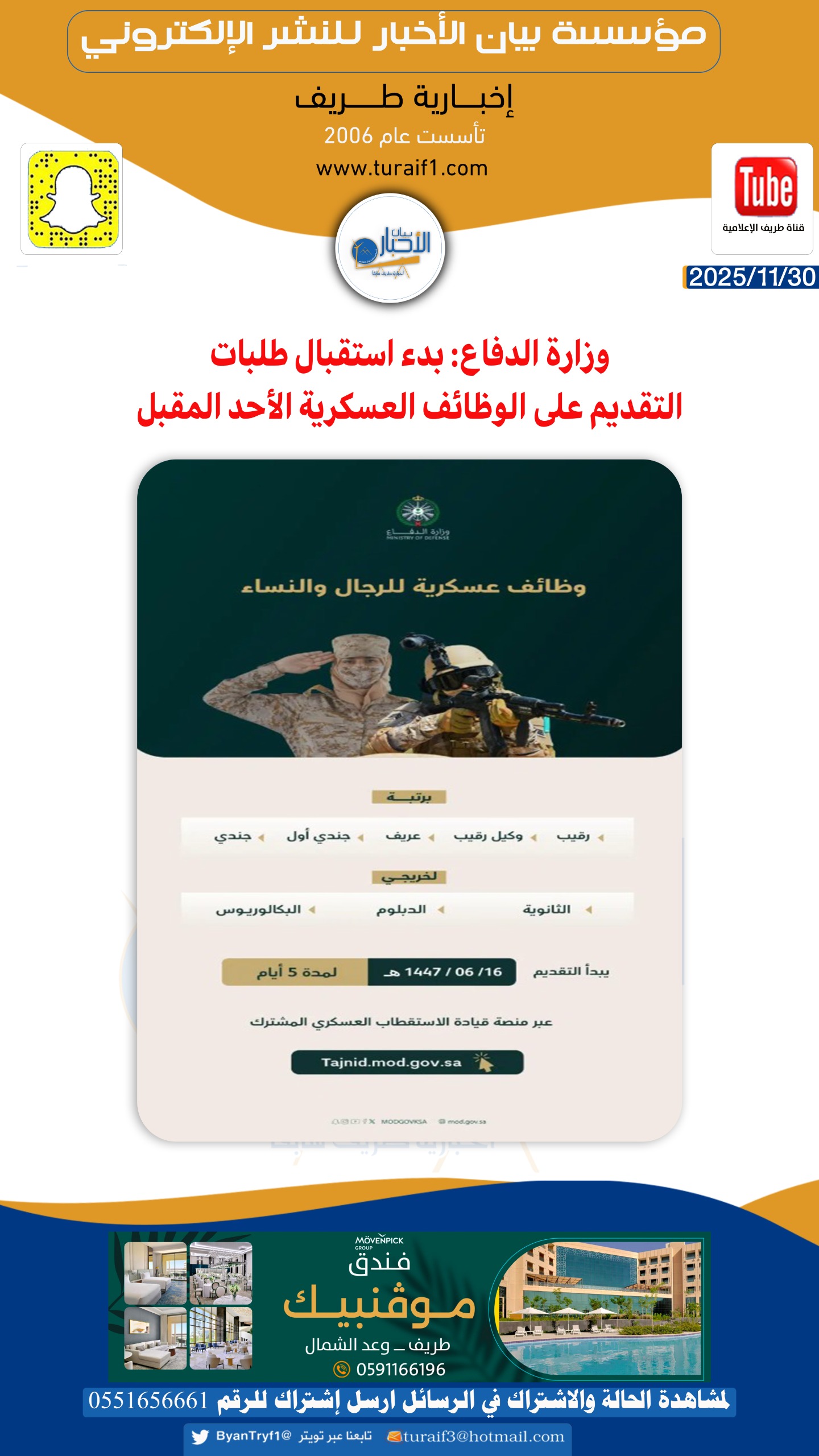 وقالت وزارة الدفاع عبر منصة إكس إن التقديم يكون عبر منصة قيادة الاستقطاب العسكري المشترك: هنا.