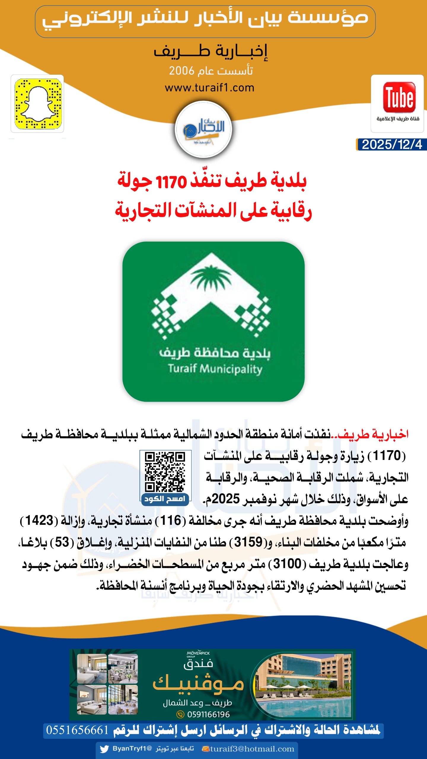 نفّذت أمانة منطقة الحدود الشمالية ممثلة ببلدية محافظة طريف (1170) زيارة وجولة رقابية على المنشآت التجارية، شملت الرقابة الصحية، والرقابة على الأسواق، وذلك خلال شهر نوفمبر 2025م.
