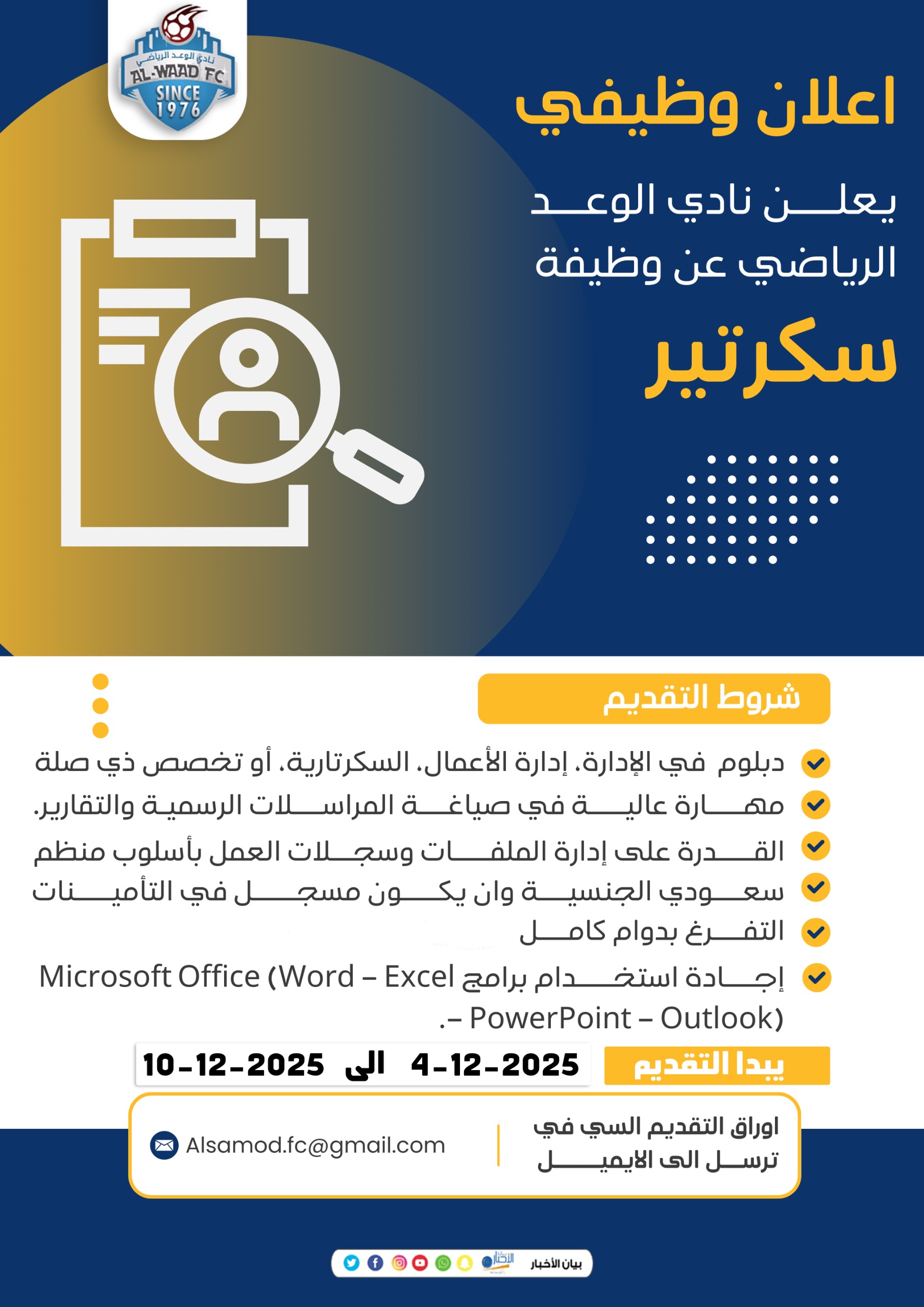 • 05/12/2025 نادي الوعد الرياضي بطريف يعلن عن حاجته لشغل وظيفة سكرتير