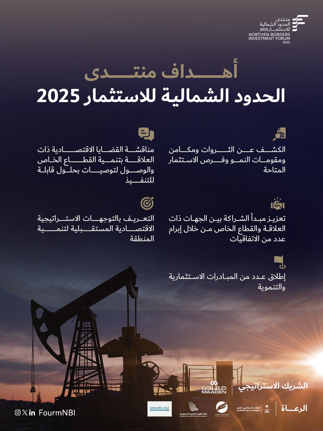 تحت رعايةِ صاحبِ السموِّ الملكي الأمير فيصل بن خالد بن سلطان بن عبدالعزيز، أميرِ منطقةِ الحدود الشمالية، ينطلق منتدى الحدود الشمالية للاستثمار 2025م في 15 ديسمبر الجاري، وذلك في نادي منسوبي وزارة الداخلية بمدينة عرعر، بمشاركة عددٍ من الوزراء والمسؤولين والخبراء والمستشارين وقادة قطاع المال والأعمال في المملكة.