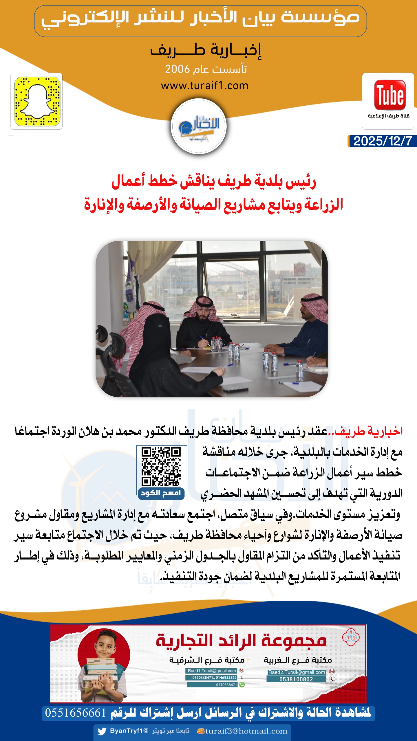 وفي سياق متصل، اجتمع سعادته مع إدارة المشاريع ومقاول مشروع صيانة الأرصفة والإنارة لشوارع وأحياء محافظة طريف، حيث تم خلال الاجتماع متابعة سير تنفيذ الأعمال والتأكد من التزام المقاول بالجدول الزمني والمعايير المطلوبة، وذلك في إطار المتابعة المستمرة للمشاريع البلدية لضمان جودة التنفيذ.