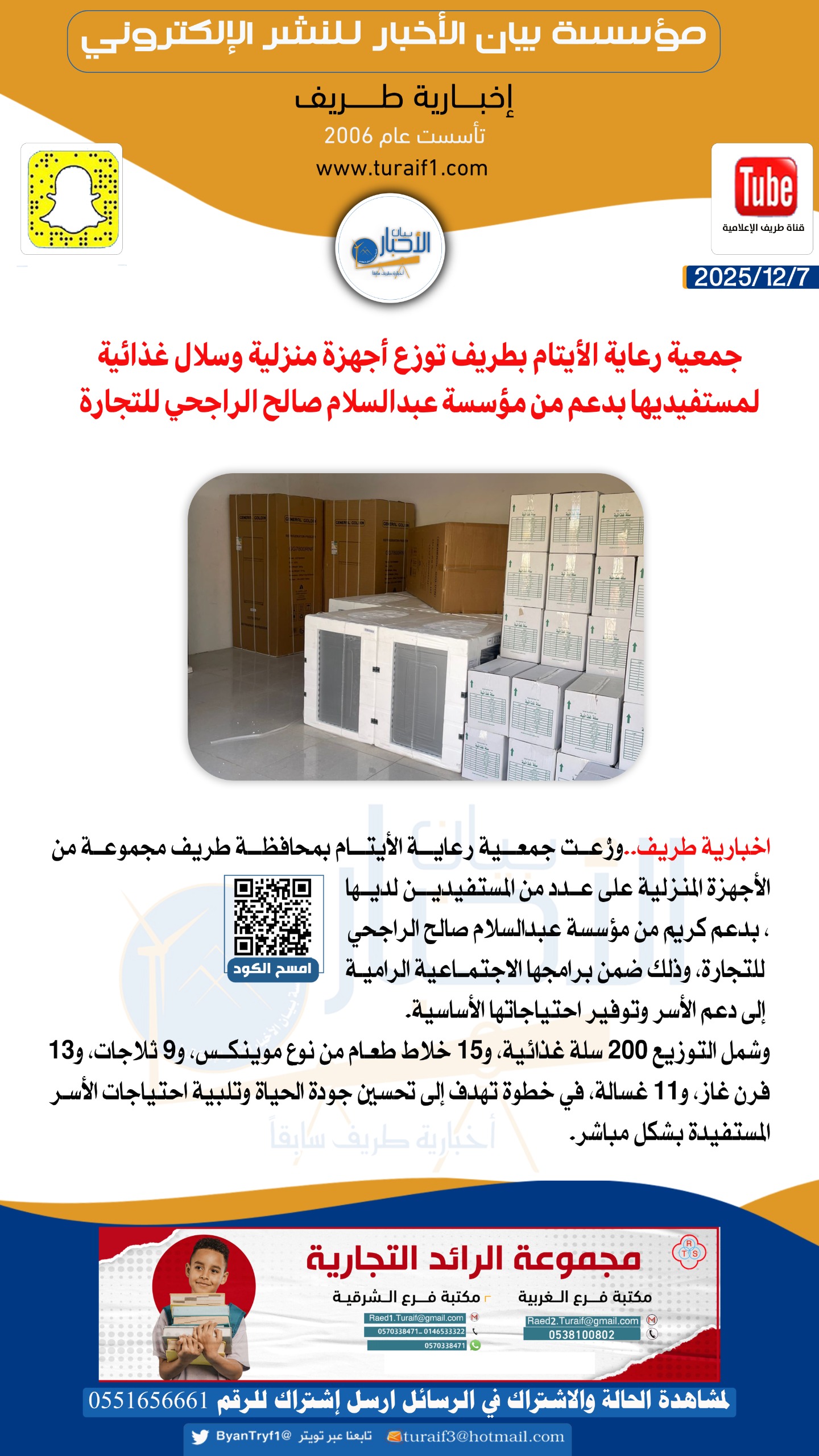 وزّعت جمعية رعاية الأيتام بمحافظة طريف مجموعة من الأجهزة المنزلية على عدد من المستفيدين لديها، بدعم كريم من مؤسسة عبدالسلام صالح الراجحي للتجارة، وذلك ضمن برامجها الاجتماعية الرامية إلى دعم الأسر وتوفير احتياجاتها الأساسية.