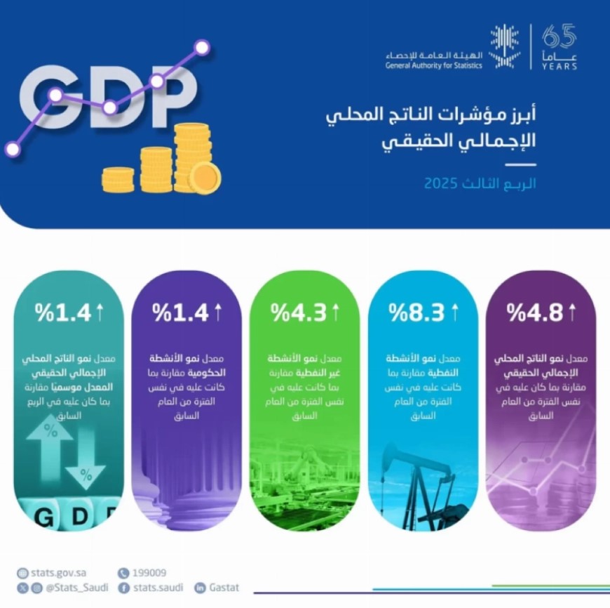 حقق الناتج المحلي الإجمالي الحقيقي للربع الثالث من عام 2025م نموًا بنسبة 4.8% مقارنةً بما كان عليه فيالفترة نفسها من عام 2024.