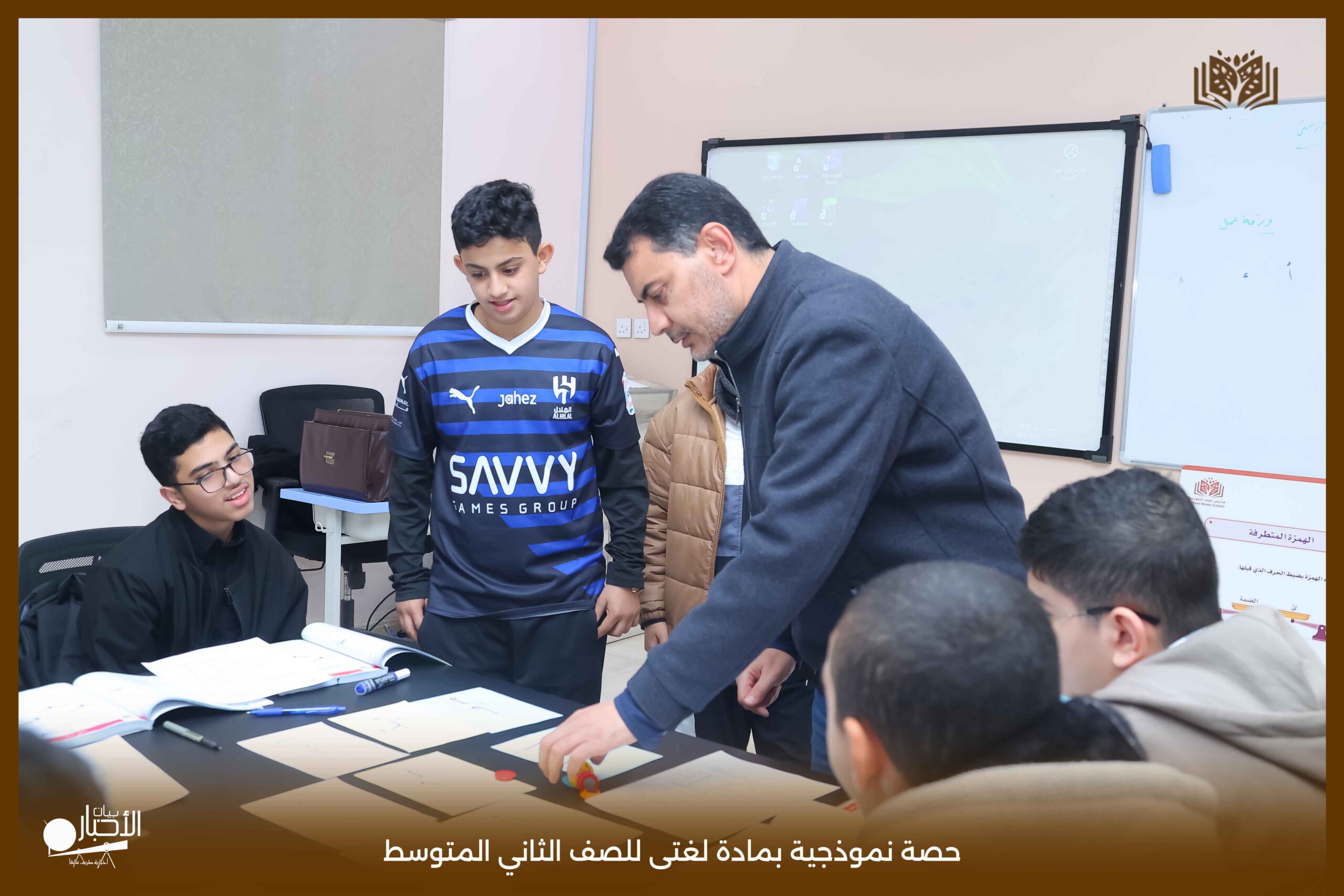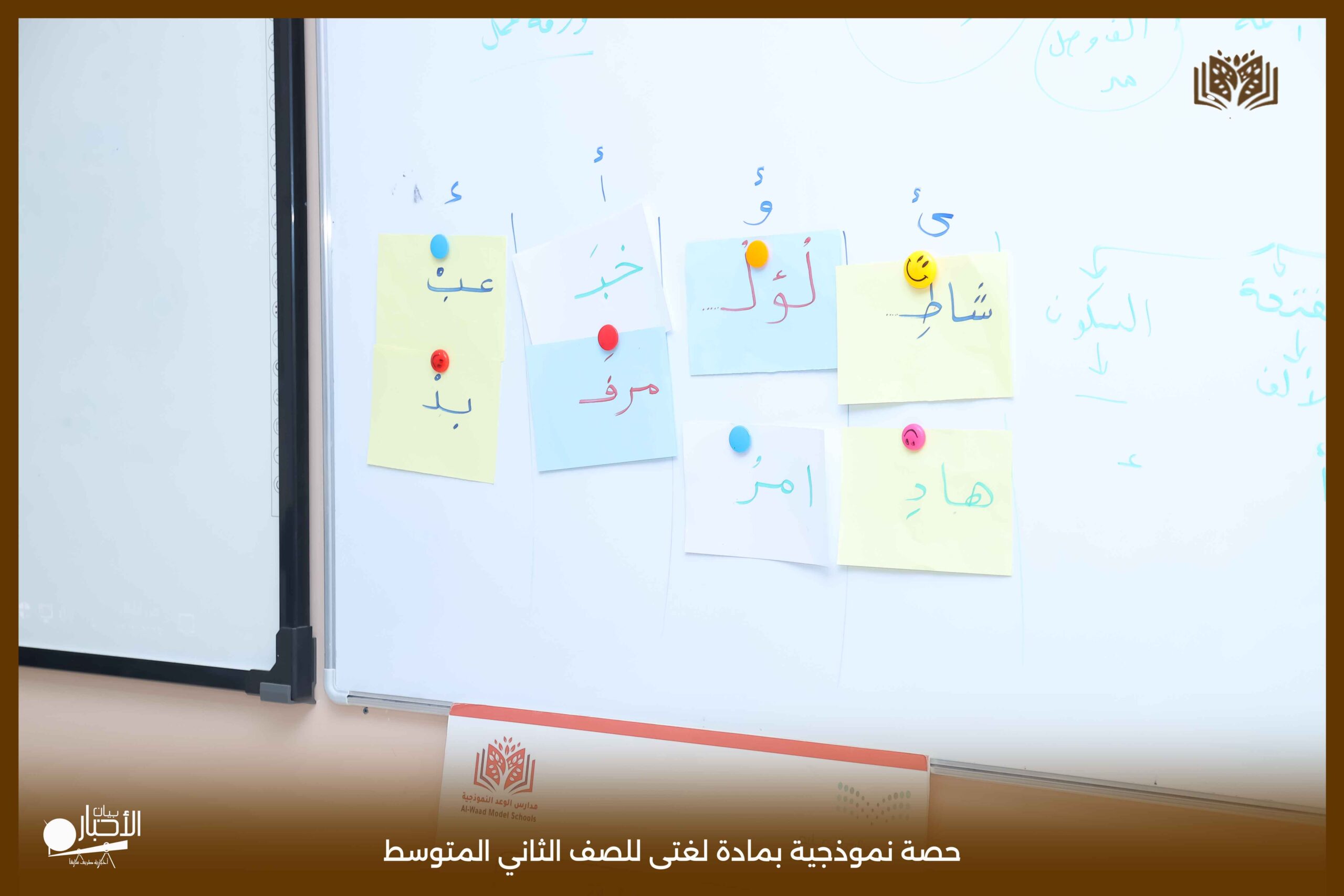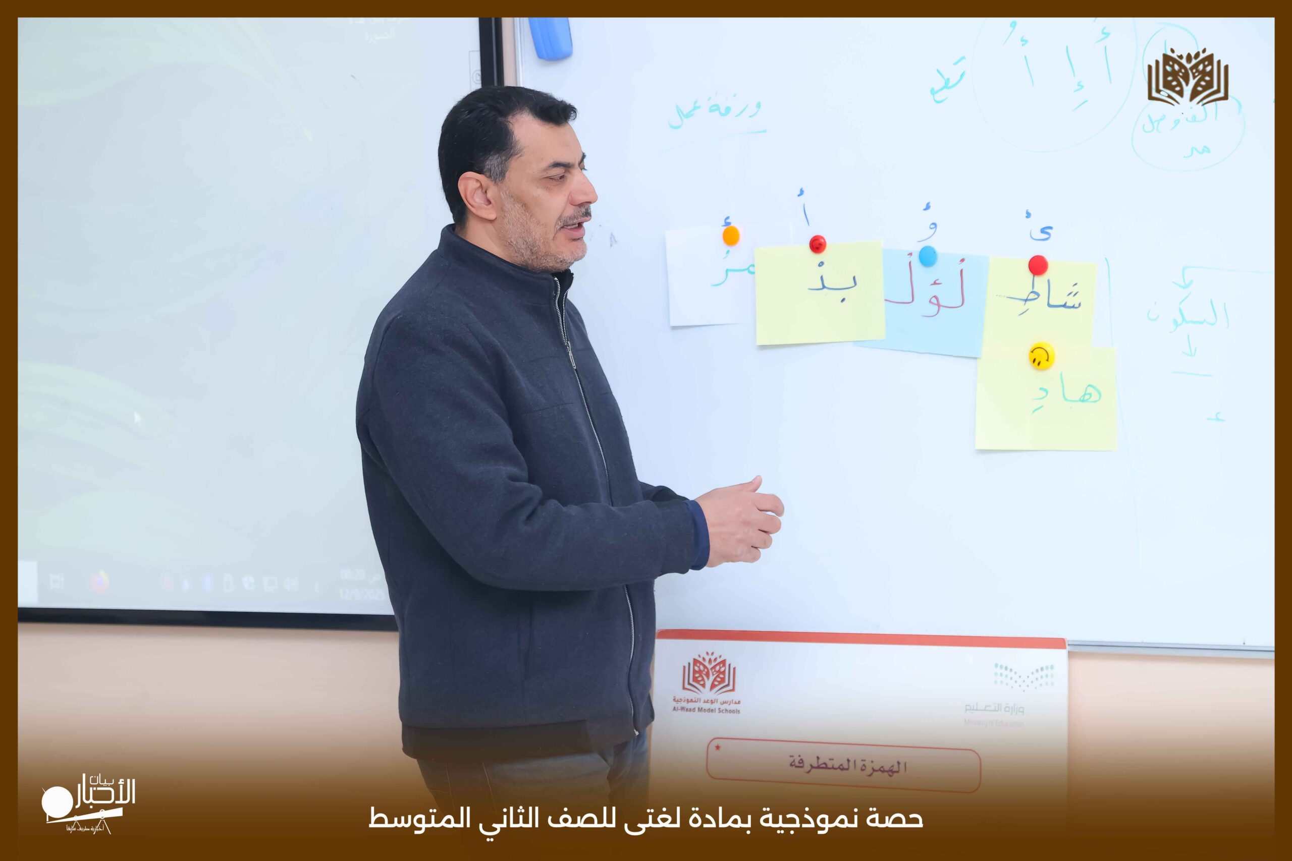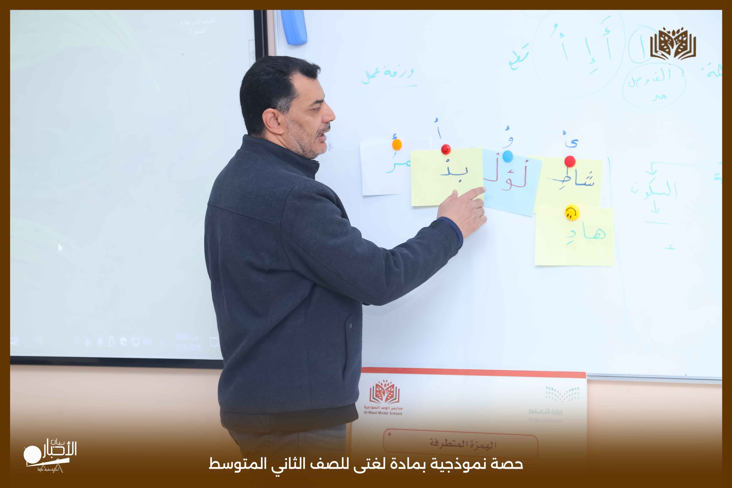 أقامت اليوم الثلاثاء مدارس الوعد النموذجية بمحافظة طريف حصة نموذجية بمادة لغتى للصف الثاني المتوسط بعنوان الرسم الإملائى (الهمزة المتطرفة) حيث عرض المعلم محاور الدرس باستخدام استراتيجيات التعلم النشط من عصف ذهني والنمذجة