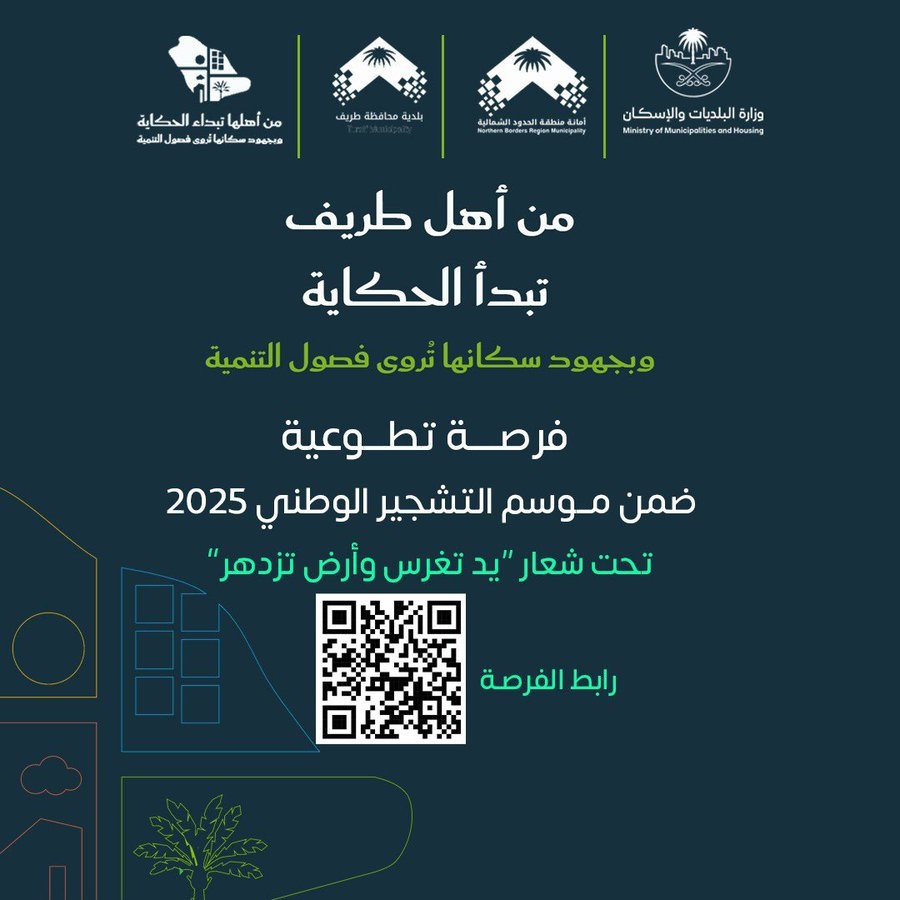 أعلنت بلدية محافظة طريف عن توفير 50 مقعدًا للتطوع في مبادرة لزراعة الأشجار داخل الحدائق والمنتزهات العامة، وذلك ضمن فعاليات موسم التشجير الوطني 2025 الذي ينطلق هذا العام تحت شعار “يد تغرس وأرض تزدهر”.