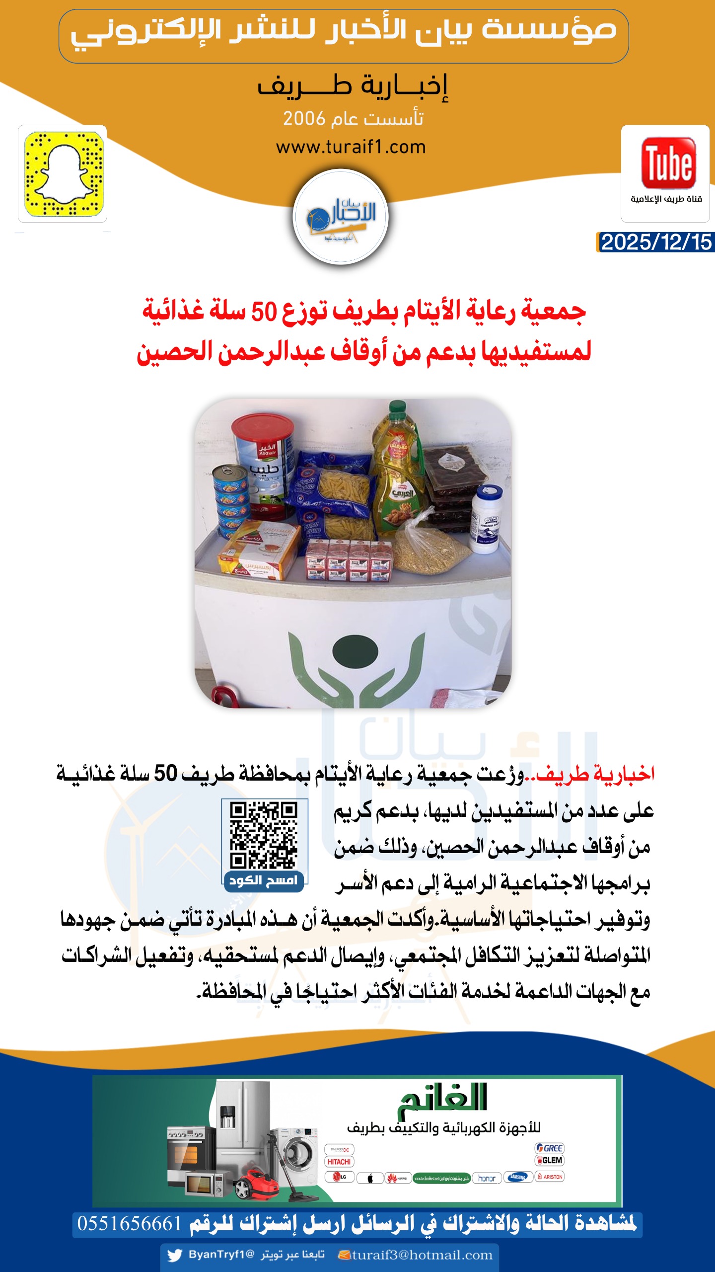 وزّعت جمعية رعاية الأيتام بمحافظة طريف 50 سلة غذائية على عدد من المستفيدين لديها، بدعم كريم من أوقاف عبدالرحمن الحصين، وذلك ضمن برامجها الاجتماعية الرامية إلى دعم الأسر وتوفير احتياجاتها الأساسية.