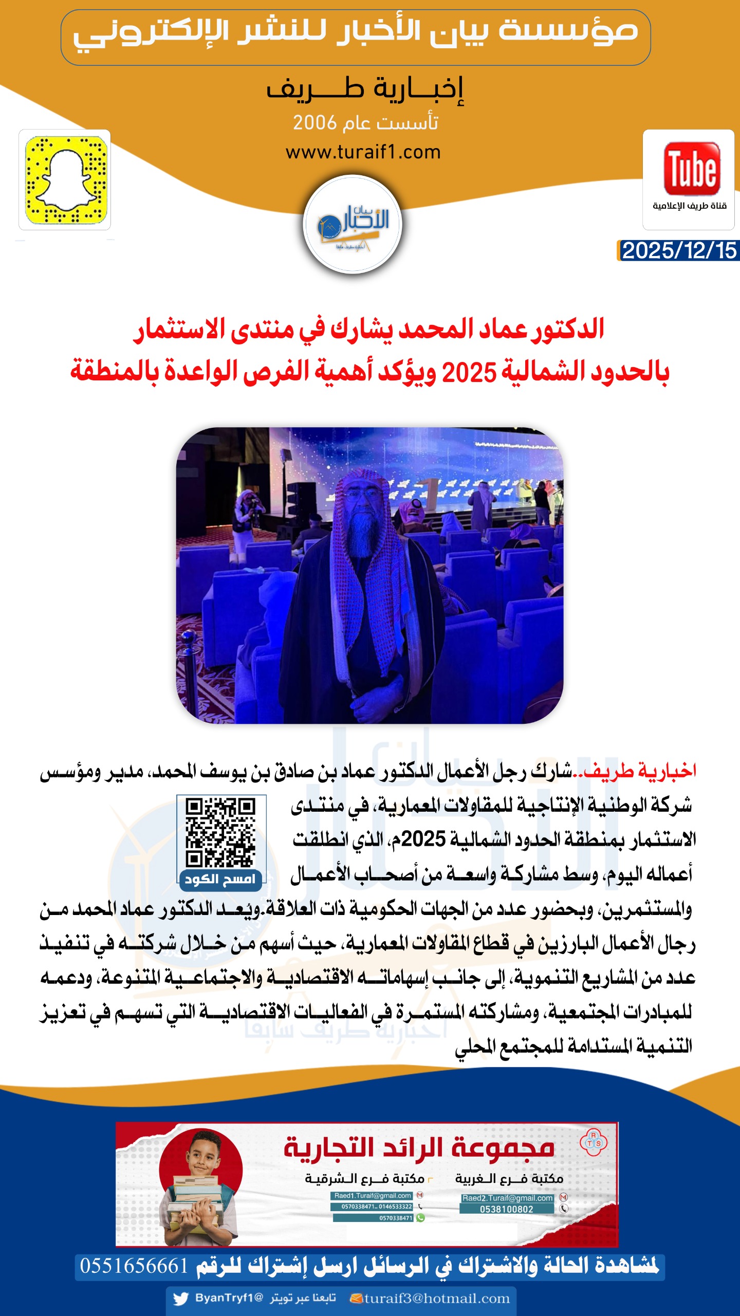 شارك رجل الأعمال الدكتور عماد بن صادق بن يوسف المحمد، مدير ومؤسس شركة الوطنية الإنتاجية للمقاولات المعمارية، في منتدى الاستثمار بمنطقة الحدود الشمالية 2025م، الذي انطلقت أعماله اليوم، وسط مشاركة واسعة من أصحاب الأعمال والمستثمرين، وبحضور عدد من الجهات الحكومية ذات العلاقة.